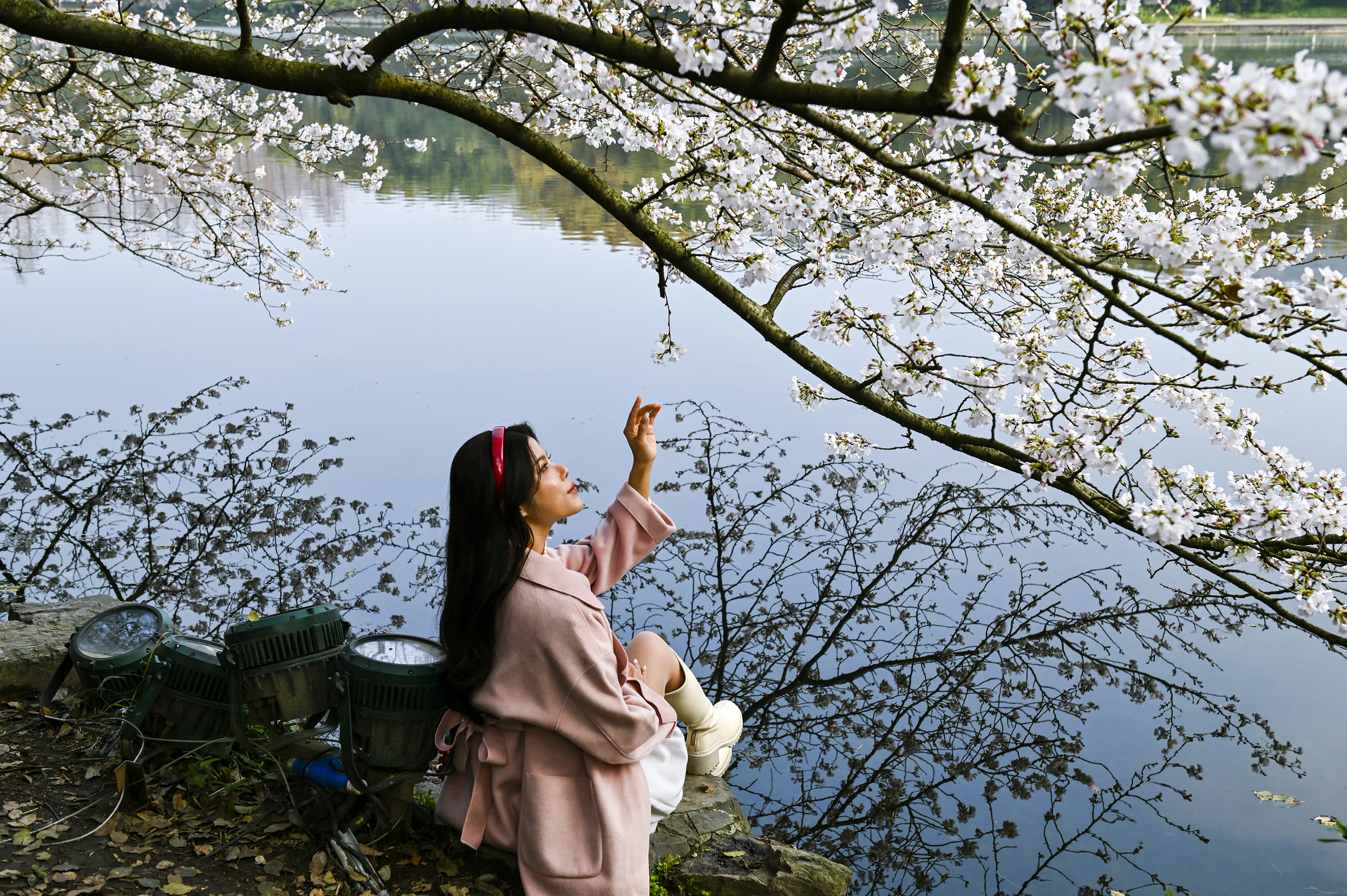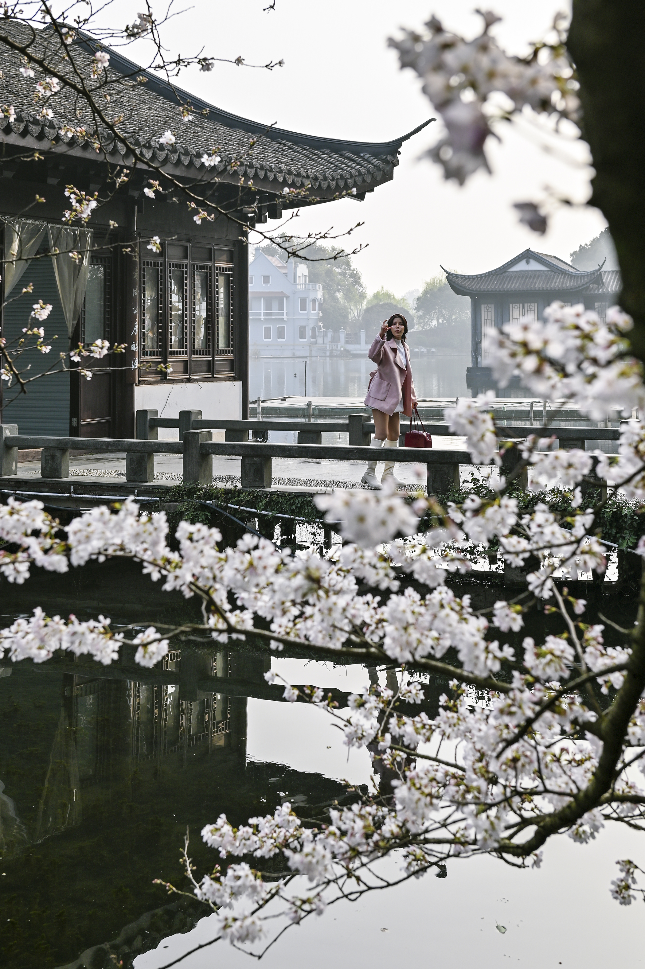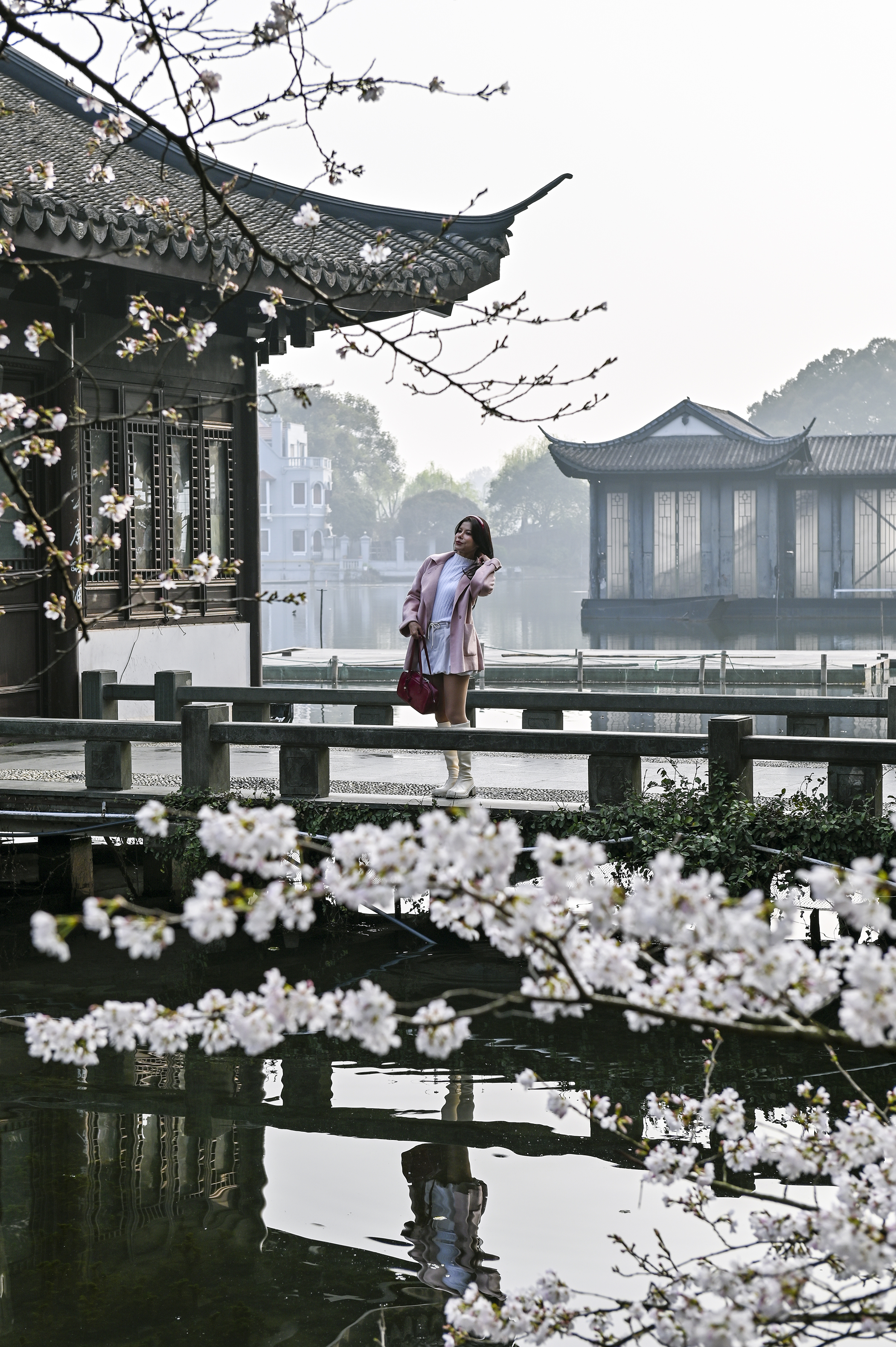 曲园风荷樱花盛开,美女纷纷打卡蹭花容,樱花浮水,古亭倒影,长裙轻曳,花容月貌西湖春色撩人。