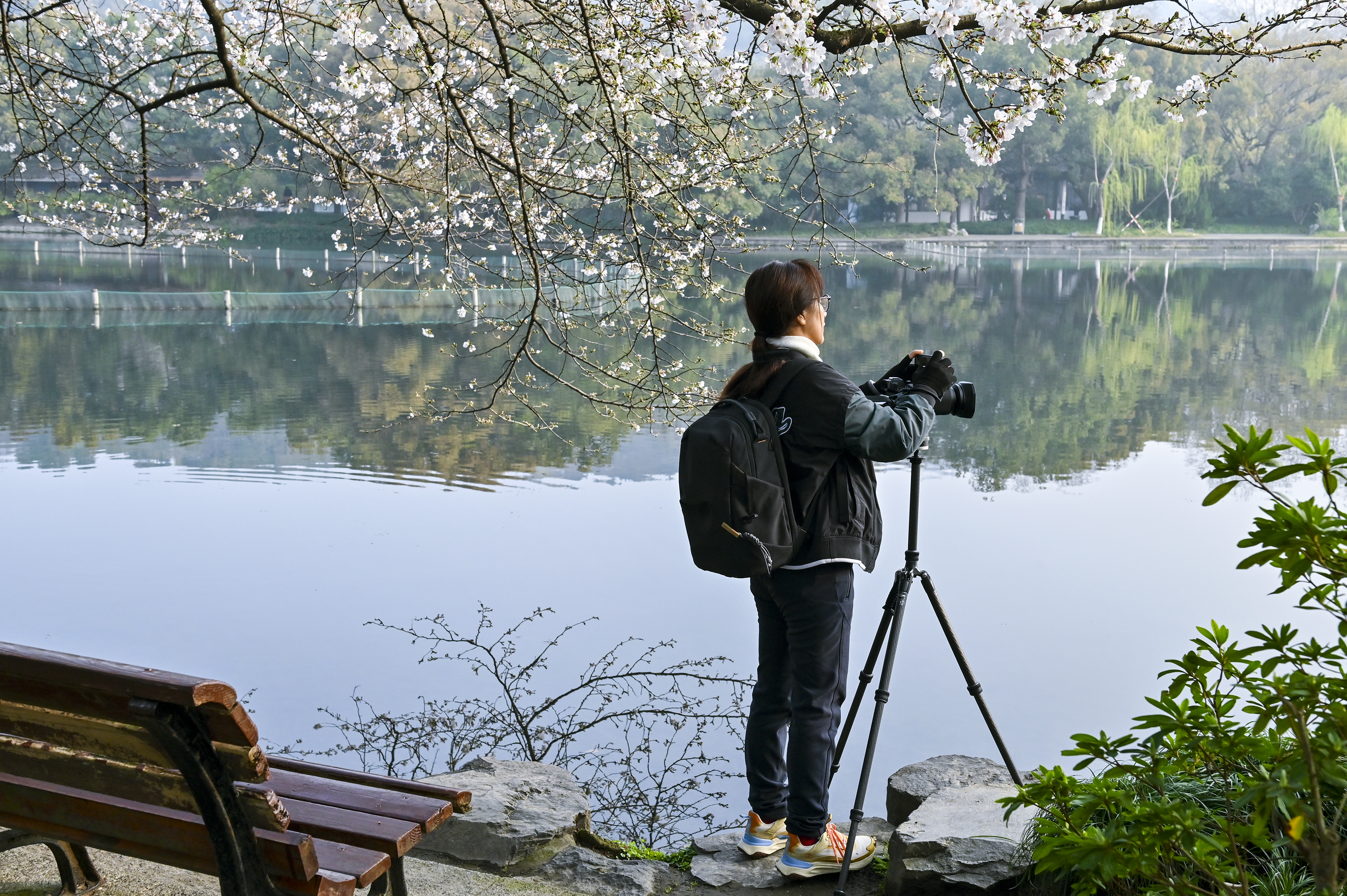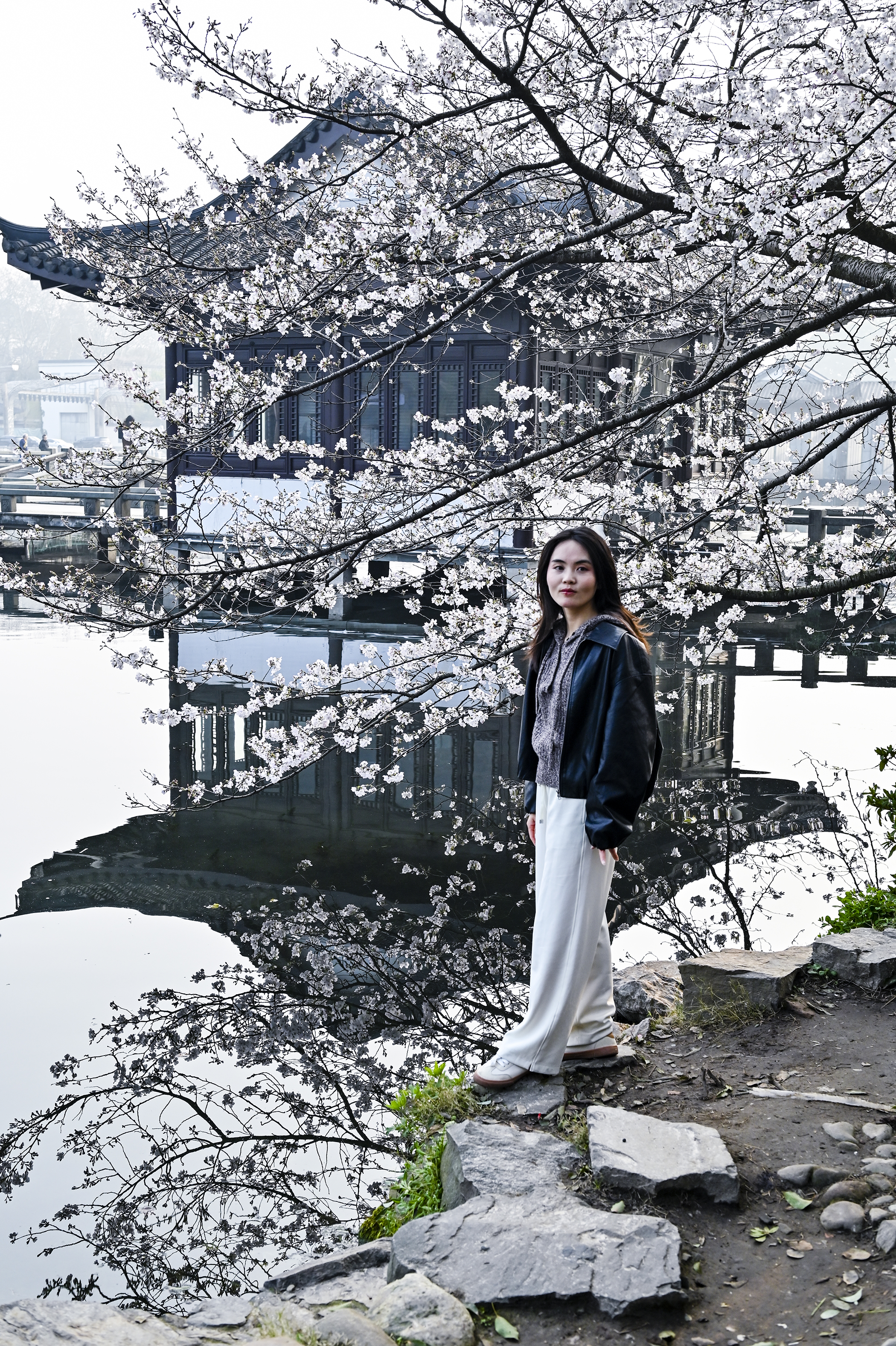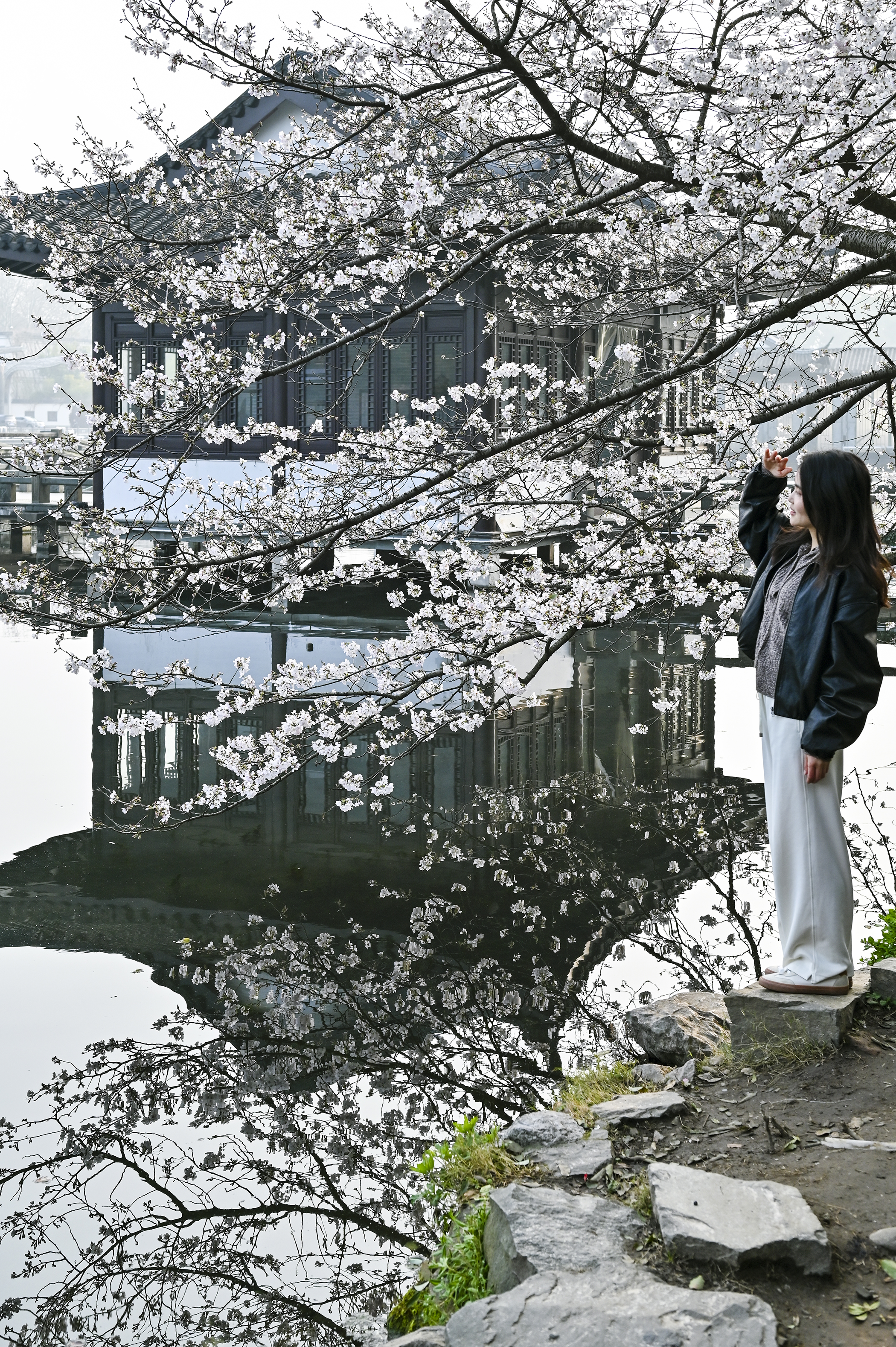 曲园风荷樱花盛开,美女纷纷打卡蹭花容,樱花浮水,古亭倒影,长裙轻曳,花容月貌西湖春色撩人。