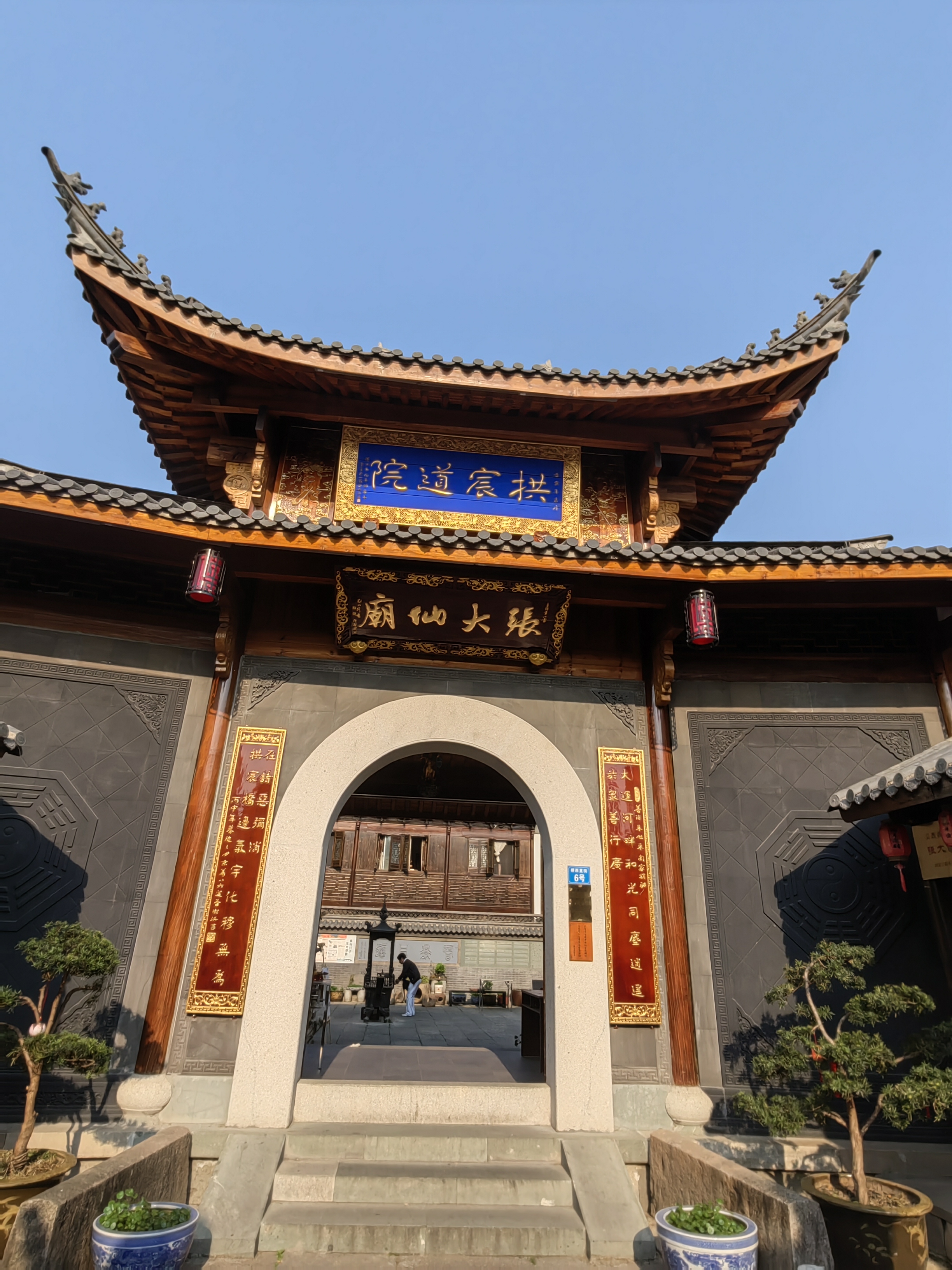 拱宸道院随手拍,蓝底金字牌匾配红灯笼,飞檐翘角下,一帧江南古韵~