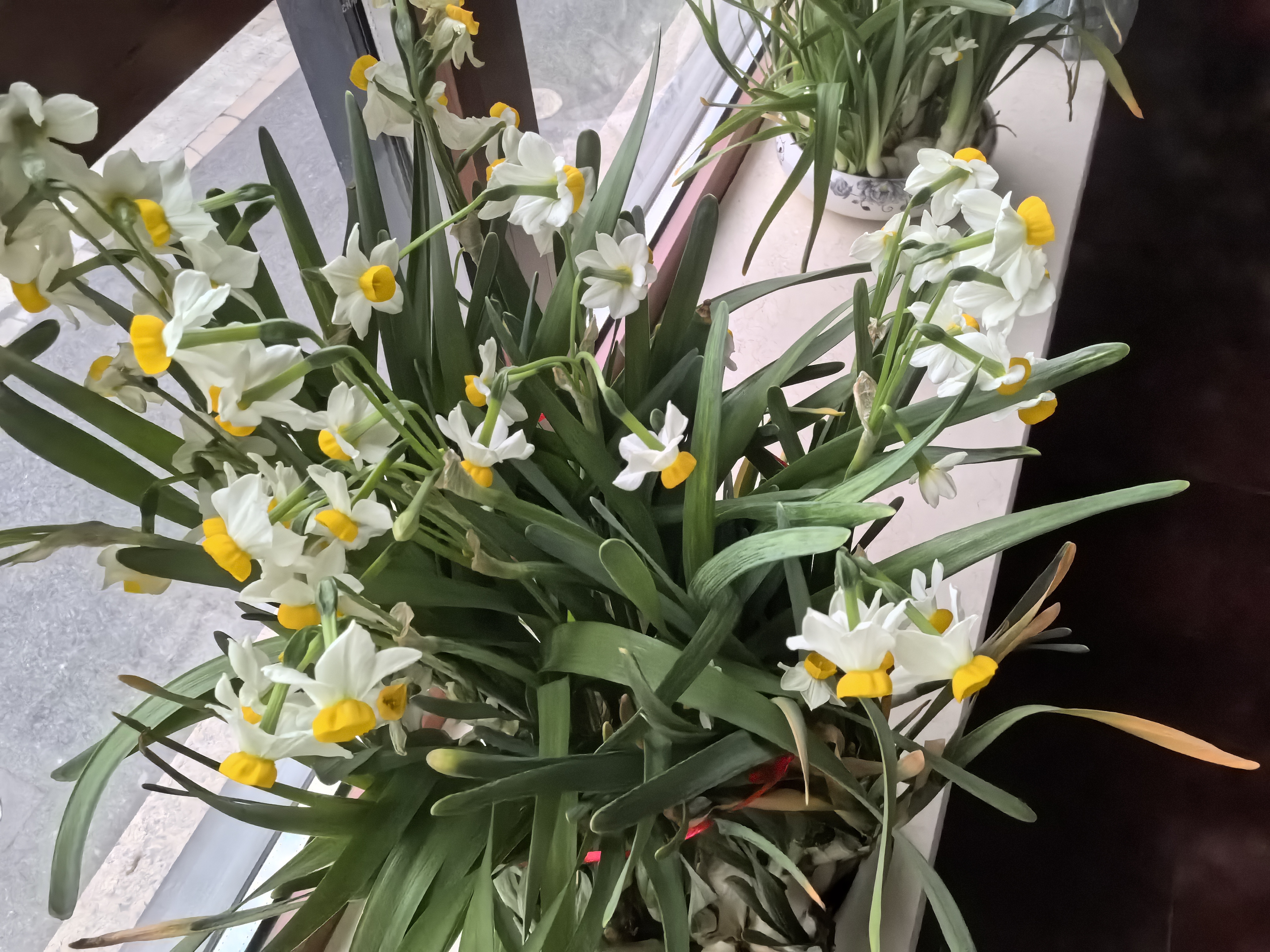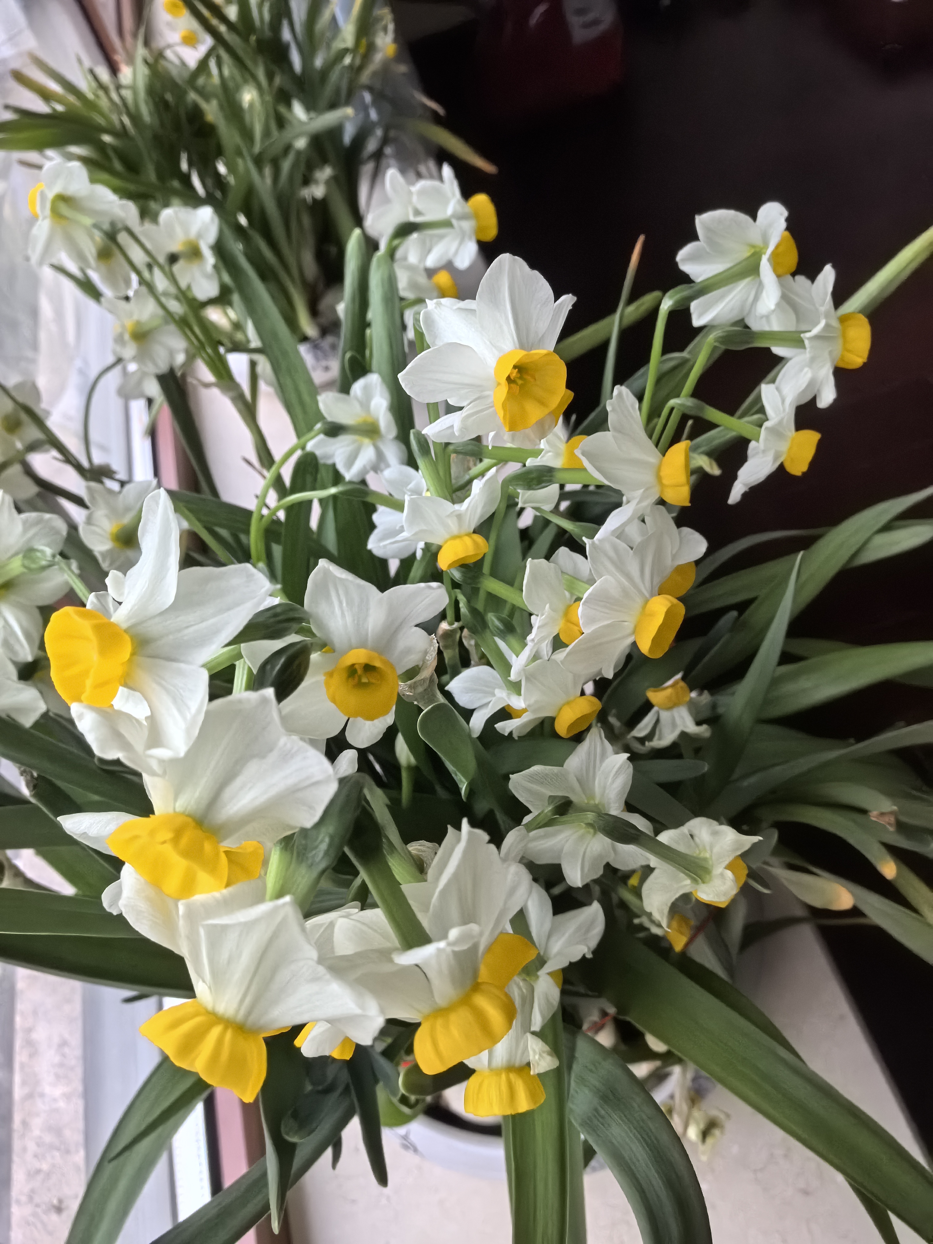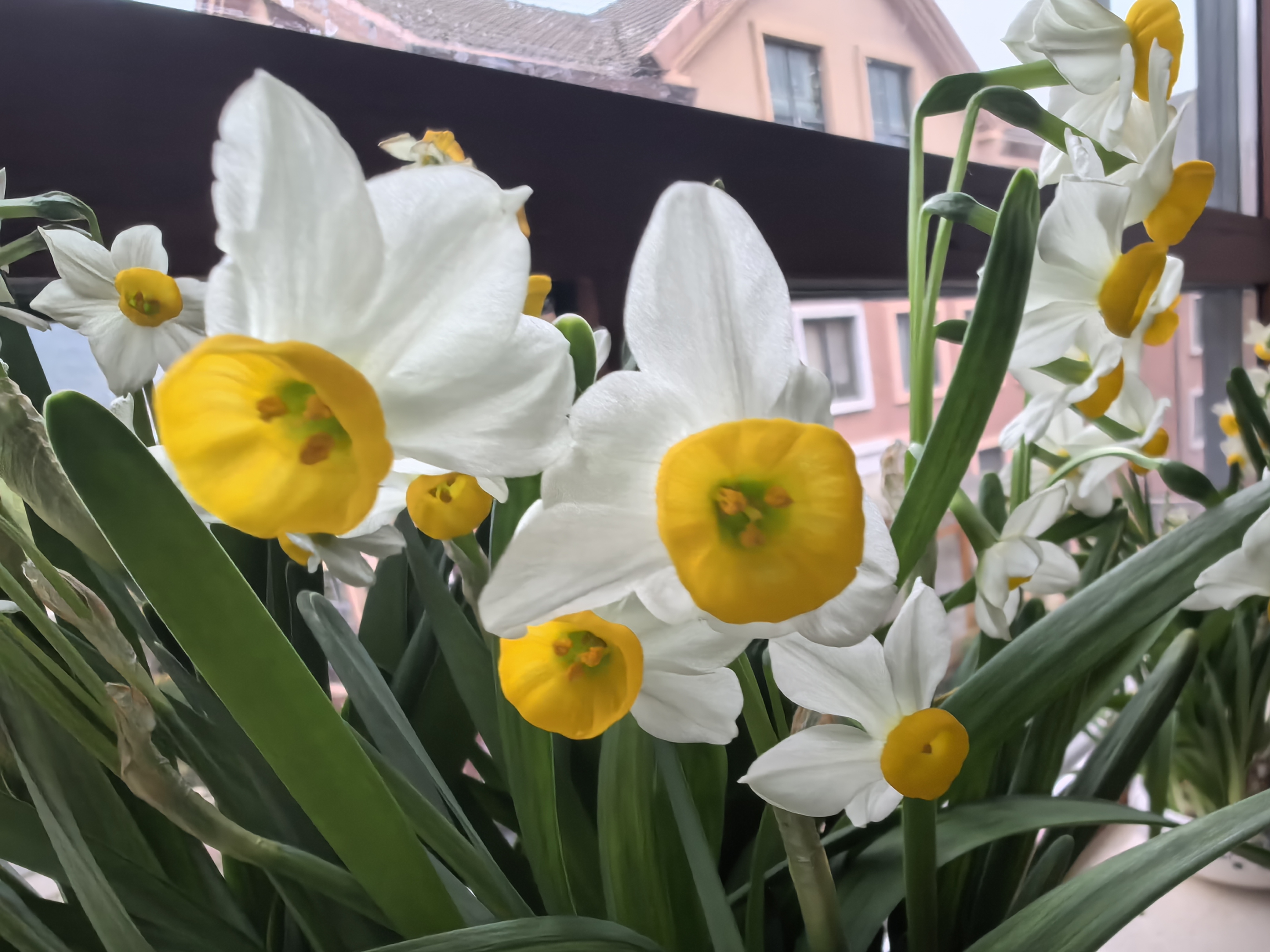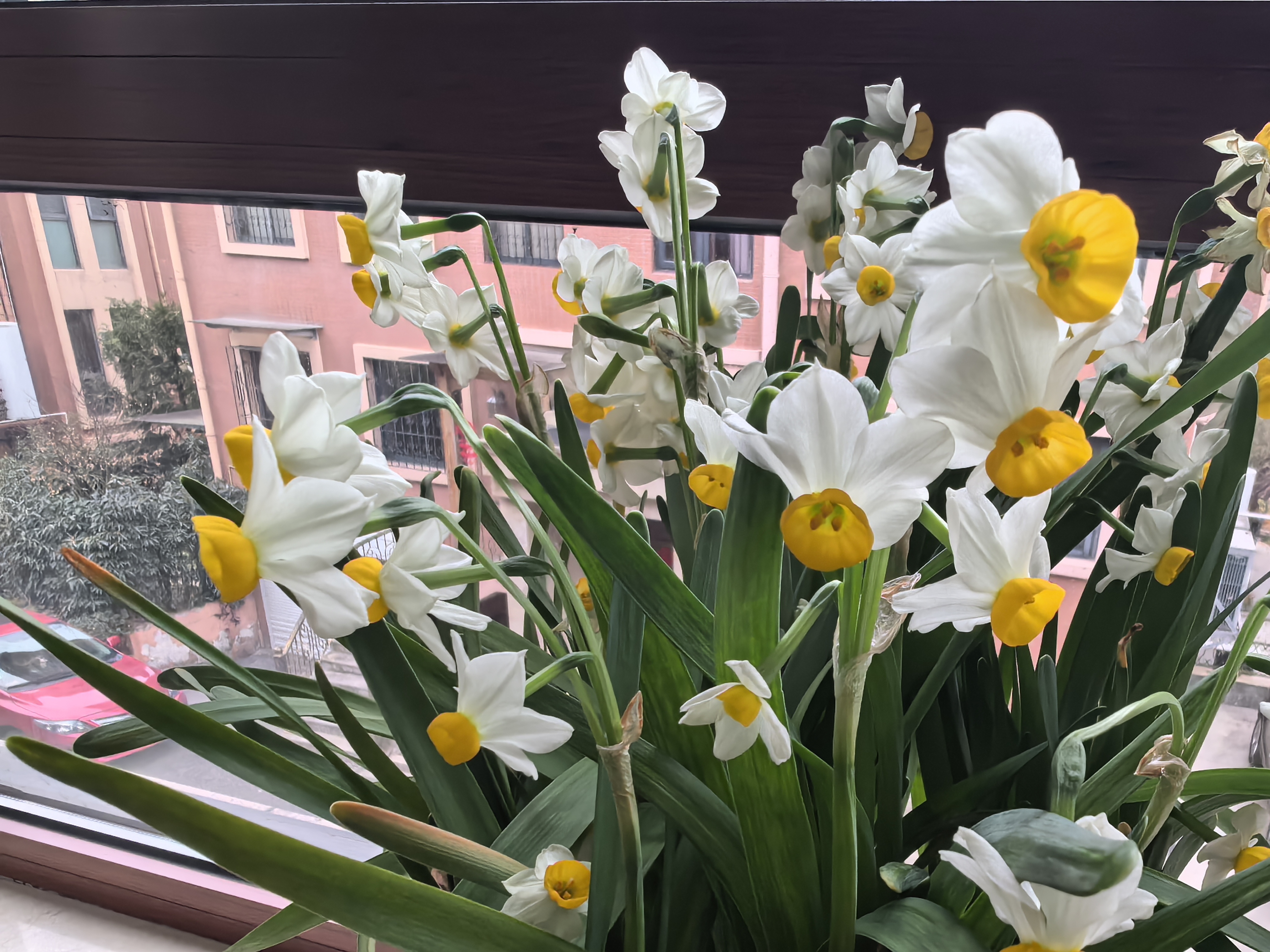 窗台水仙开啦~白瓣黄冠绿叶,阳光一照,春日气息扑面而来!