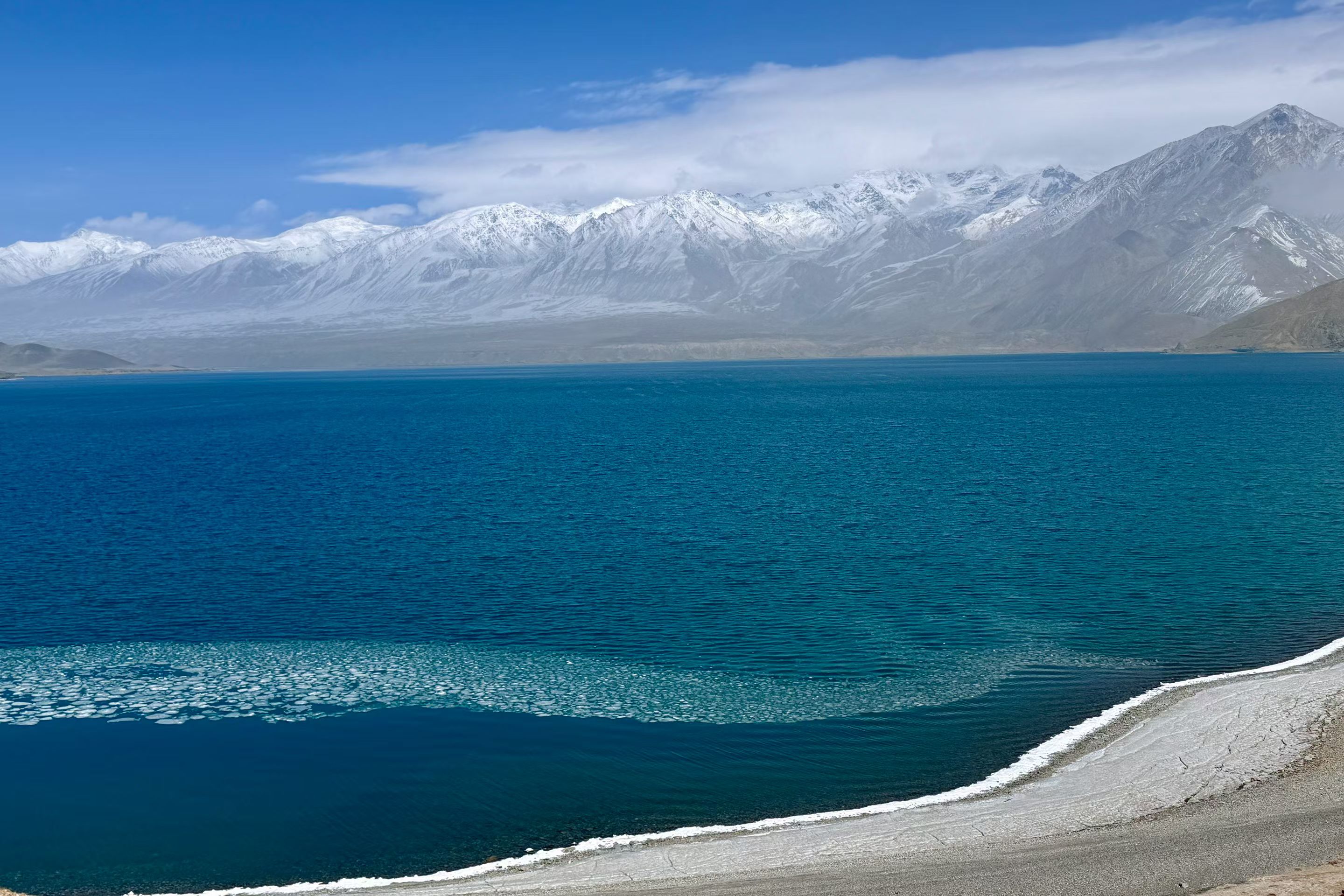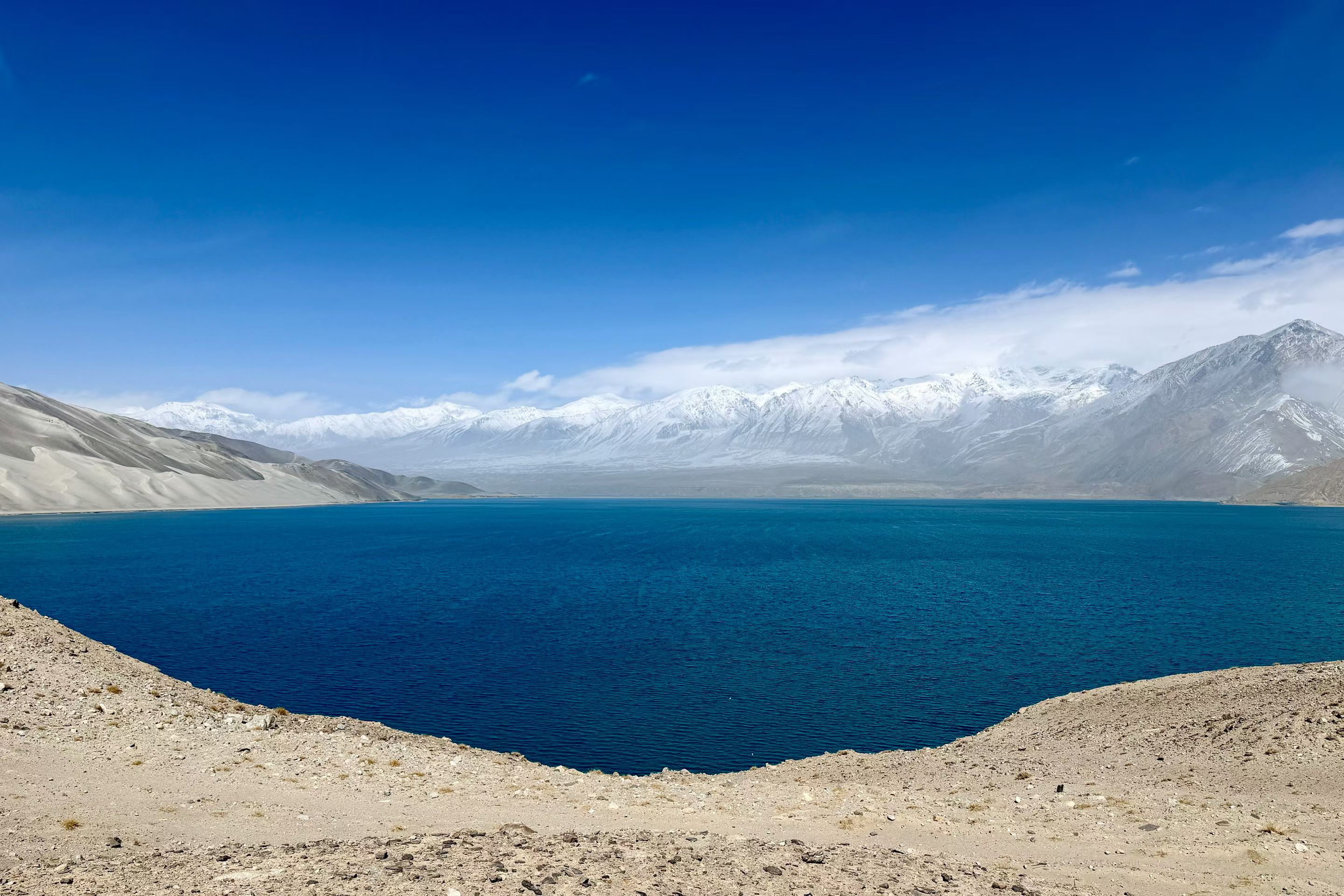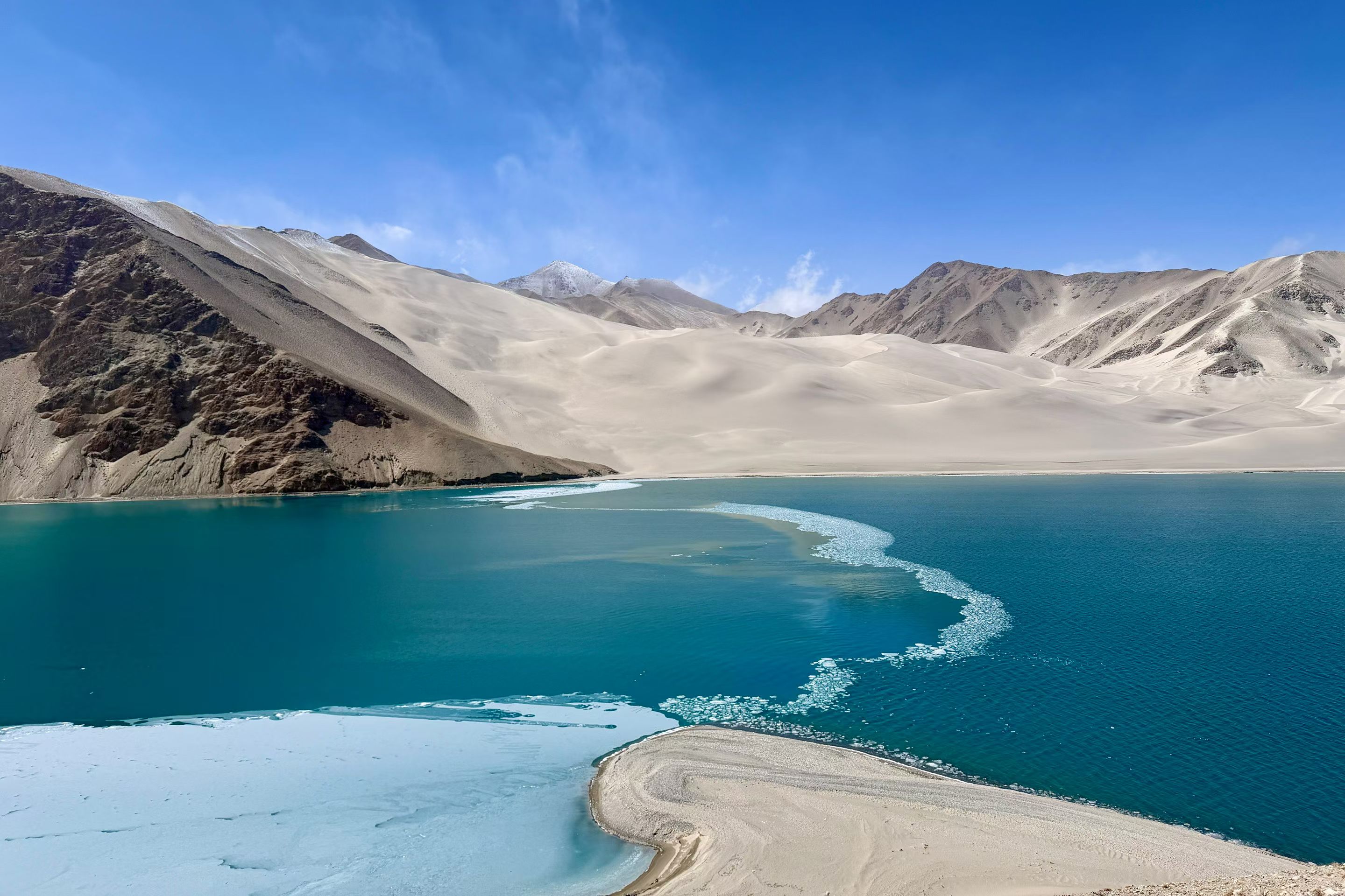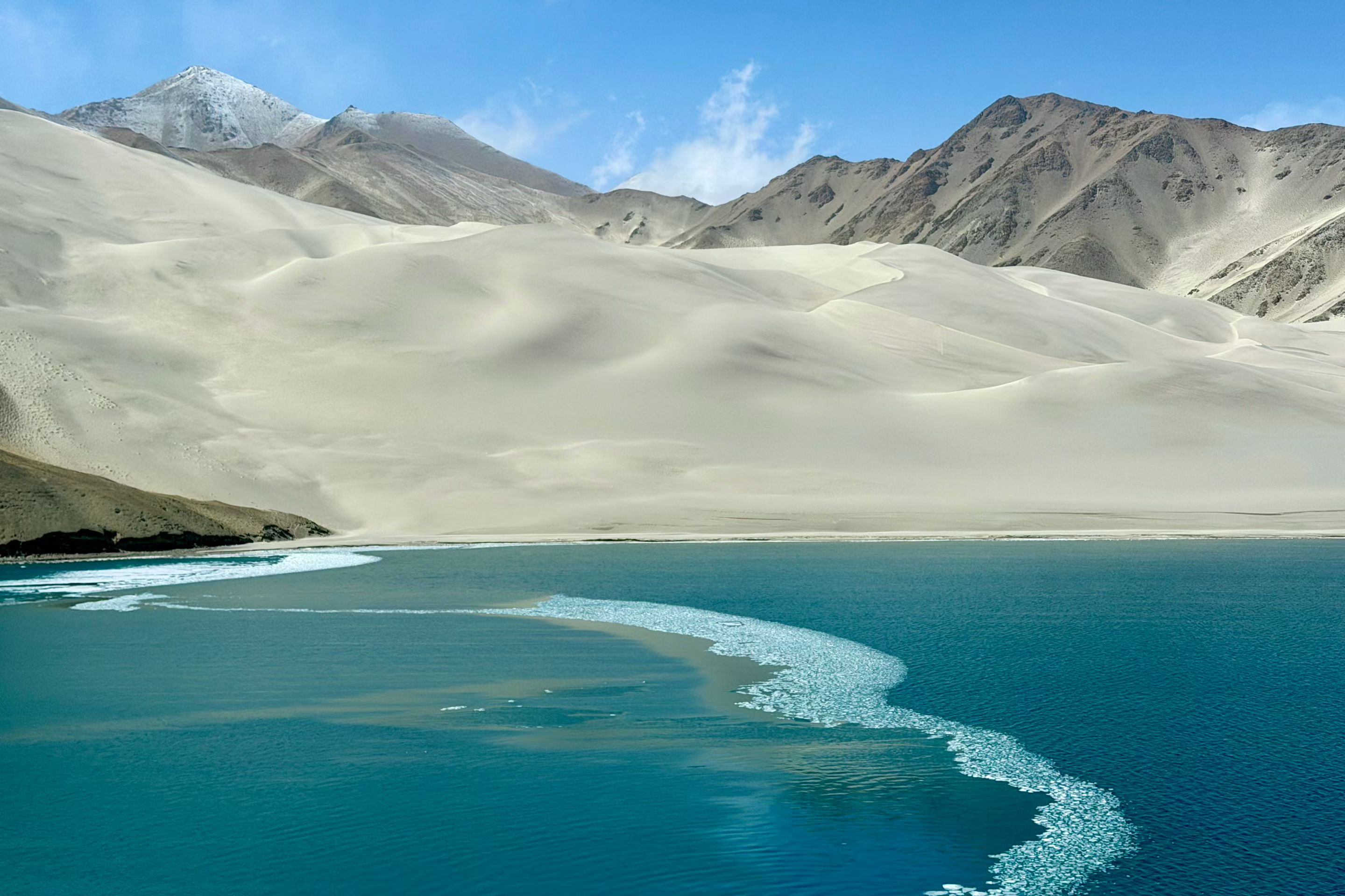 帕米尔白沙湖,静卧于帕米尔高原东缘,海拔3300米的高寒湖泊,澄明如镜。湖水源于昆仑冰川,湛蓝清透,宛如碧玉镶嵌高原;湖畔银白沙山绵延,细腻如雪,与远处皑皑雪峰交相辉映。背倚公格尔九别峰,远眺慕士塔格峰,集雪山、沙山、湖泊于一体。这里曾是丝路古道要冲,如今被誉为“帕米尔高原上的澄澈仙居”,是追寻高原秘境、感悟丝路遗韵的必至之地。#帕米尔高原#白沙湖 #新疆旅游 #南疆