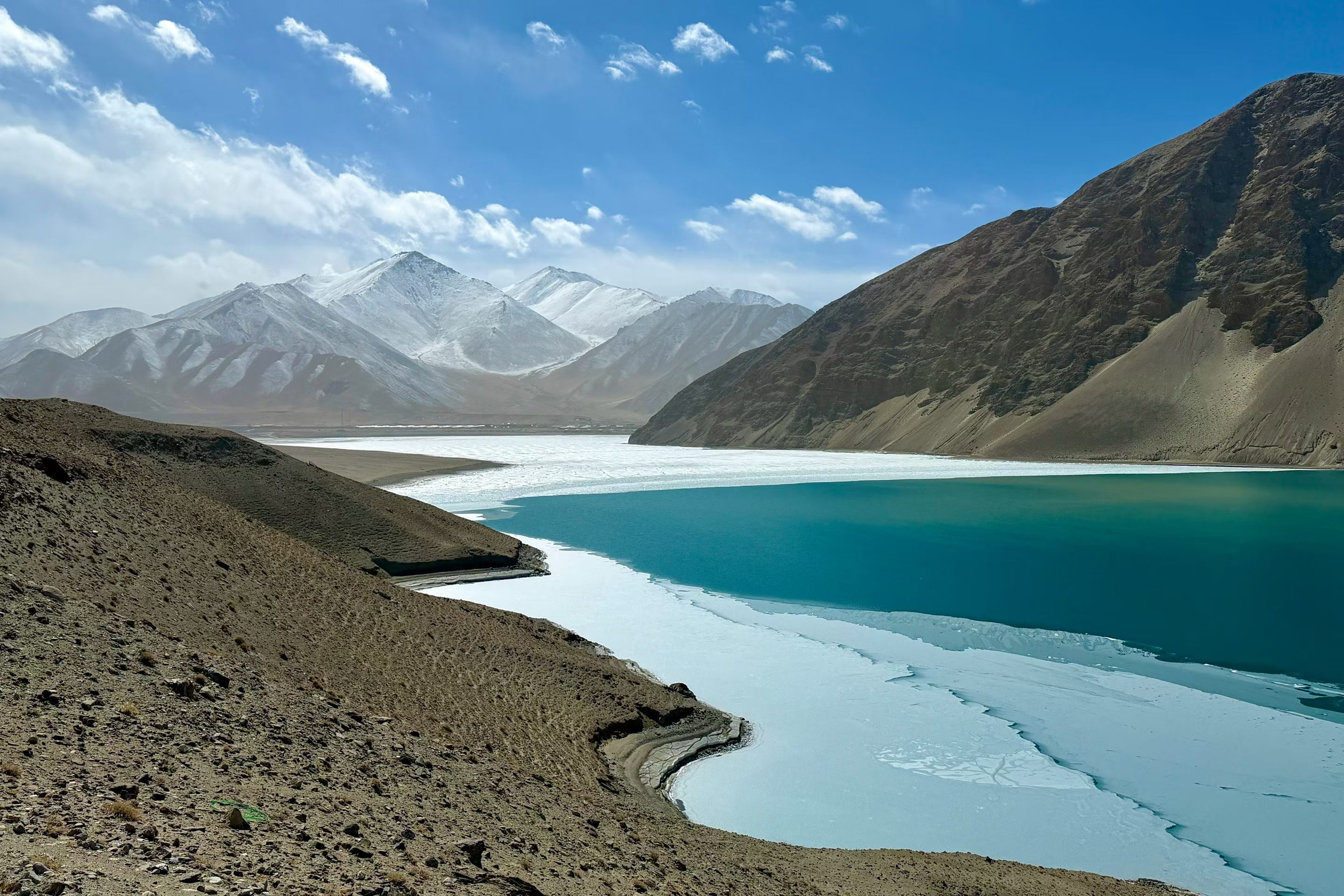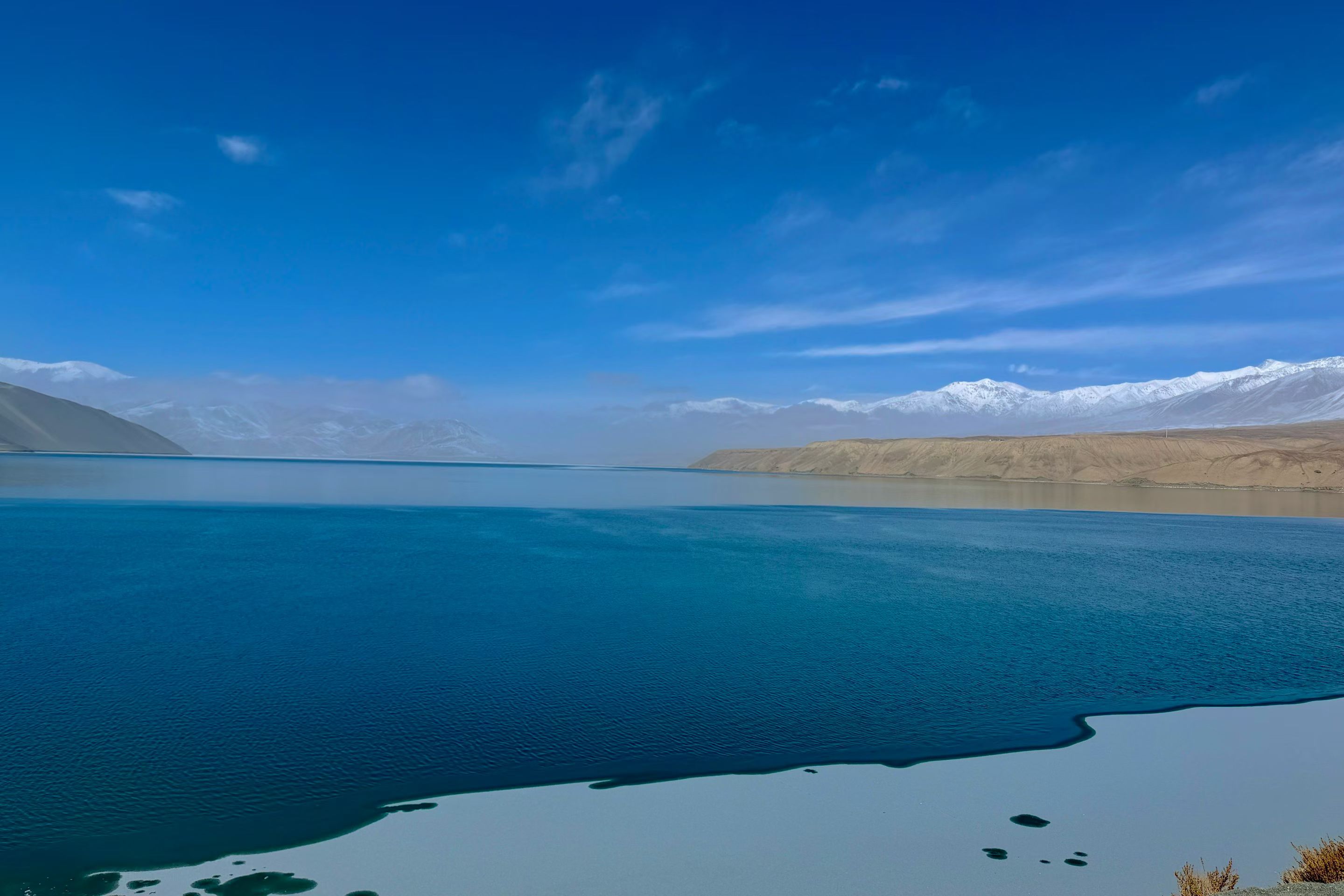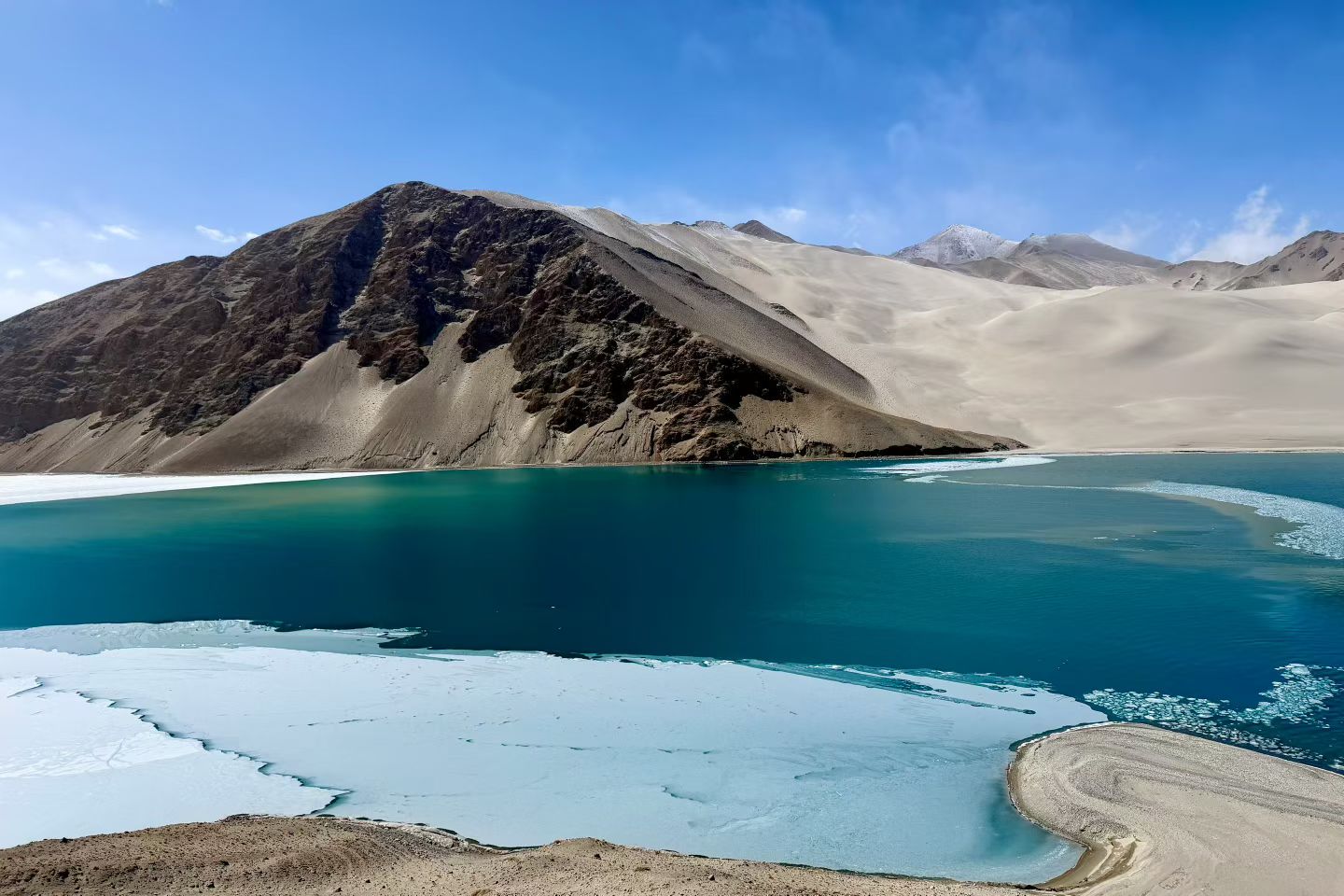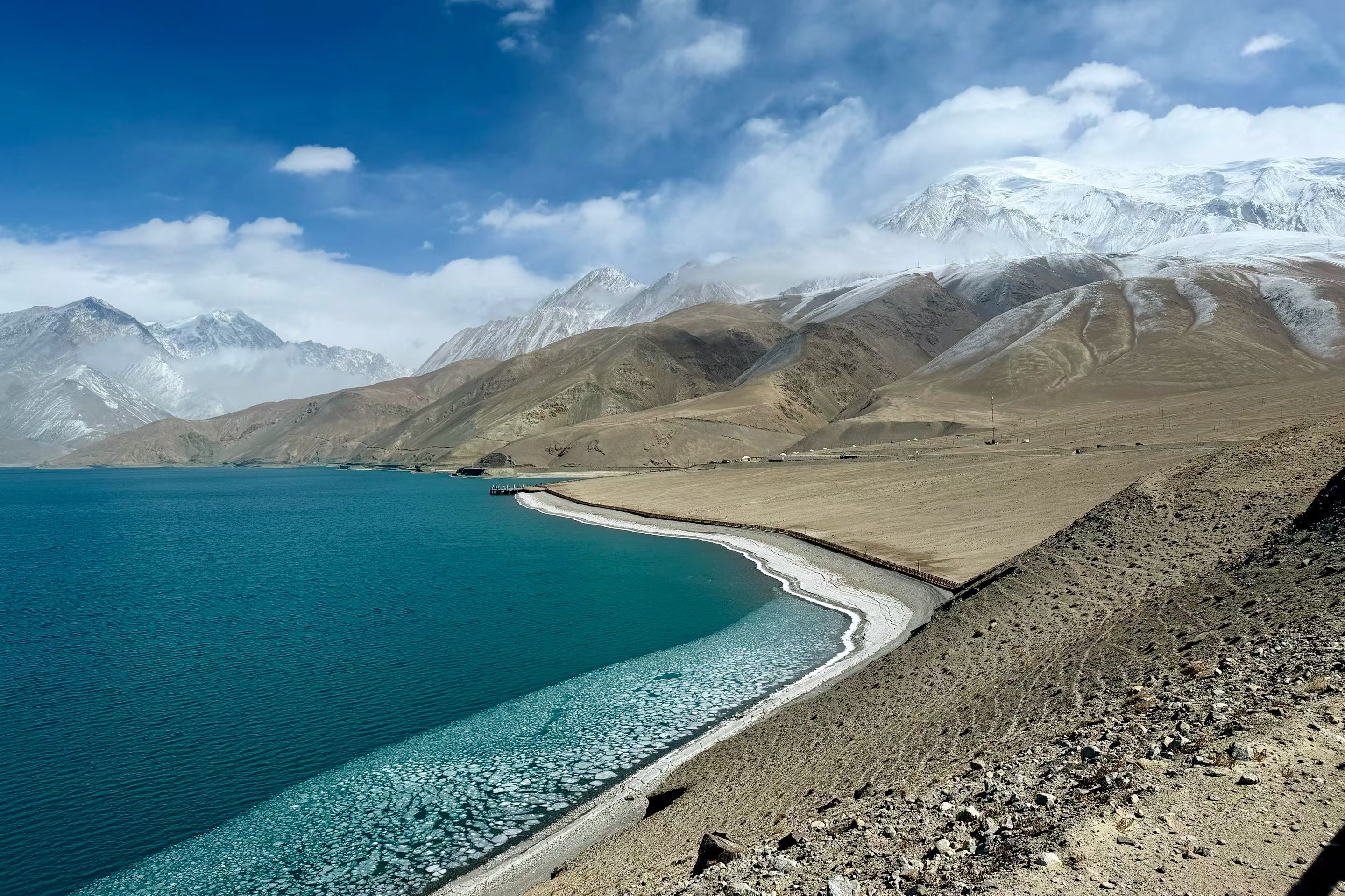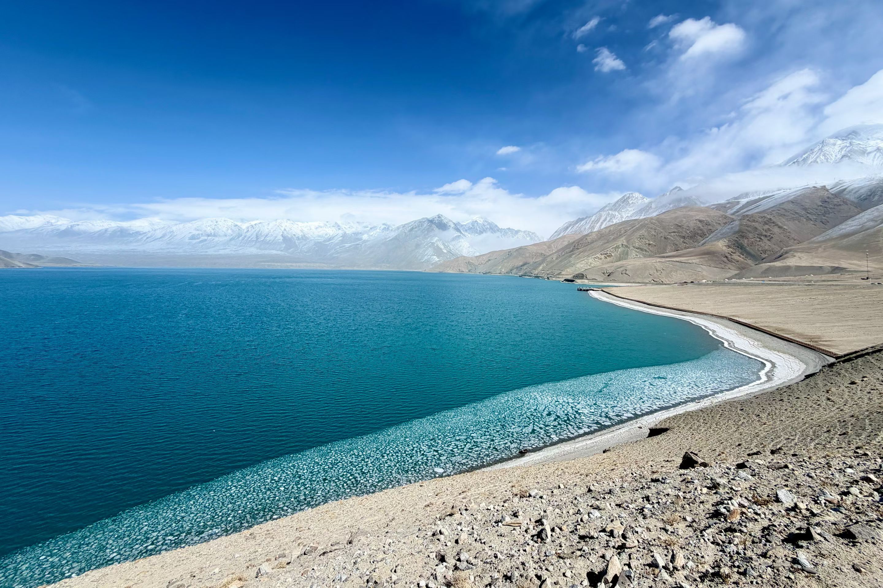 帕米尔白沙湖,静卧于帕米尔高原东缘,海拔3300米的高寒湖泊,澄明如镜。湖水源于昆仑冰川,湛蓝清透,宛如碧玉镶嵌高原;湖畔银白沙山绵延,细腻如雪,与远处皑皑雪峰交相辉映。背倚公格尔九别峰,远眺慕士塔格峰,集雪山、沙山、湖泊于一体。这里曾是丝路古道要冲,如今被誉为“帕米尔高原上的澄澈仙居”,是追寻高原秘境、感悟丝路遗韵的必至之地。#帕米尔高原#白沙湖 #新疆旅游 #南疆