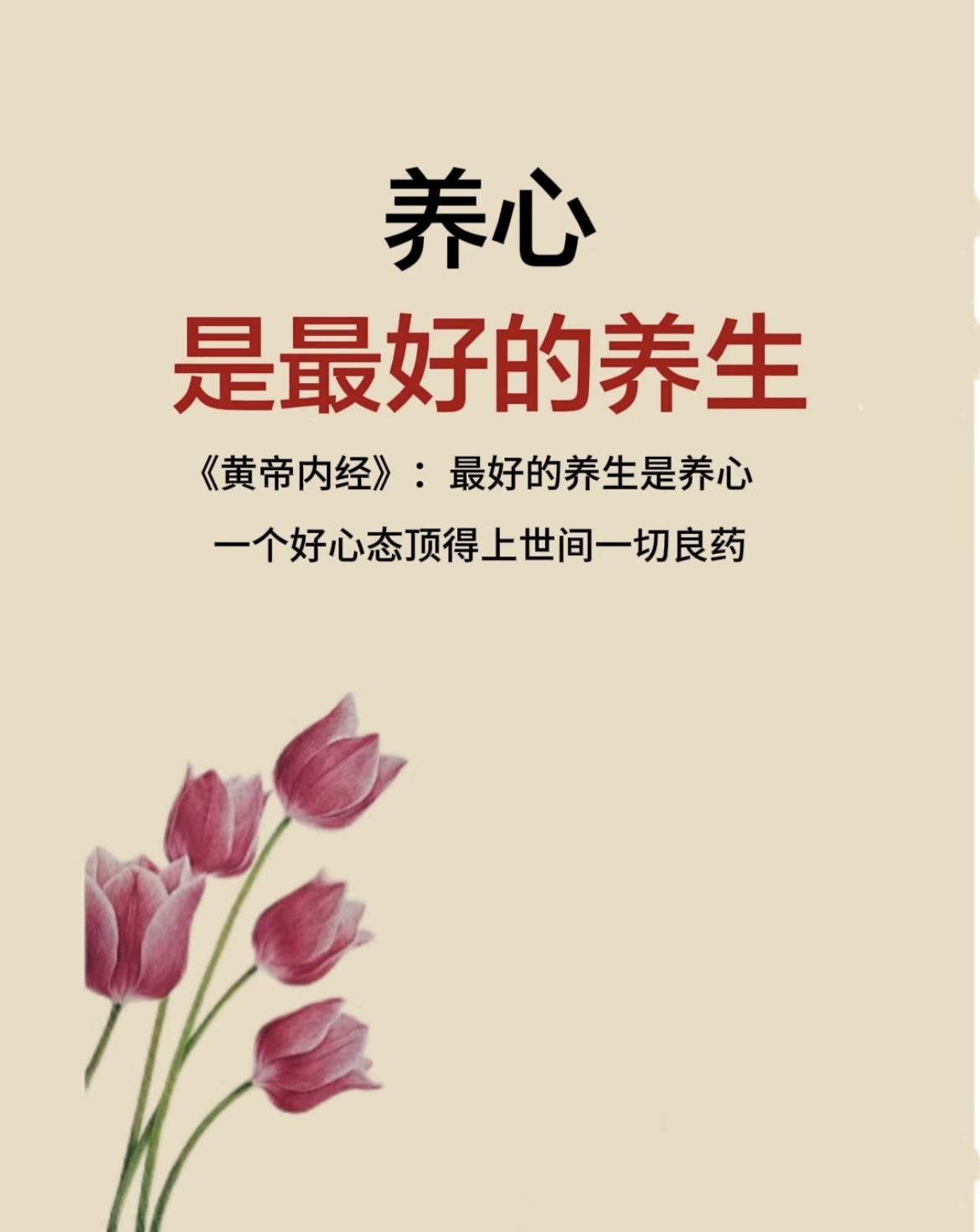 《黄帝内经》:最好的养生是养心 📚《黄帝内经》上说:最好的养生是养心;一个好心态顶得上世间一切良药,养好心是养生的重点: . 1⃣食饮有节,起居有常,不妄作劳 生活要遵循自然规律,保持身心的平衡。 饮食方面要有节制和节奏。就是要适度、不过量。根据节气、季节的变化去吃喝。多吃当季的食物,顺应自然才会活得自然。 作息时间要有规律,按时起床和睡觉,以利于身体的自然恢复。 不要过度劳累,要适当休息,避免身体和精神的过度消耗。 . 2⃣春夏养阳,秋冬养阴 春夏养阳是为了促进少阳之气的生长和太阳之气的增长。 春季是万物复苏的时候,多到户外活动,保持心情愉快,以促进阳气的生发。 夏季则是阳气达到鼎盛的时期,应避免过度贪凉和冷饮,以免损伤阳气。 而秋冬养阴则是为了让太阴之气得以收敛,少阴之气得以潜藏。 秋季是万物成熟收敛的时候,应该注重早睡早起,保持心态平和,以帮助阴气的收藏。 冬季则是阴气最盛的时候,应早睡晚起,避免过度寒冷和潮湿,以保护阳气。 顺应自然节律,根据季节变化调整生活方式,以保持身心的最佳状态。 . 3⃣喜伤心,恐胜喜,怒伤肝,悲胜怒 生活中,遇到不顺心的事,便肆意宣泄情绪,这样损害的反而是自己的身体。 情绪生病,比身体生病更可怕。我们如何对待身体,它就会如何回应你。 所以尽量保持平和的心态,善解自己的情绪,对他人宽容以待。 当身心得到良好的养护,一切事情自然而然会变得顺利。 俗话说,心无挂碍,则百病不生,情绪稳定才是最好的养生 . 4⃣气相得则和,不相得则病 岐伯说:气候的变化是由天地间的阴阳之气相互作用产生的。 当这些气候因素相互协调时,人体就会感到舒适和健康;如果它们不协调,就可能导致疾病。 比如,气候过于寒冷或过于炎热,或者湿气过重,都会让人体觉得不舒服。 空调房待久了,记得多出去走走,呼吸新鲜空气,让身体与大自然同频共振,和谐共生。 . 5⃣恬淡虚无,真气从之,精神内守,病安从来 当一个人内心平静、欲望淡泊,不被外界的欲望和情绪所干扰时,体内的真气就能顺畅流动;保持精神集中和内在的稳定,疾病就难以产生。 一个人心态越平和,越能延年益寿;没有过多的物欲和担忧,精神自然饱满。 人生百味,随意就好;以如常为喜,以如愿为安