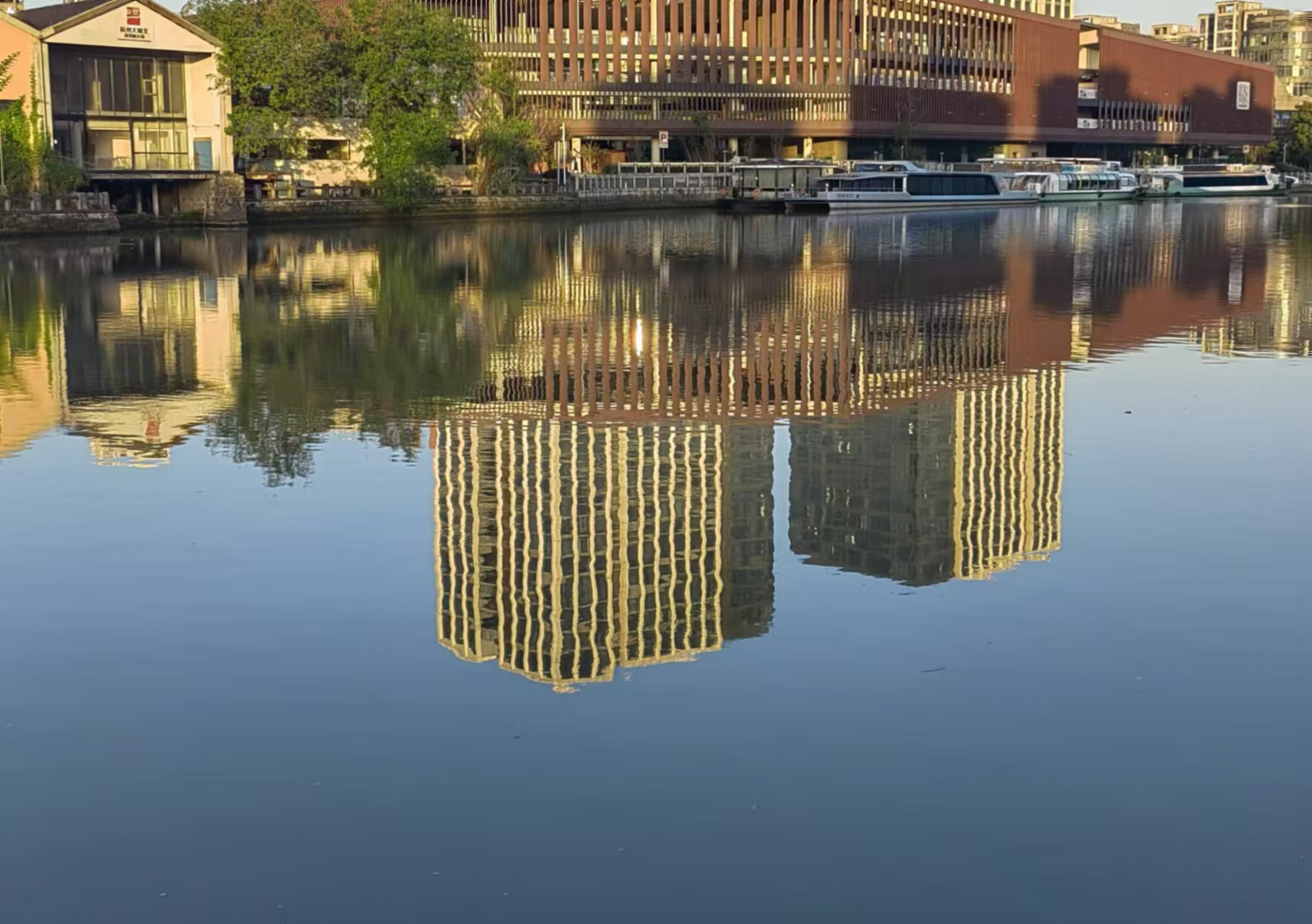 拱宸桥畔,运河静谧如镜,游船轻泊,老厂房红砖与玻璃幕墙倒映水中,江南水乡与现代都市温柔相拥~