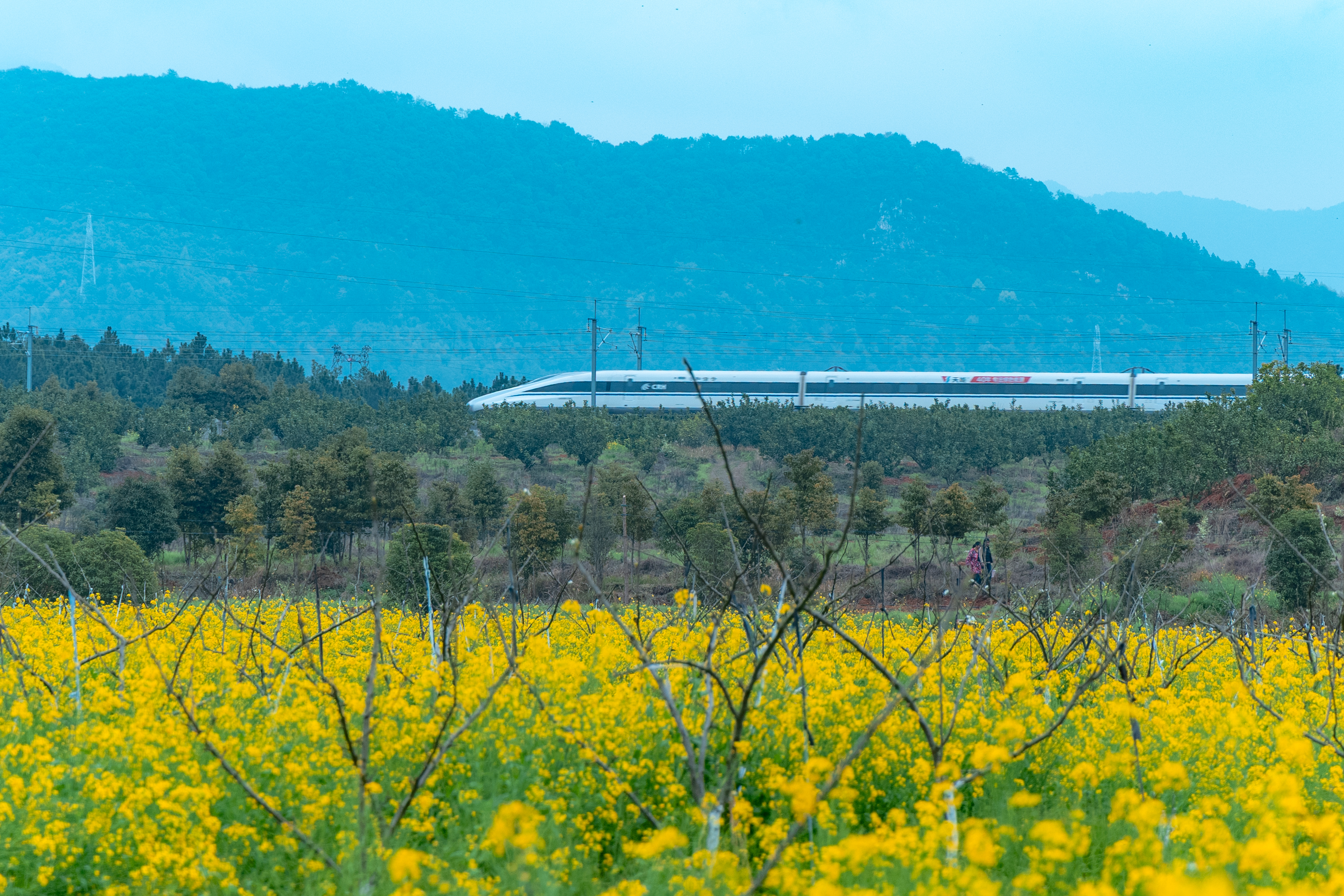 近日,在江西省吉安市吉水县醪桥镇,黄牛洞柚稻产业园内油菜花竞相绽放,金黄花海与青山叠翠相映成趣。高铁列车穿行其间,蜂蝶在花间忙碌采蜜,勾勒出一幅“产业兴、生态美、春意浓”的乡村振兴画卷,尽显人与自然和谐共生的美好图景。