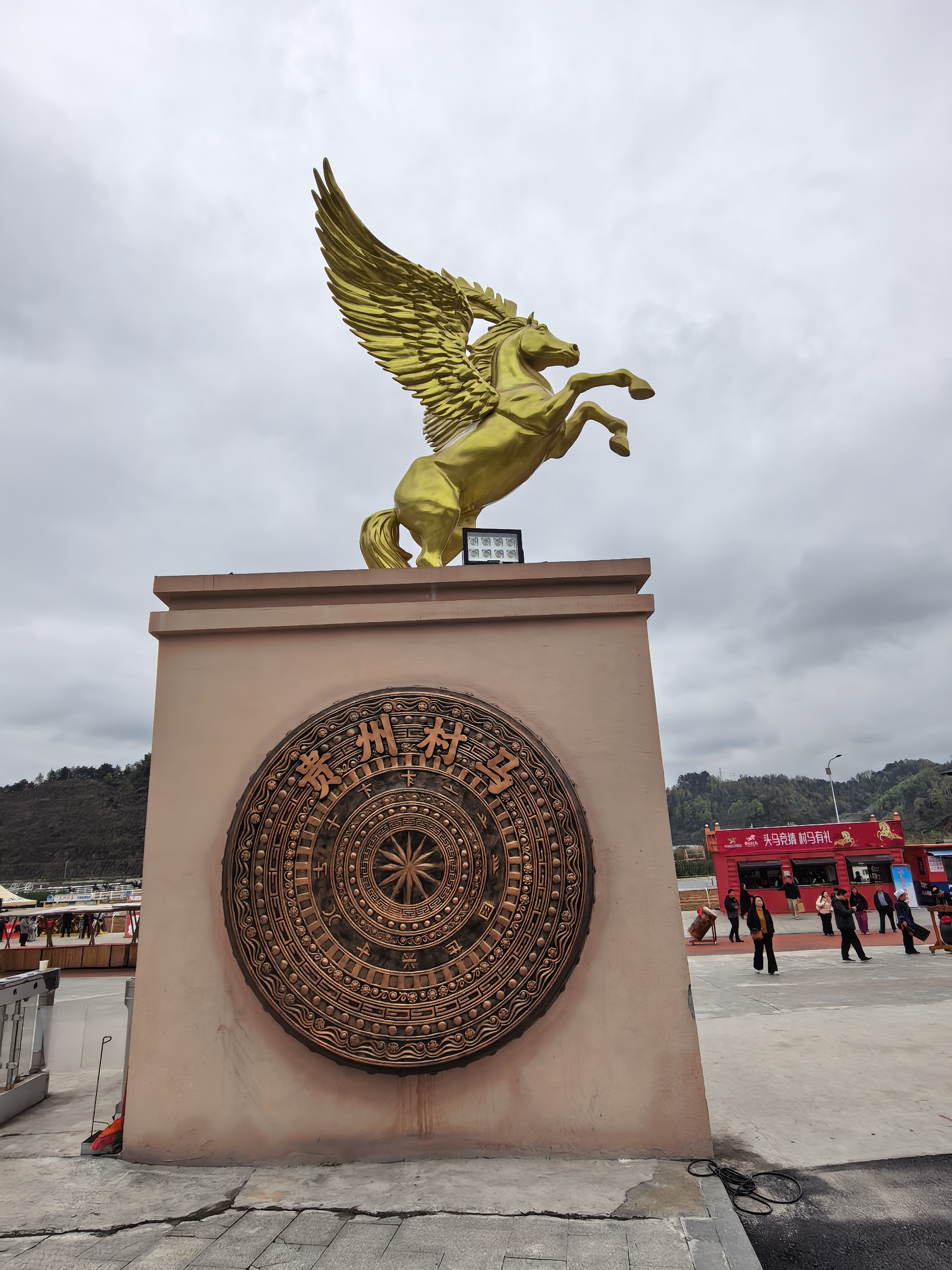 飞马跃金翼,铜雕映山云。红墙前游人如织,传统纹饰与现代雕塑在广场上低语,贵州的魂,在光影里奔腾。