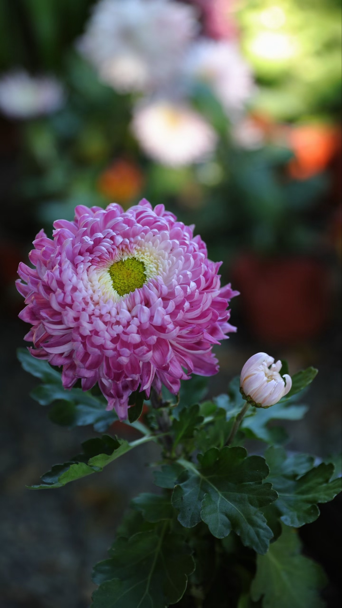 粉菊盛放,花蕊微露,绿叶衬着花苞
