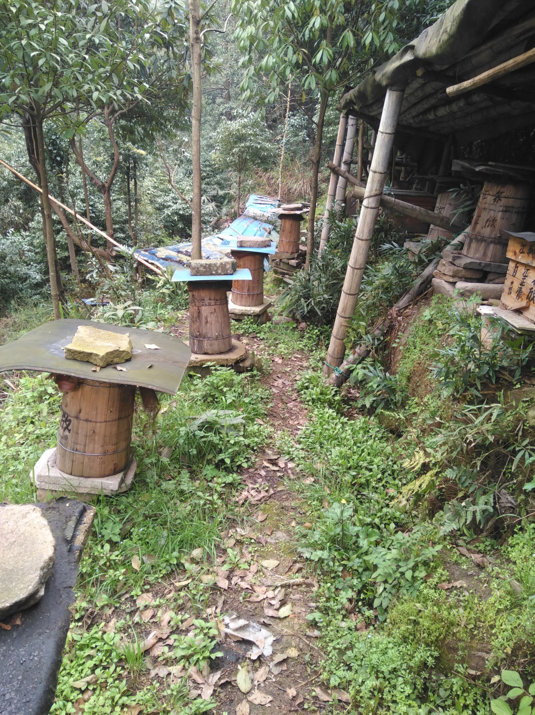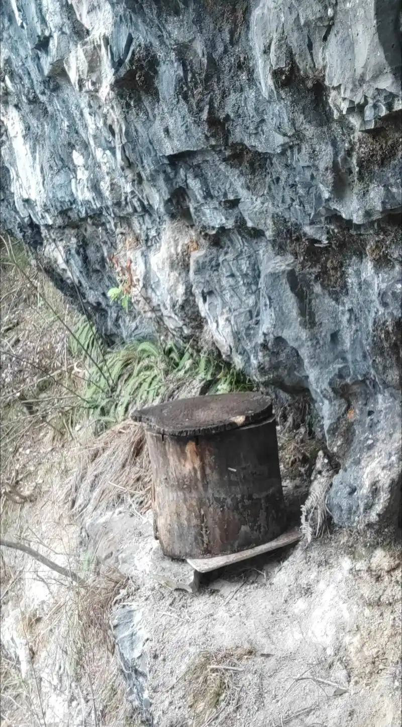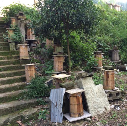 土蜂竖桶 文/陈水河 深山老林里,偶能遇见几块杉木板拼接而成的它,竖在崖壁下,或挂在老屋山墙外。桶身粗朴,不加雕饰,只顶着一片棕榈覆着的斗笠,像山民戴的箬帽。斗笠边缘已有些破损,风从豁口里钻进去,又钻出来,带着桶里的蜜香,飘得很远。而今,山农为经久耐用,干脆剪一正方的油毡布代替(如视频)箬帽,是省力不少,但古朴成分少了许多。 杉木特有的幽香还残留在木纹里,那香气与蜂蜡、野花的气息搅在一起,经年不散。板与板之间不曾用胶,也不曾用榫卯,全靠竹篾箍紧,透着一股子素朴的巧思。桶壁上留着几道深浅不一的刀痕,是往年割蜜时留下的印记,有的已经发黑,渗进木纹深处。细看,木纹间还能寻着暗金色的蜜渍,阳光照上去,微微发亮,像是木头自己沁出的汗。 清明前后,山花开了,桶口的缺空里便有工蜂进进出出,带着两团金黄的粉,后腿沉甸甸的,飞起来有些吃力。嗡嗡的声响从板壁缝里透出来,不吵,闷闷的,像大山深处泉水从石缝里冒出时的心跳。它们不问世事,只管采撷山间的甜,把春、夏、秋三季,一滴滴封存在蜡盖里。其实,工蜂的寿命没有那么长,只有26天左右,真的想为蜂王和蜂桶主人效力,需要一代接一代加油干。阳光透过杉木板间细密的缝隙,照见桶内层层叠叠的巢脾,金黄的蜜在光影里微微发亮,一层一层,像大山收藏的年轮。巢脾是蜜蜂用蜂蜡筑成的六角形蜂房结构,是蜂群储存蜂蜜、花粉以及哺育幼虫的核心场所。 等山里的花逐渐谢尽了,养蜂人估摸着收获的时间到了,这才真正实打实与蜂桶开始亲近。他掀开斗笠或油毡片,拿长刀轻轻一割,一角蜂巢便落了下来。金黄的蜜顺着桶壁慢慢淌,浓稠得能拉出丝来,那是大山积攒了太多的阳光,甜里带着苦,苦里又泛着草木的清。 一只木桶,守着一段山里的岁月。风来了,它听风;雨来了,它听雨。蜂群走了又来,来了又走,只有杉木的纹理还在,一圈圈记着时间的模样。竹篾箍得紧,木板却已经旧了,灰扑扑的,和山崖上的石头一个颜色。若不驻脚细看,还以为是大山自己长出来的东西。