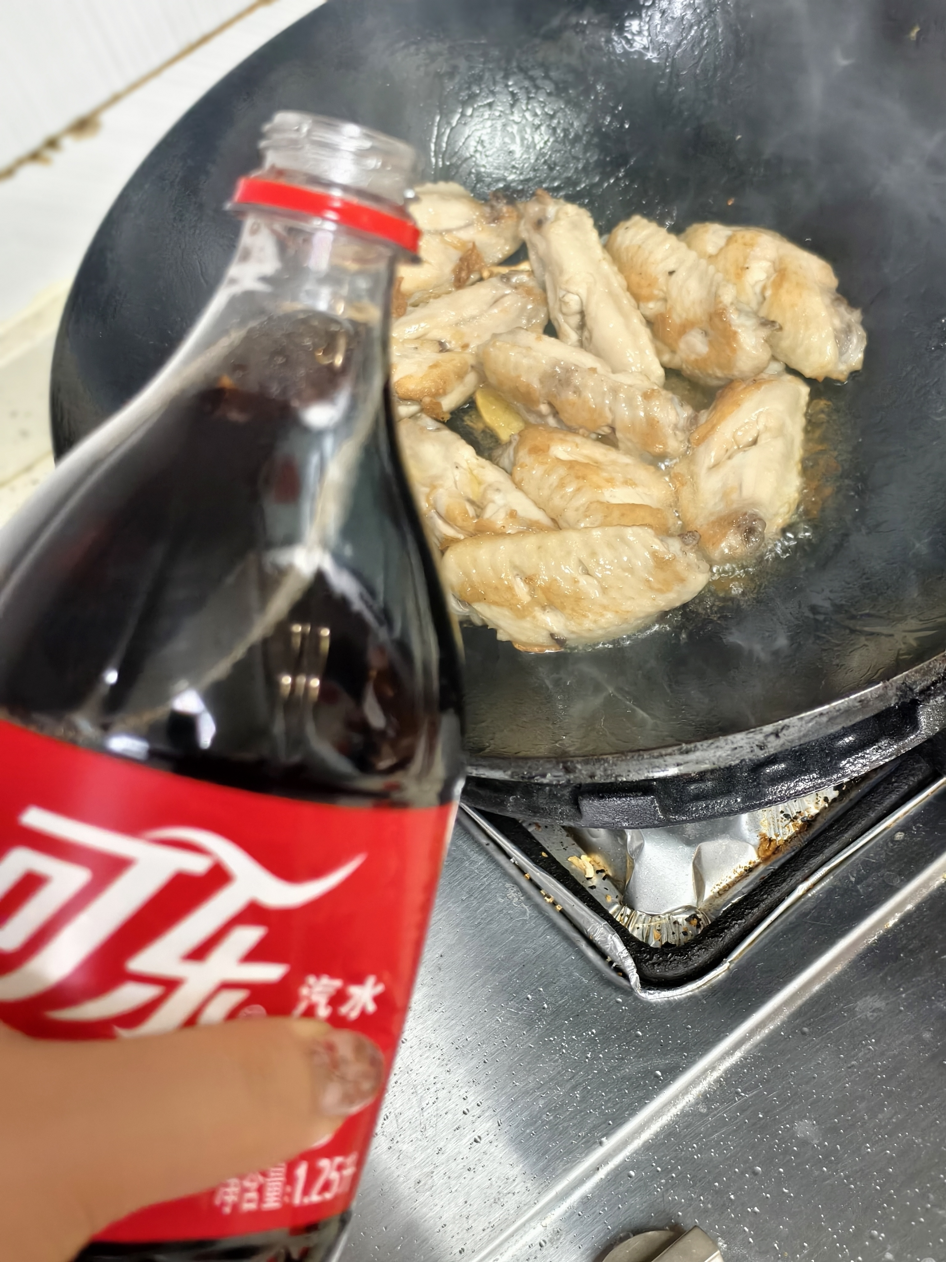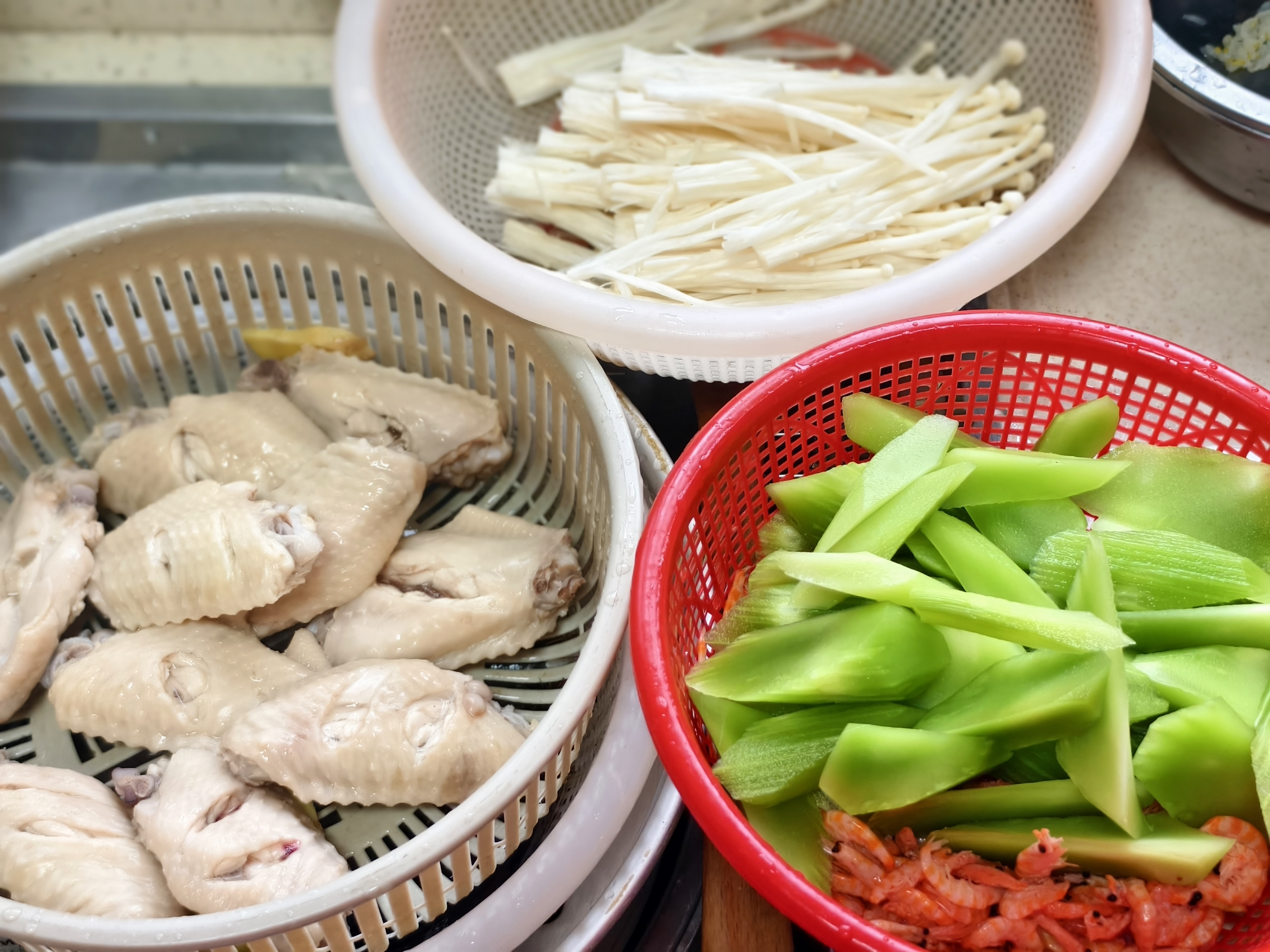 周末份露一手😎😎😎 妹妹要吃的可乐鸡翅😊😊 0.99元的金针菇凉拌一份刚好😁 自家的莴笋炒北方的虾皮,鲜😋😋 老霍烧的上汤螺丝,配料比螺丝多系列😂😂 淡菜直接下锅蒸熟就好,连水都不用放😁😁