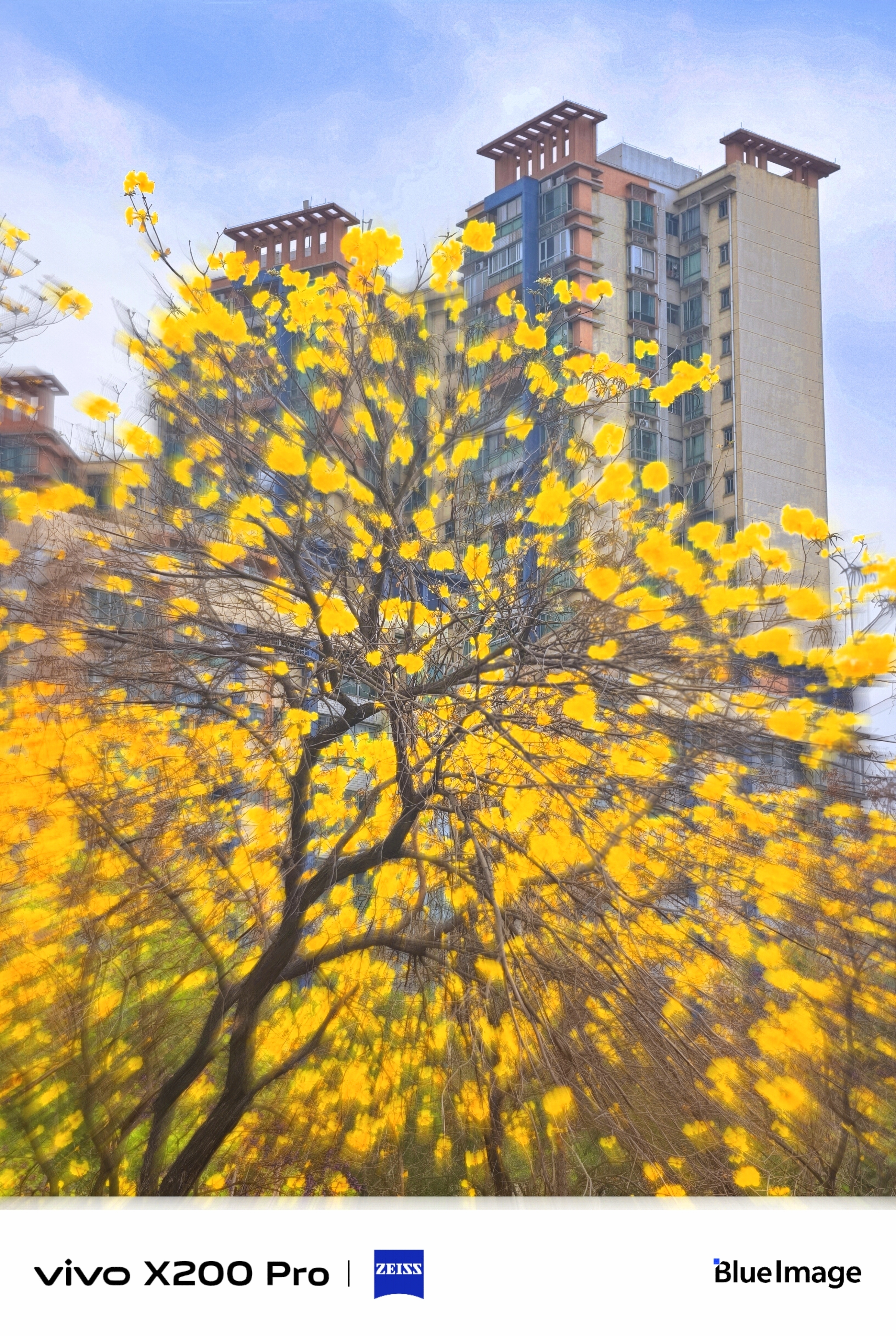 澄澈的蓝天与柔和云絮为画面铺就清新底色,让热烈的黄花更显明媚,也让城市建筑多了几分温柔的烟火气。