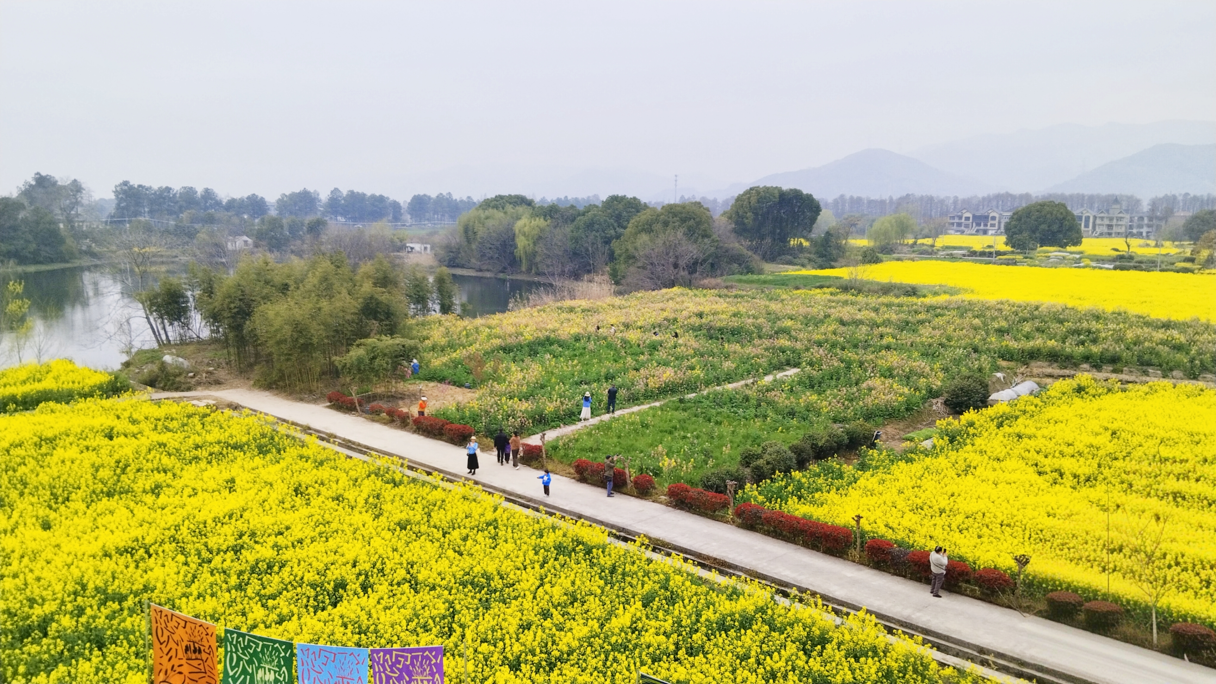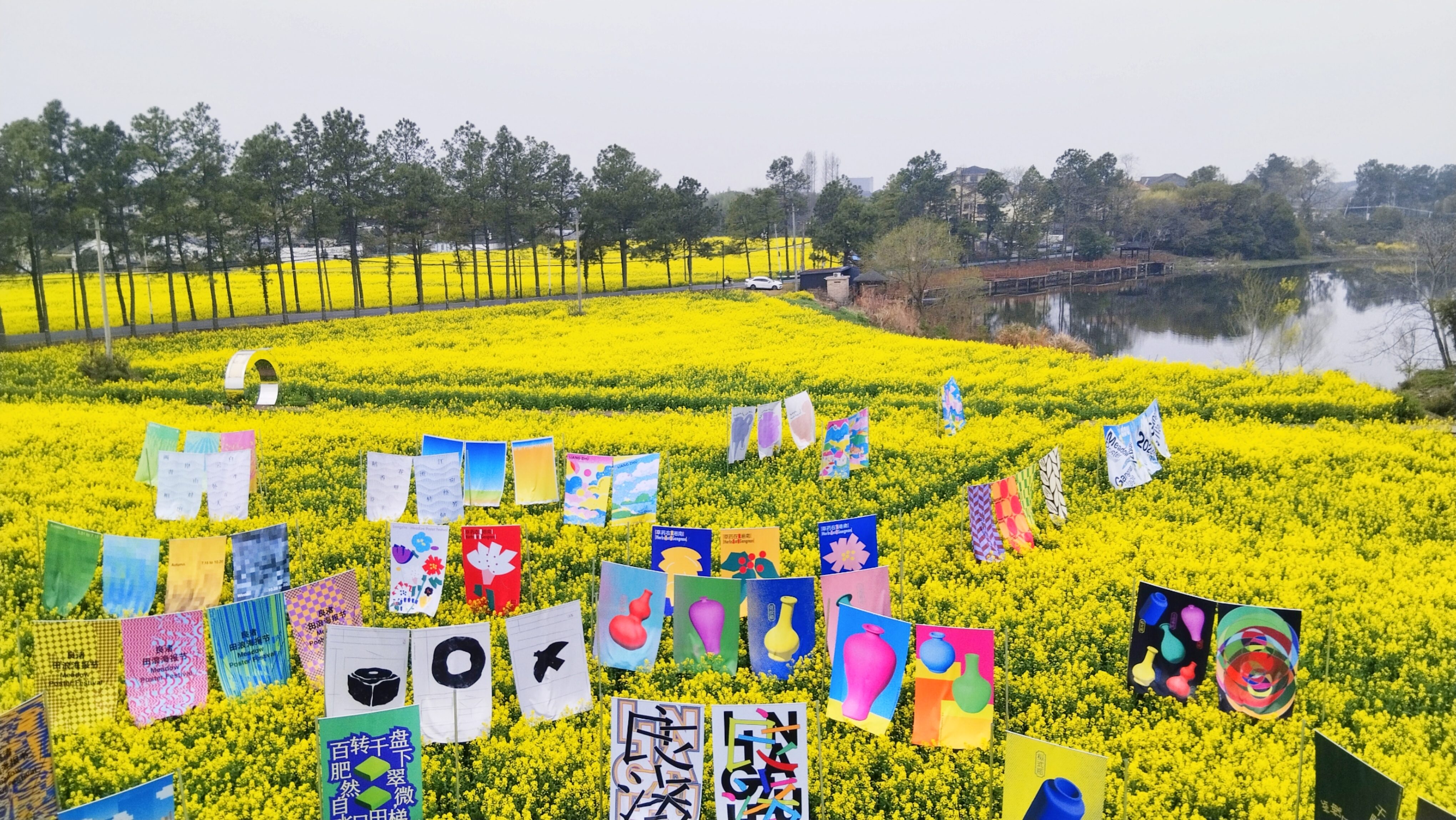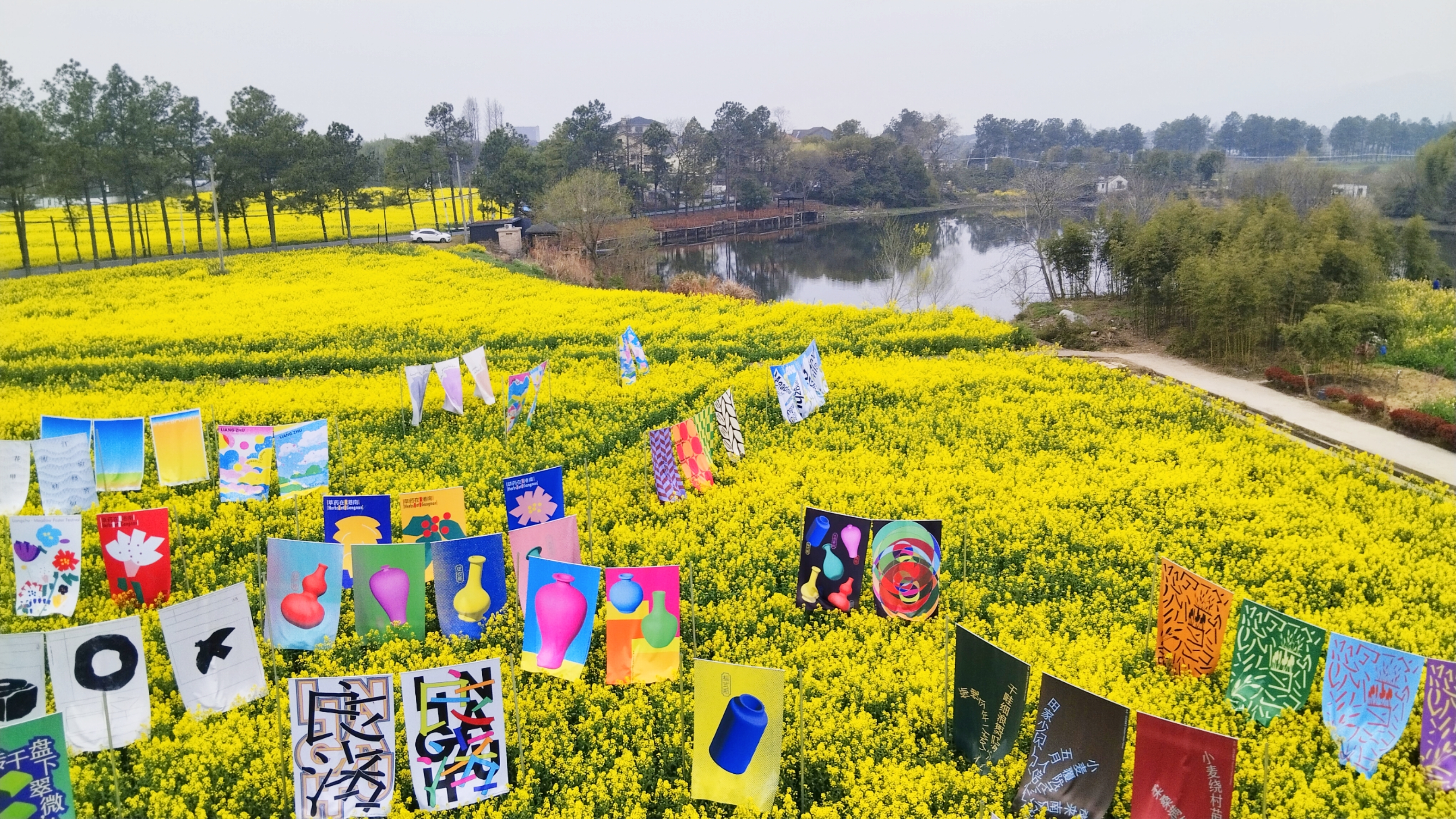 良渚春野,油菜花田作画布,彩旗轻扬,风车旋舞,艺术与自然在湖畔小径间低语。