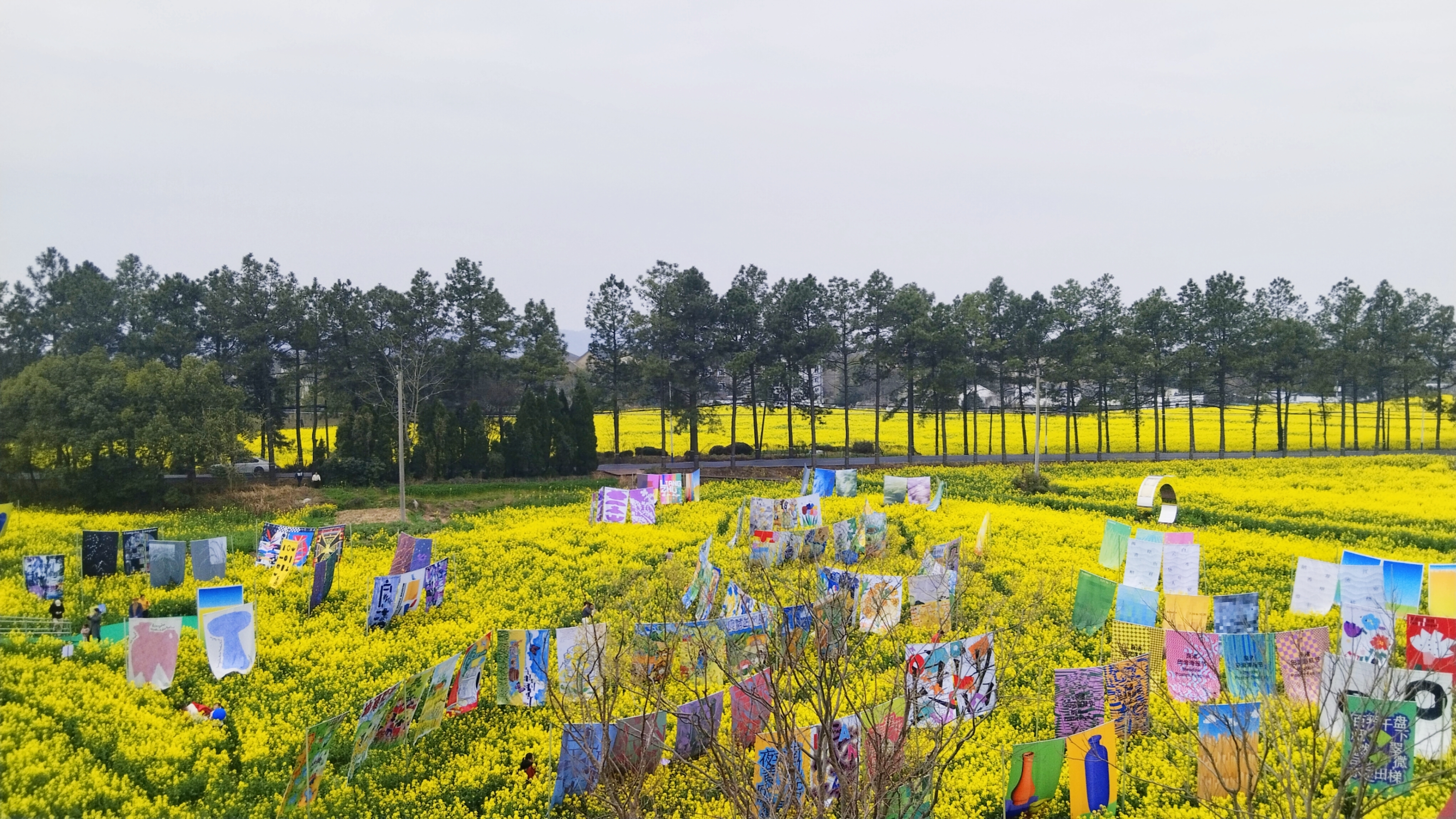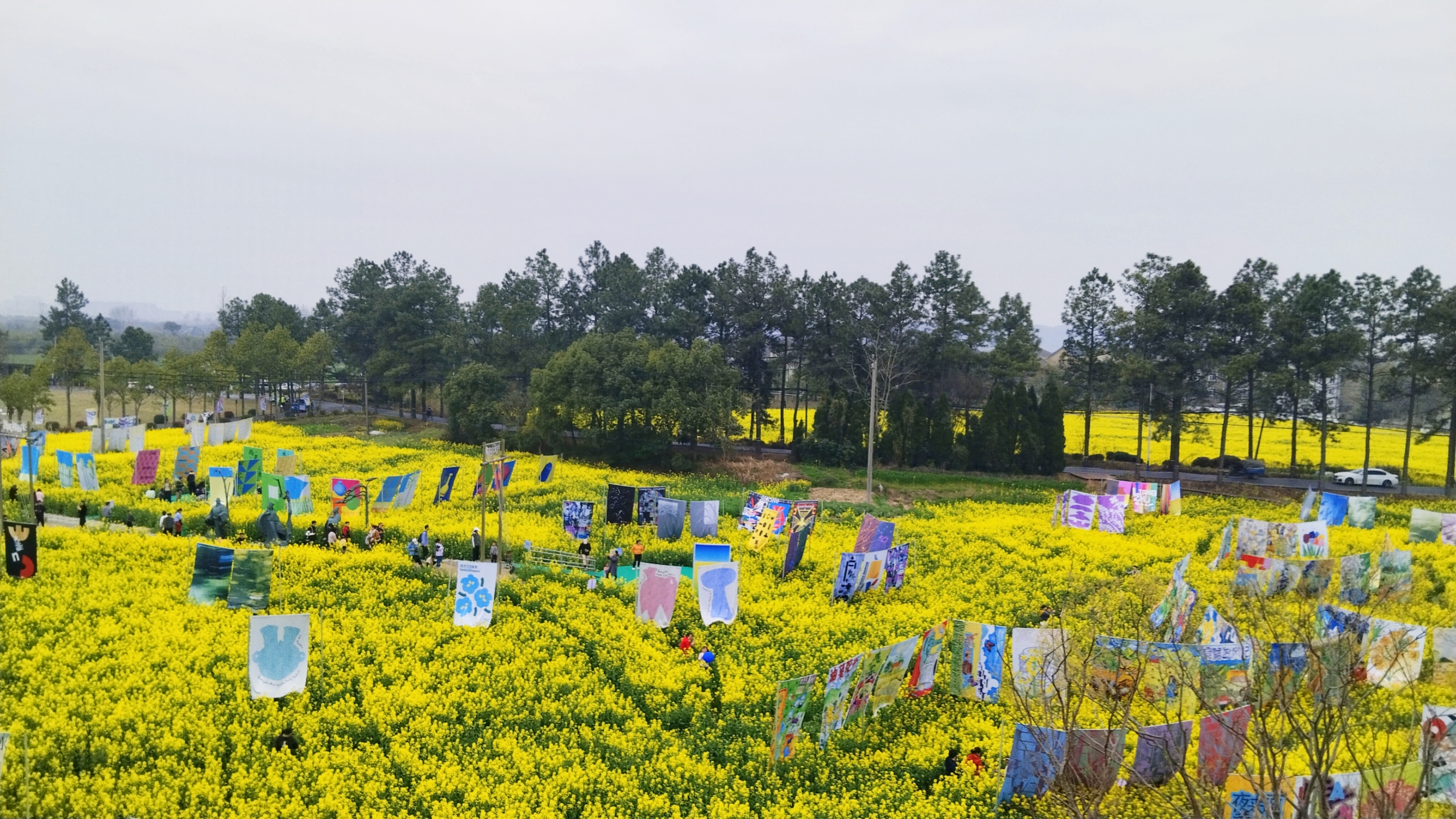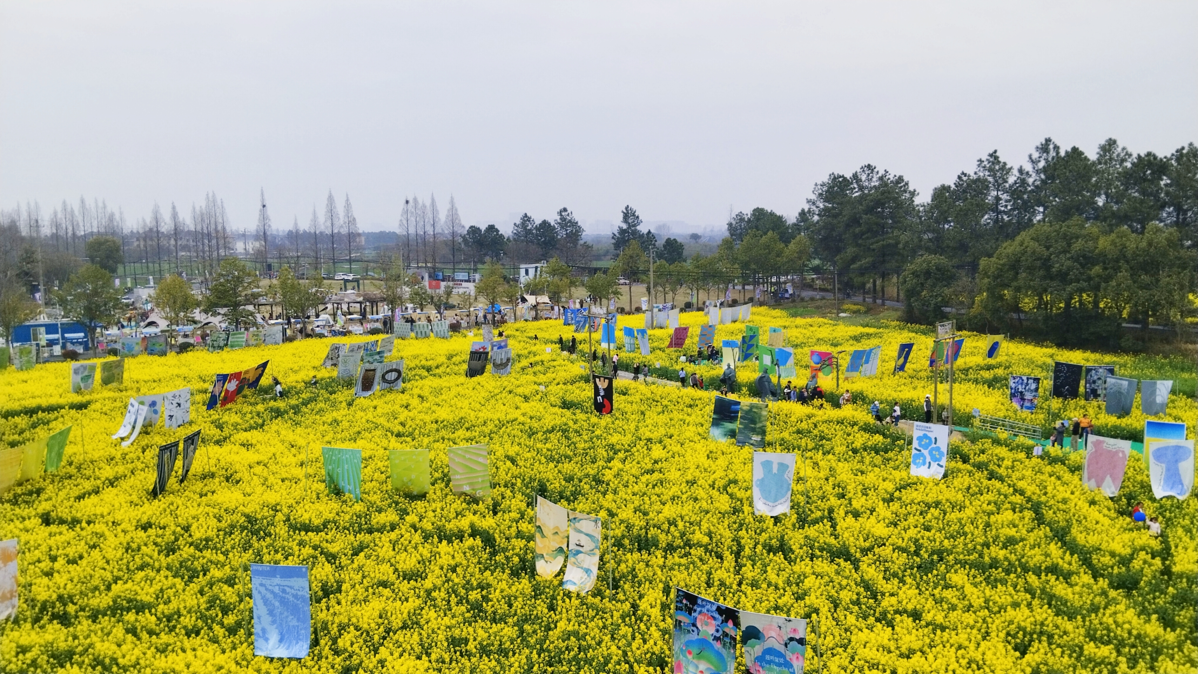 良渚春野,油菜花田作画布,彩旗轻扬,风车旋舞,艺术与自然在湖畔小径间低语。