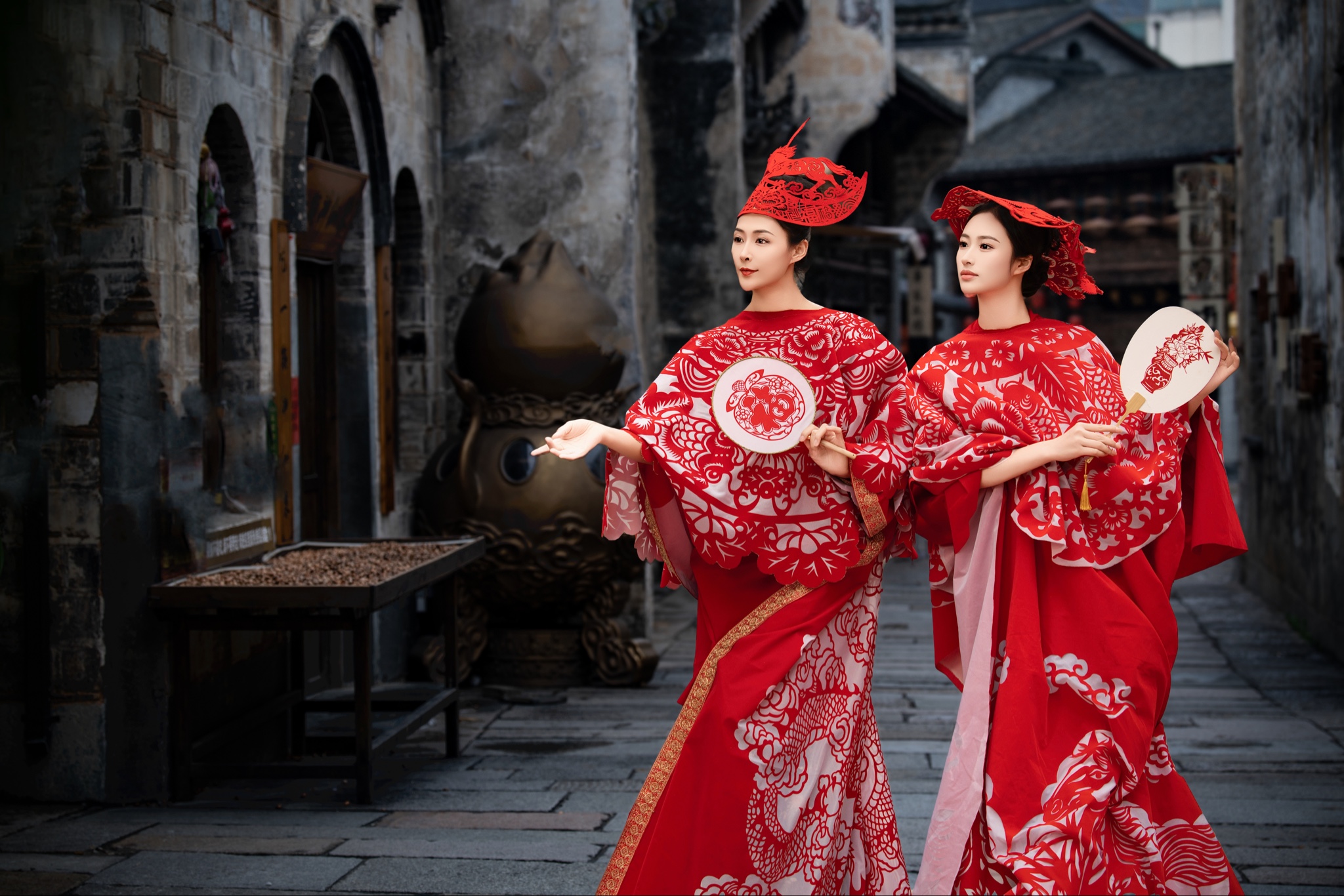 红衣拂过青砖巷,团扇轻掩旧时光。剪纸映窗,铜炉袅袅,一帧江南梦里红妆。