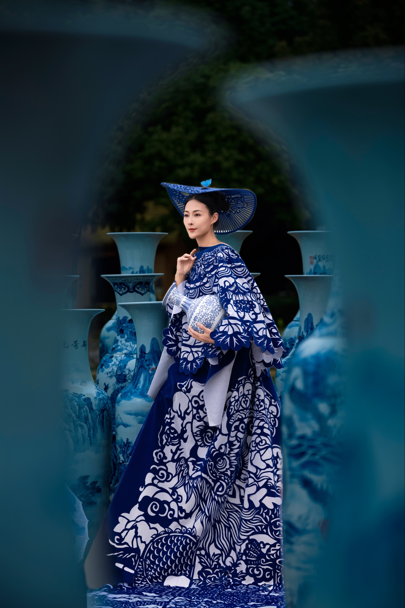 青花入画,剪纸流芳;蓝白间龙纹轻舞,扇影摇曳于古园拱门下,静谧里盛放东方韵致。
