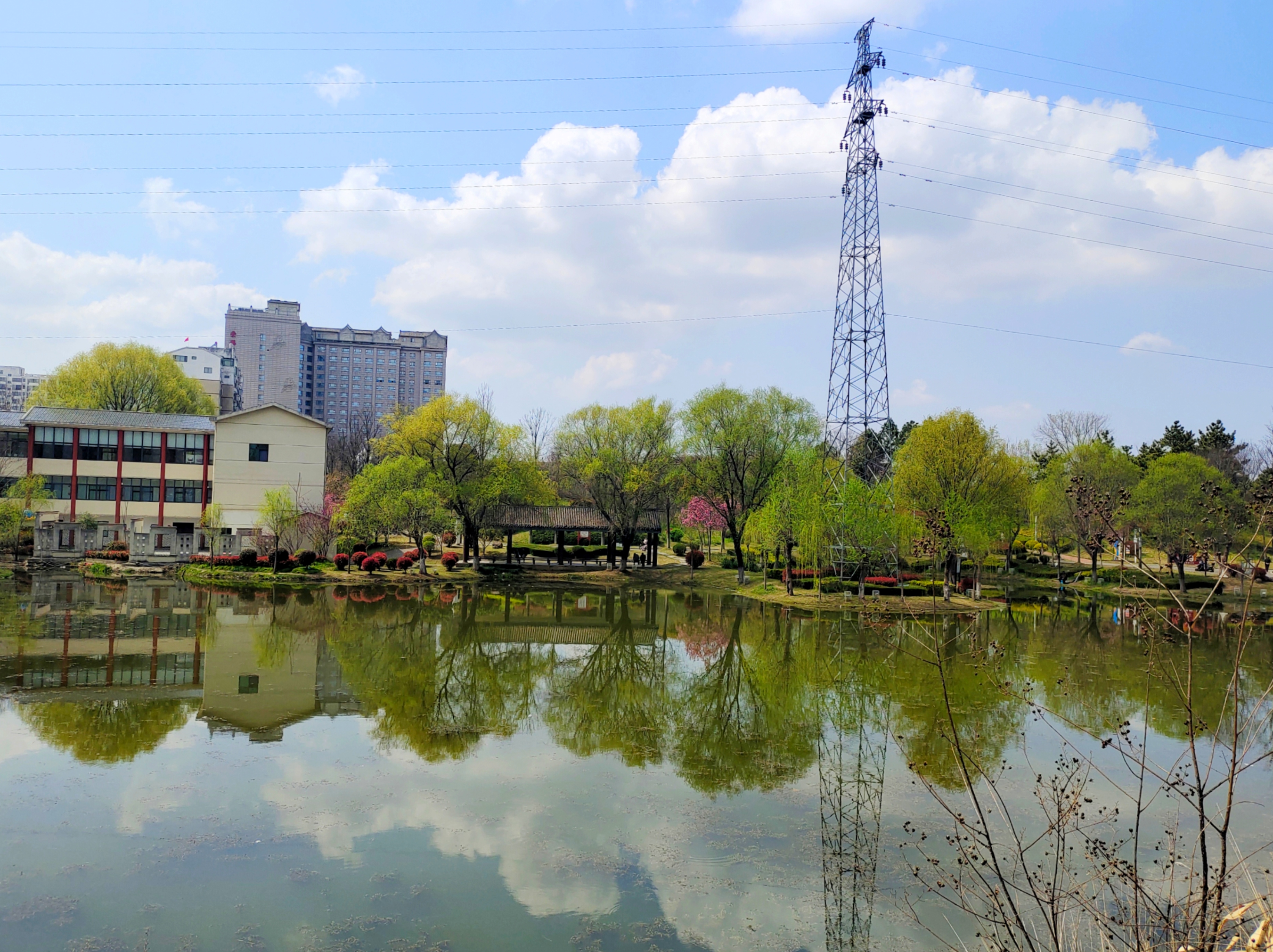 湖光映塔影,绿荫藏亭台。春水静如镜,红花点晴空,城在画中悄然生长。