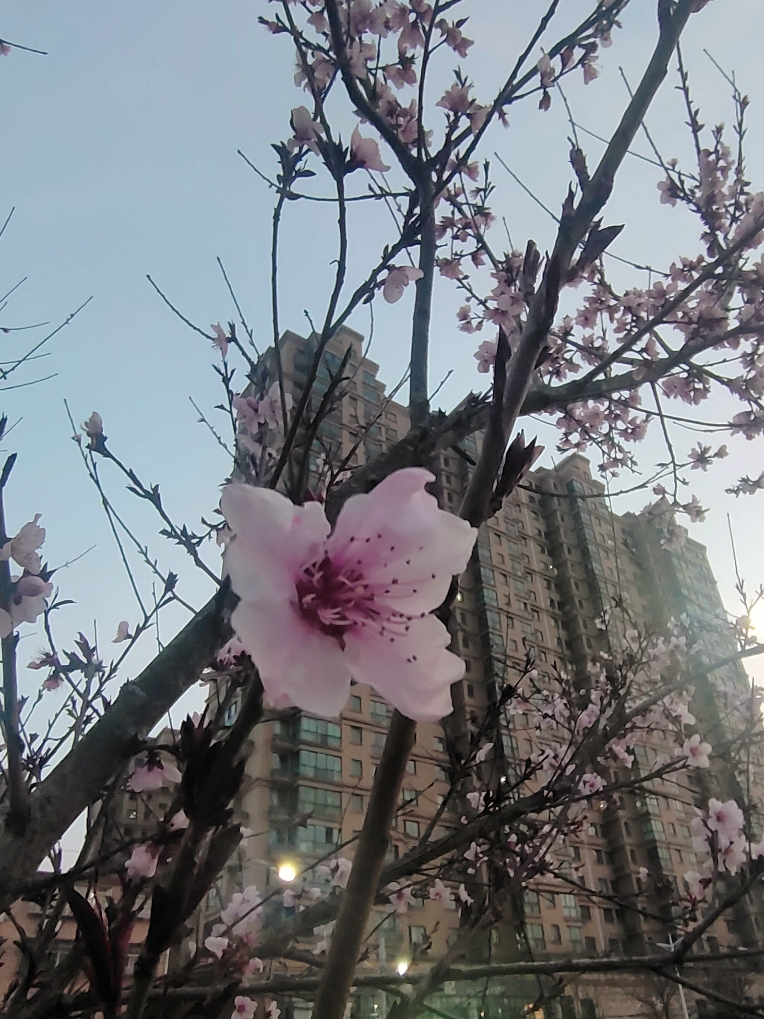 粉桃攀上玻璃幕墙,枝干写意勾勒春的轮廓;花蕾初绽,花瓣轻吻都市天际线——自然与建筑,在春风里悄然和解。