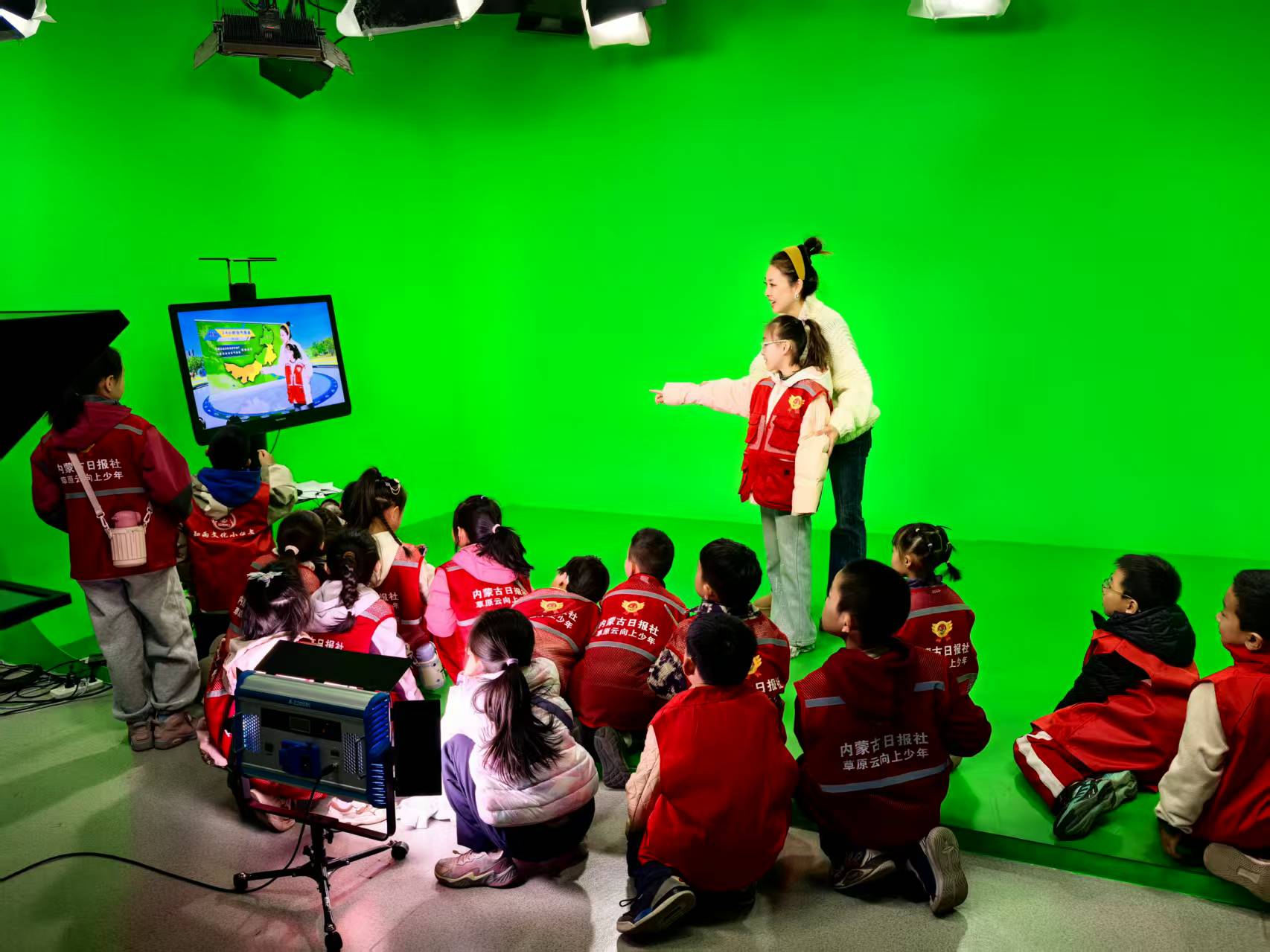 绿幕前小主持人上线!红马甲配电子琴,卡通动画在电视屏里蹦跶~棚内灯光一打,少年媒体初体验,萌翻啦~