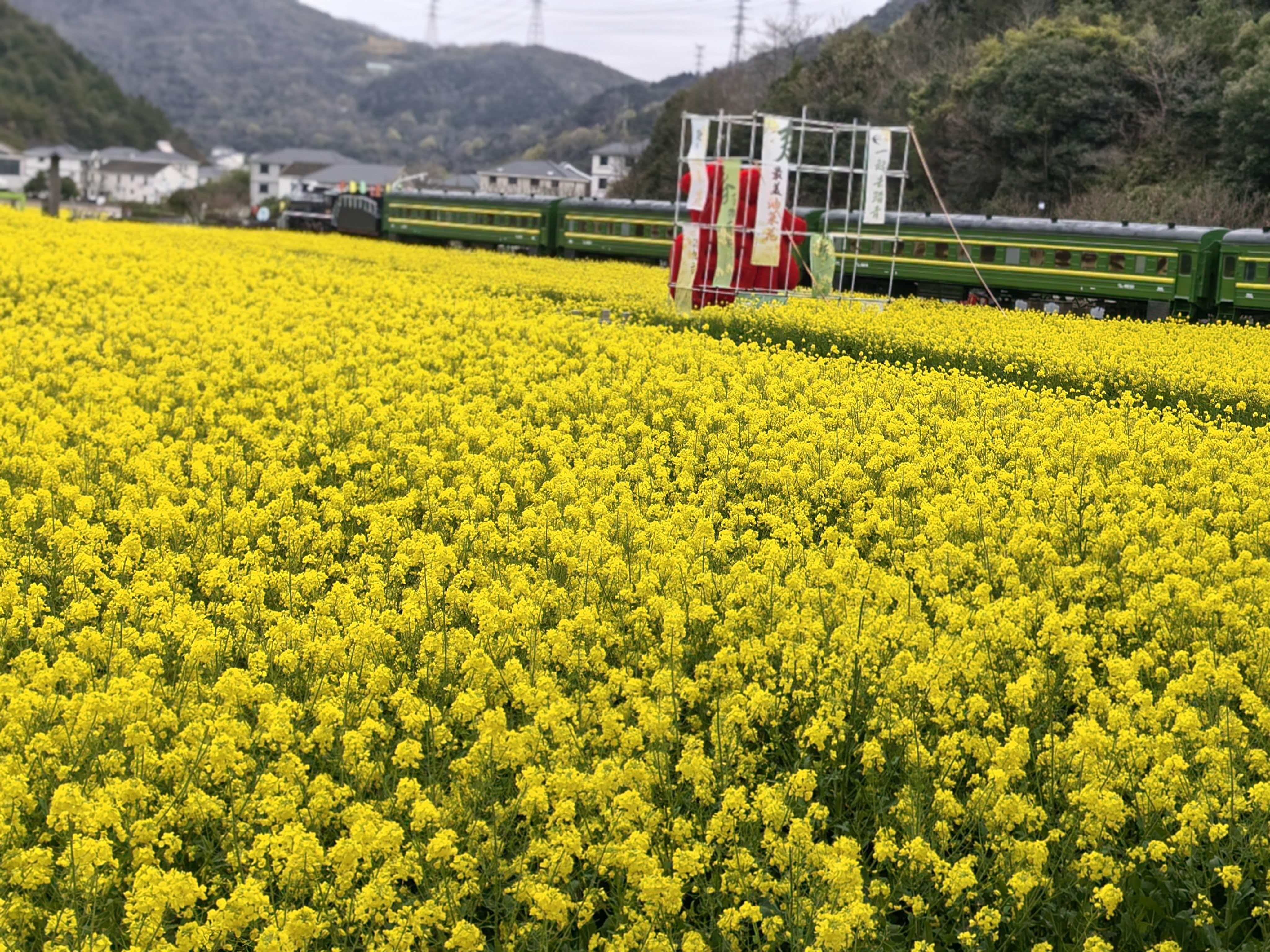 油菜花田边搭上绿皮小火车,樱花枝头粉得刚好~京都的春,连风都是甜的!
