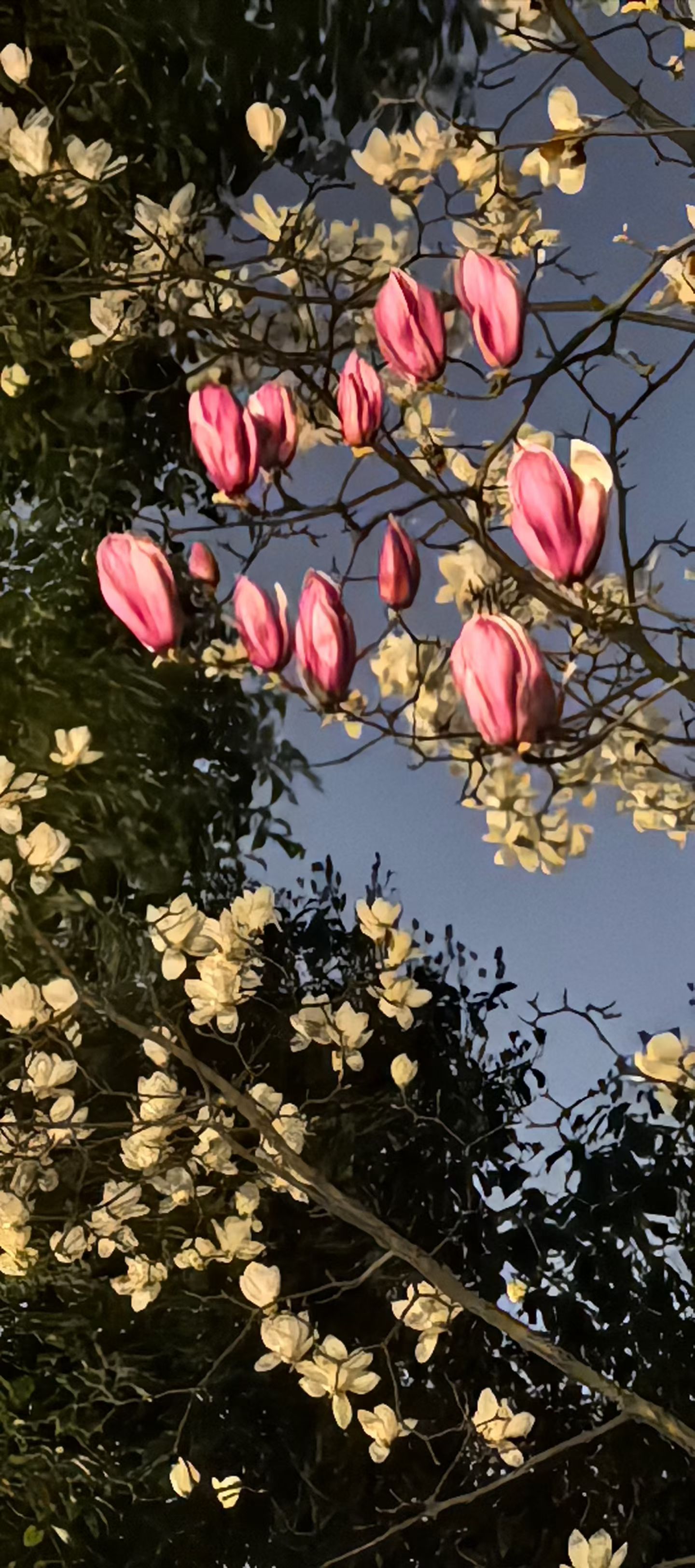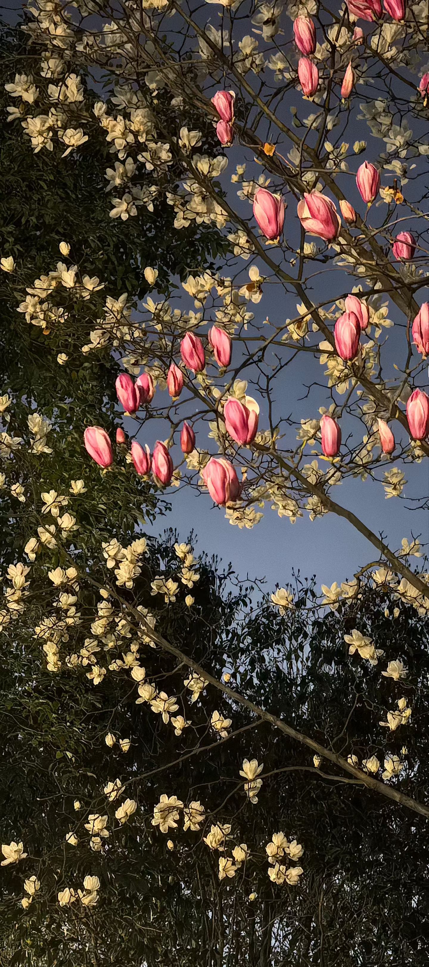暮色里,粉白双色玉兰缀满枝头,像一场盛大而温柔的春日私语。