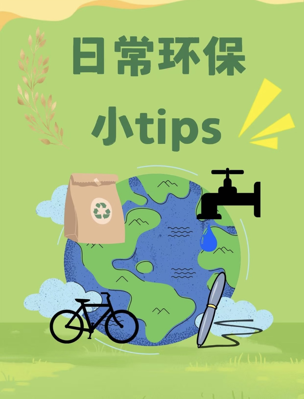 日常环保,一起保护地球🌏 日常出行 1.多步行或骑自行车,近距离出行避免开车。 2.优先选择公共交通,如地铁和公交车。 3.尝试拼车,减少车辆数量。 4.不在公共场所乱扔垃圾,力行垃圾分类。 居家生活 1.随手关灯,电器不用时拔掉插头。 2.节约用水,随手关闭水龙头。 3. 用洗菜水浇花冲厕所,提高水源利用率。 日常消费 1.优先选择环保认证产品,如节能家电和无磷洗涤剂等。 2.拒绝过度包装 3.减少使用一次性餐具和塑料袋,出门自带布袋。 办公学习 1.纸张双面打印,减少纸张浪费。 2.使用可重复使用的笔记本和笔。3离开办公室和教室时关闭电器设备。