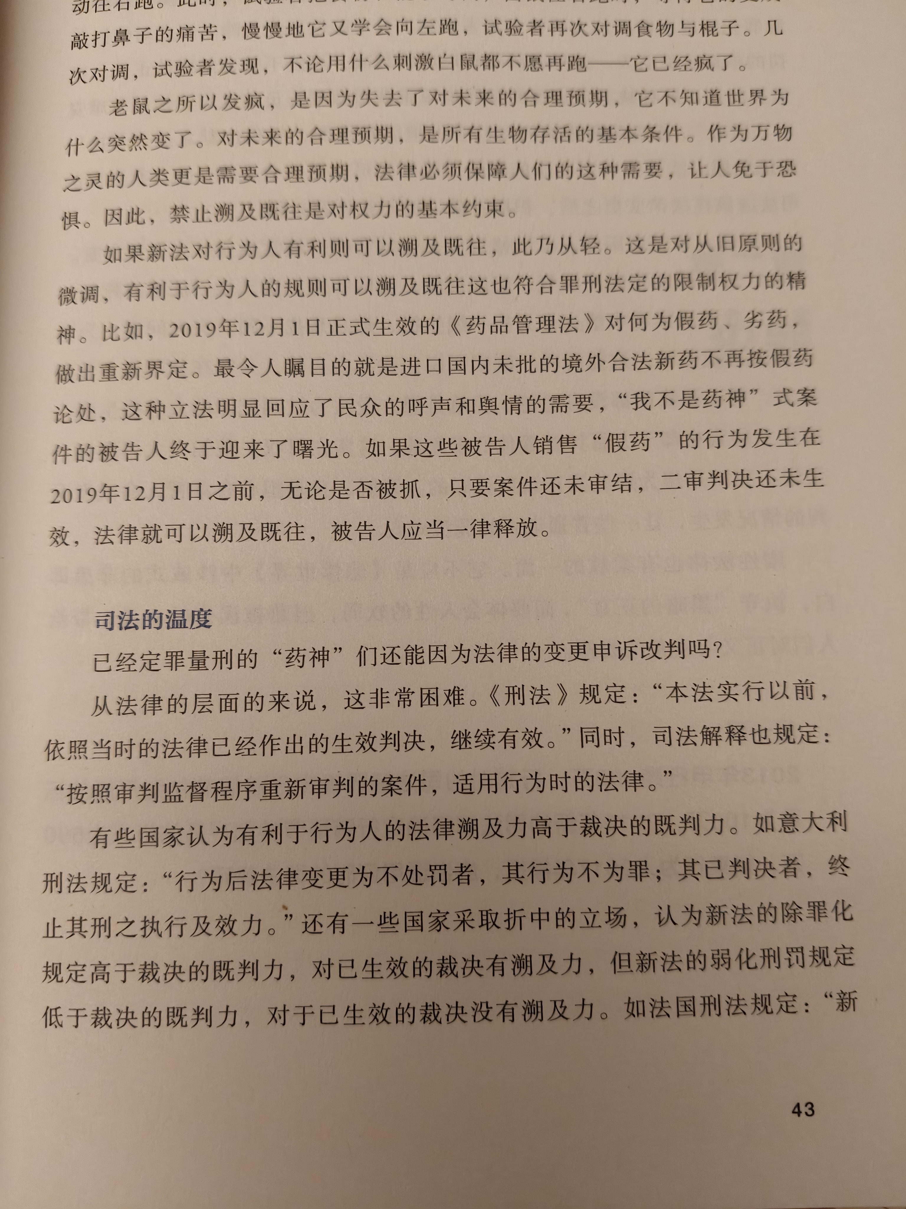 《刑法学讲义》——司法的温度,已经定罪量刑的“药神”们还能因为法律的变更申诉改判吗?从法律的层面的来说,这非常困难。《刑法》规定:“本法实行以前依照当时的法律已经作出的生效判决,继续有效。”同时,司法解释也规定: “按照审判监督程序重新审判的案件,适用行为时的法律。”法律也有柔软的一面,慰藉被误伤的心灵,带给人们对正义与良善的盼望。