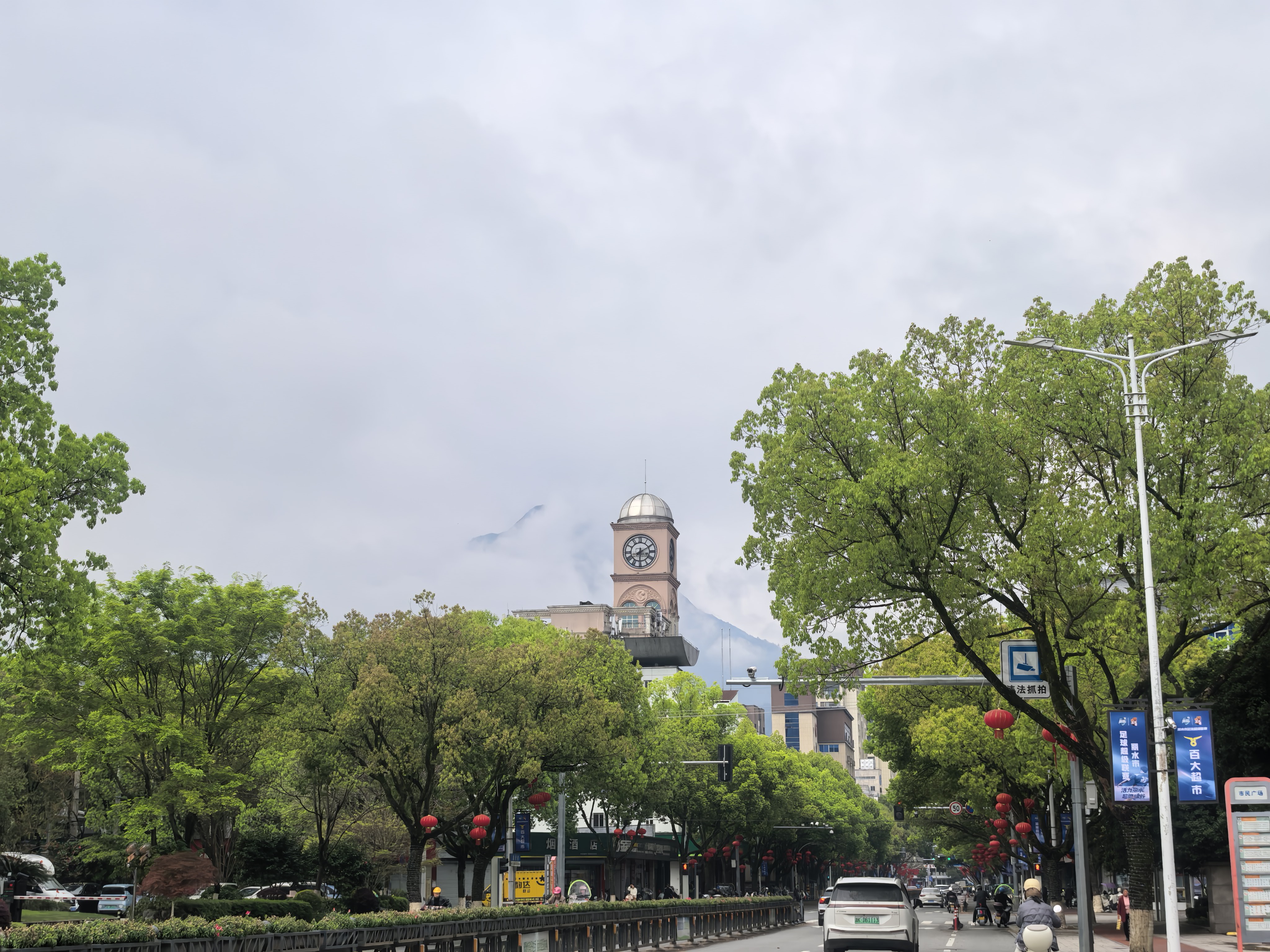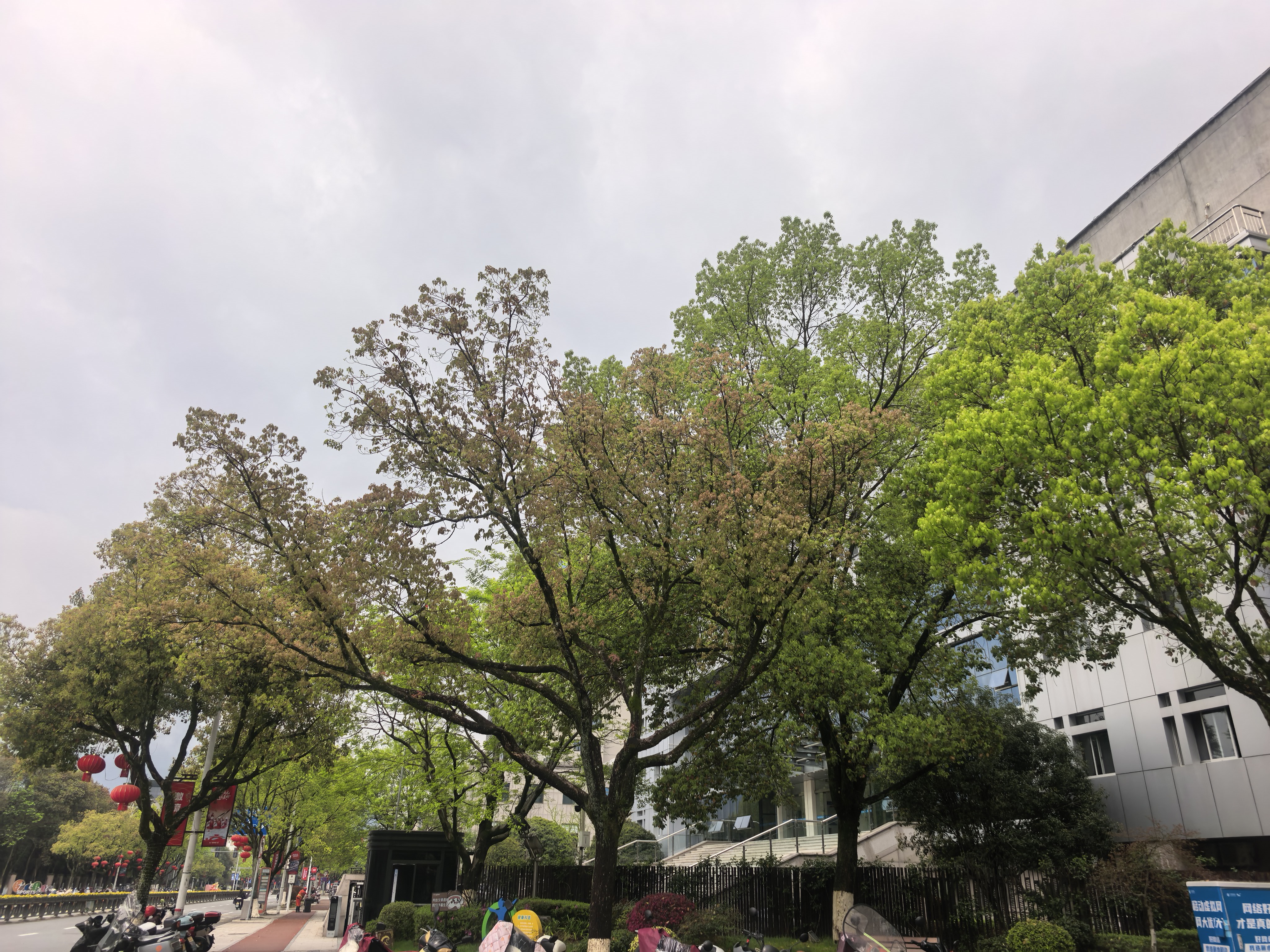 阴天的濛洲街,红灯笼摇曳,绿树与玻璃幕墙撞个满怀~电动车嗖嗖过,随手一拍都是城市呼吸感~
