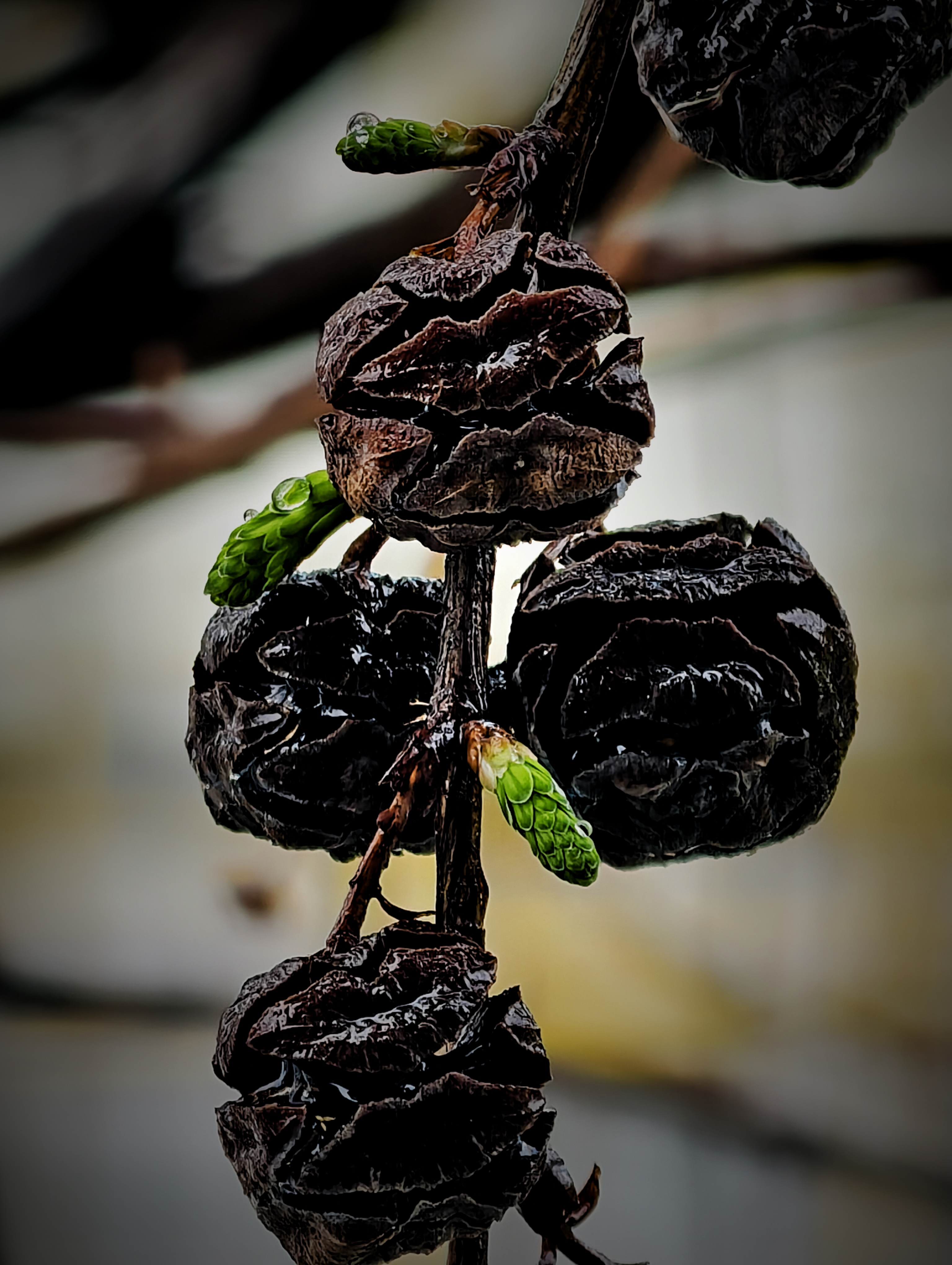 枯鳞抱节留残梦, 嫩翠含珠启新生。 旧果抱枝,是岁月不肯散去的余温; 新芽带露,是春天悄然叩响的门; 枯荣之间,生命自有其轮回与温柔。