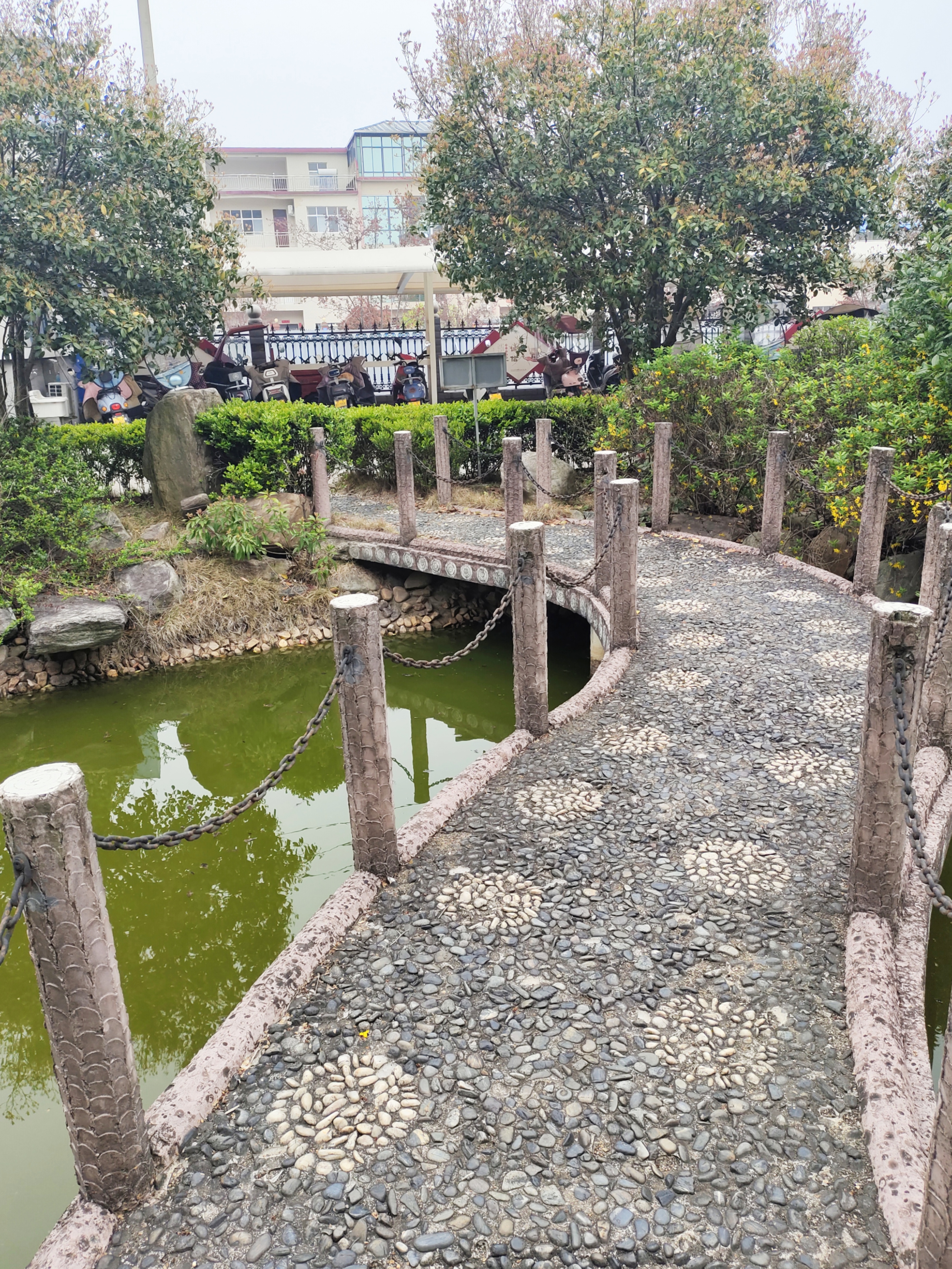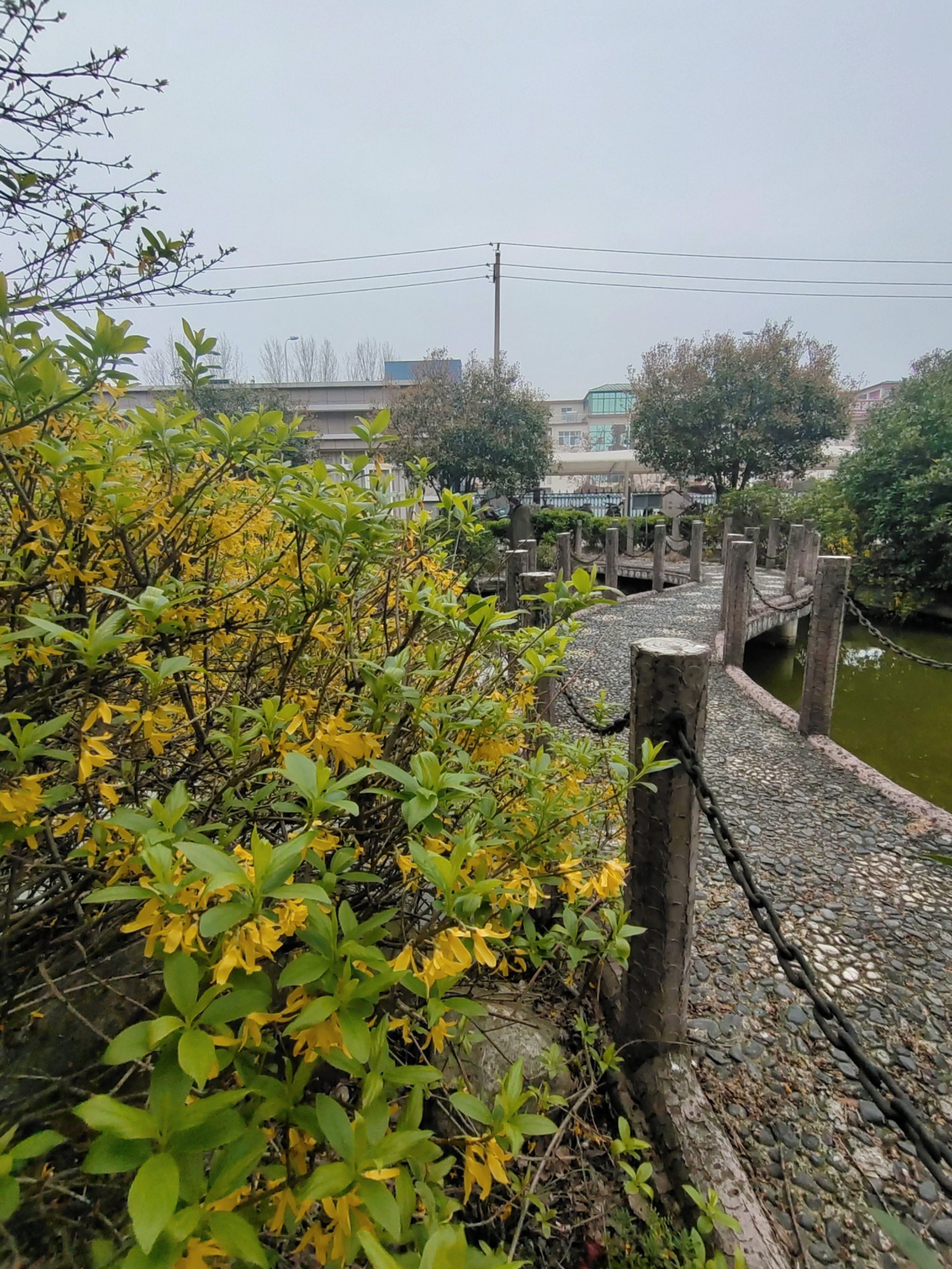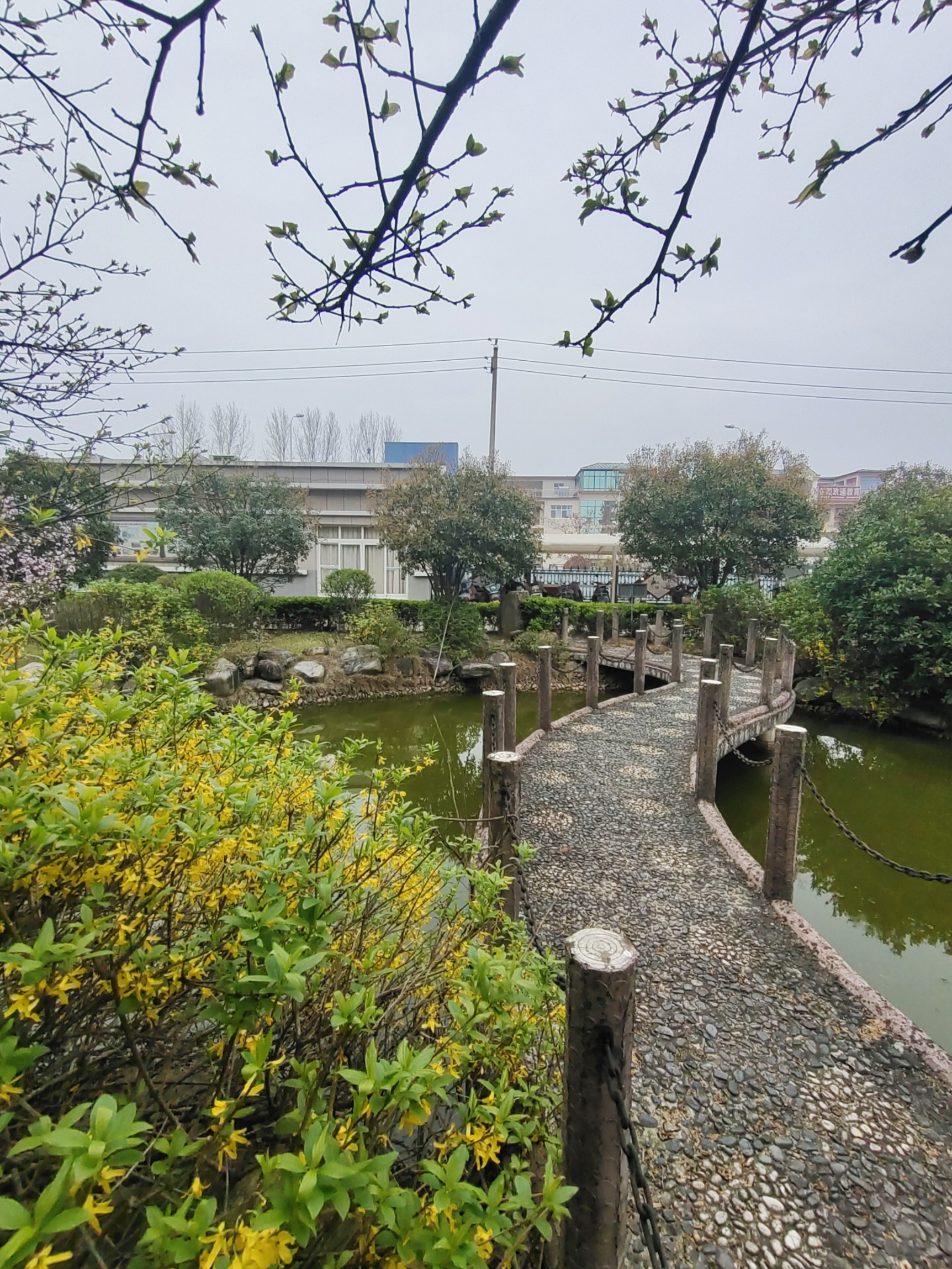 鹅卵石小径蜿蜒,木桥静卧池塘,樱花与黄花映红砖,倒影摇曳,春在建筑与自然间低语。