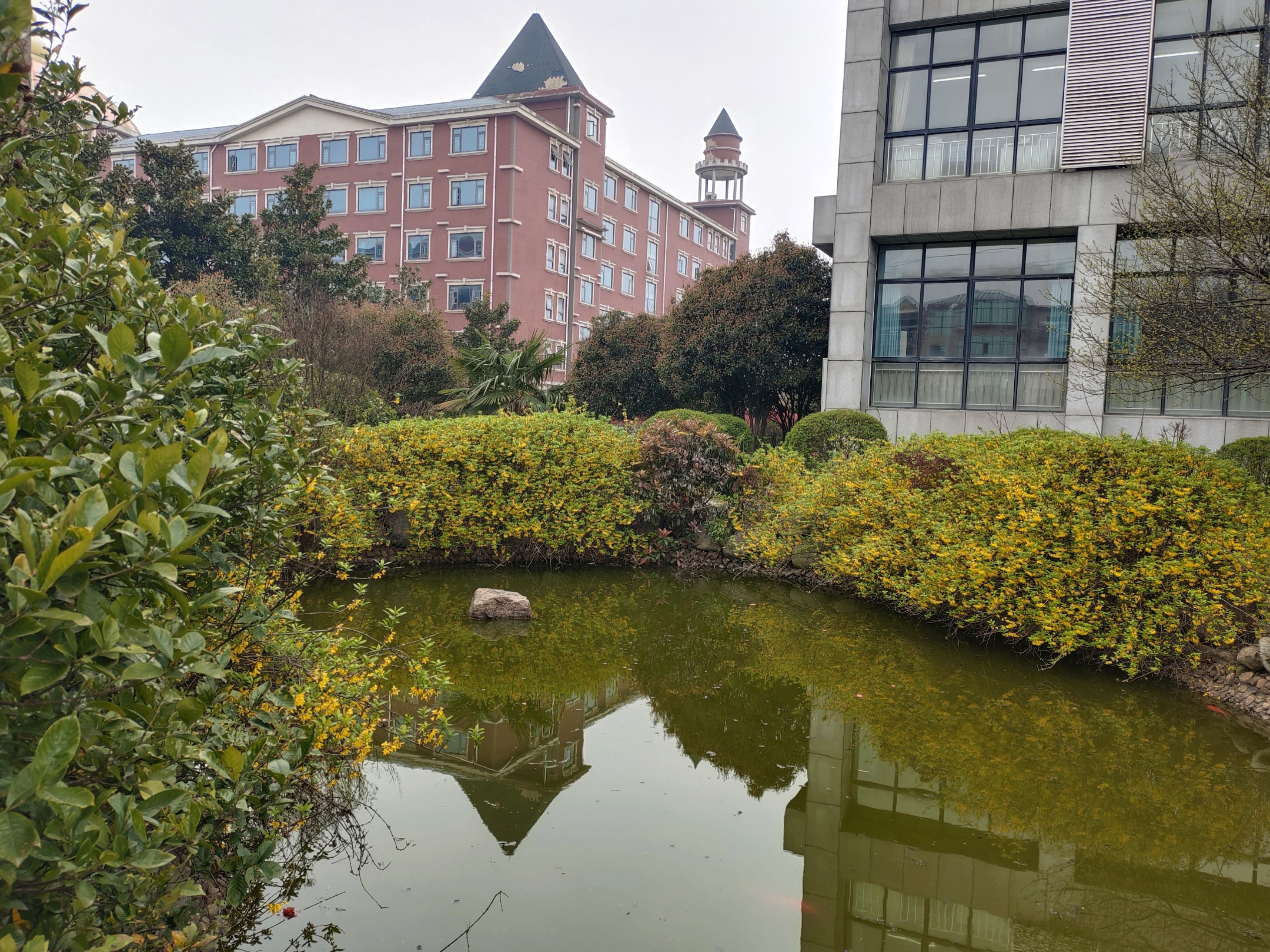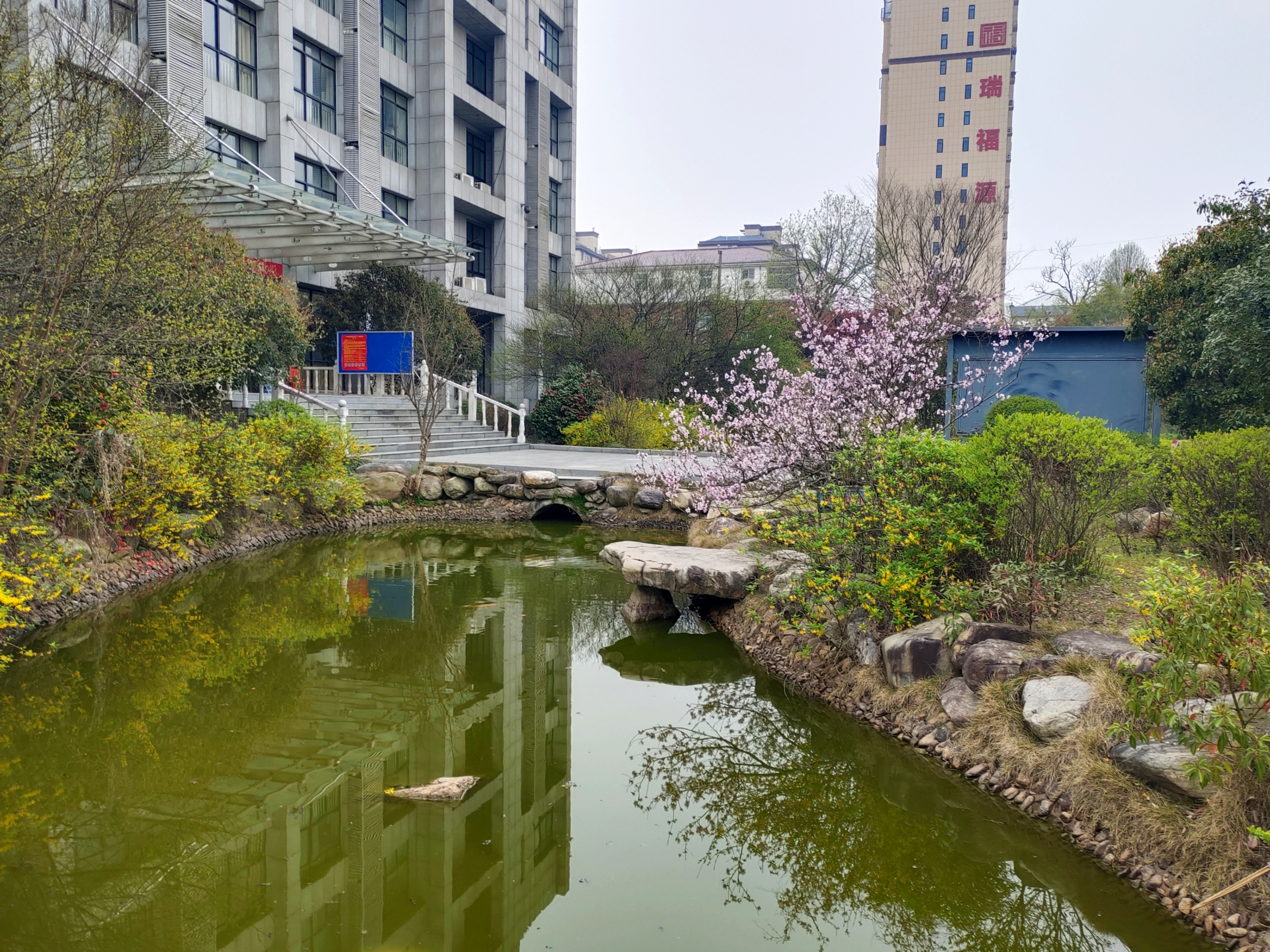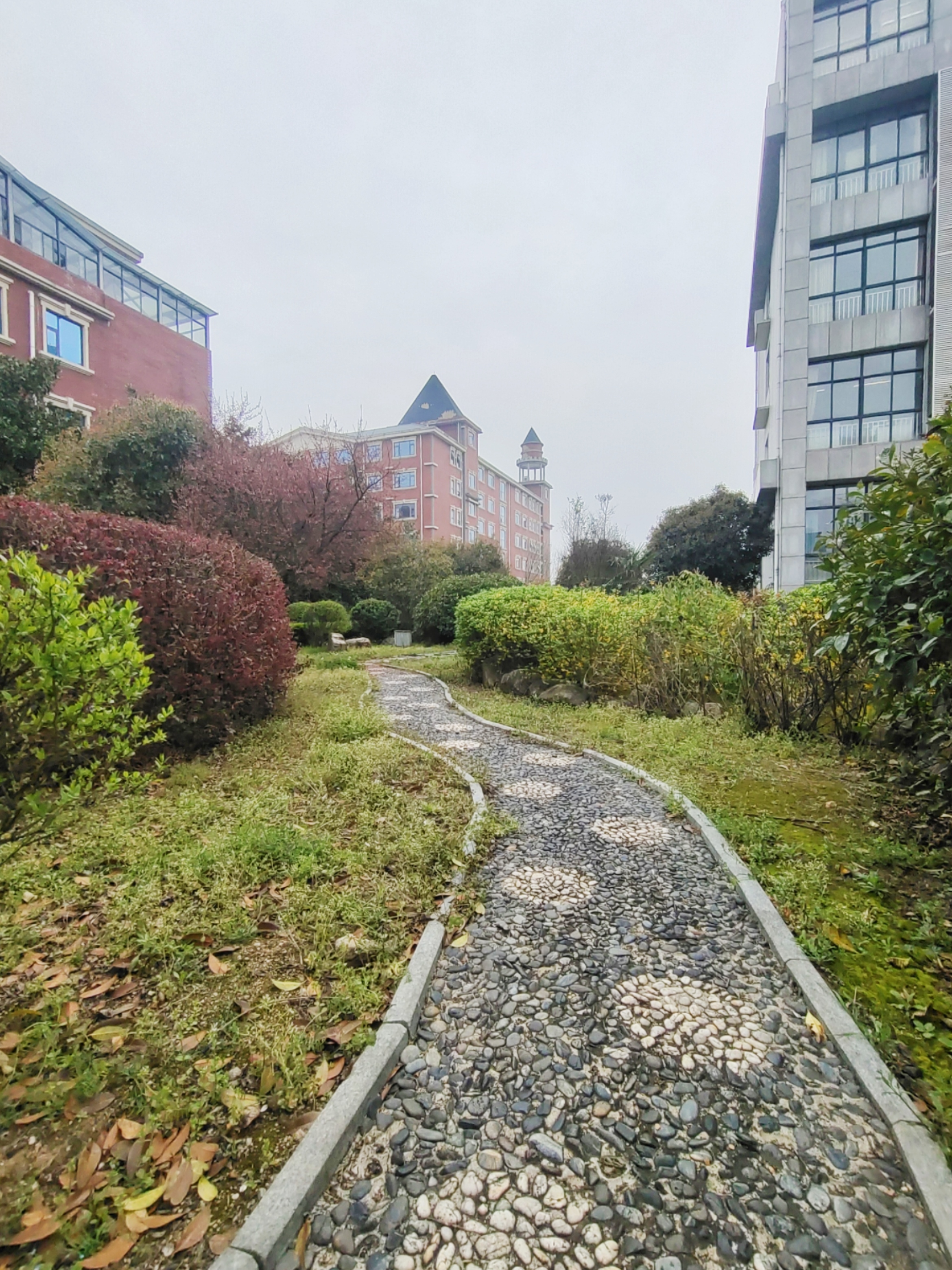 鹅卵石小径蜿蜒,木桥静卧池塘,樱花与黄花映红砖,倒影摇曳,春在建筑与自然间低语。