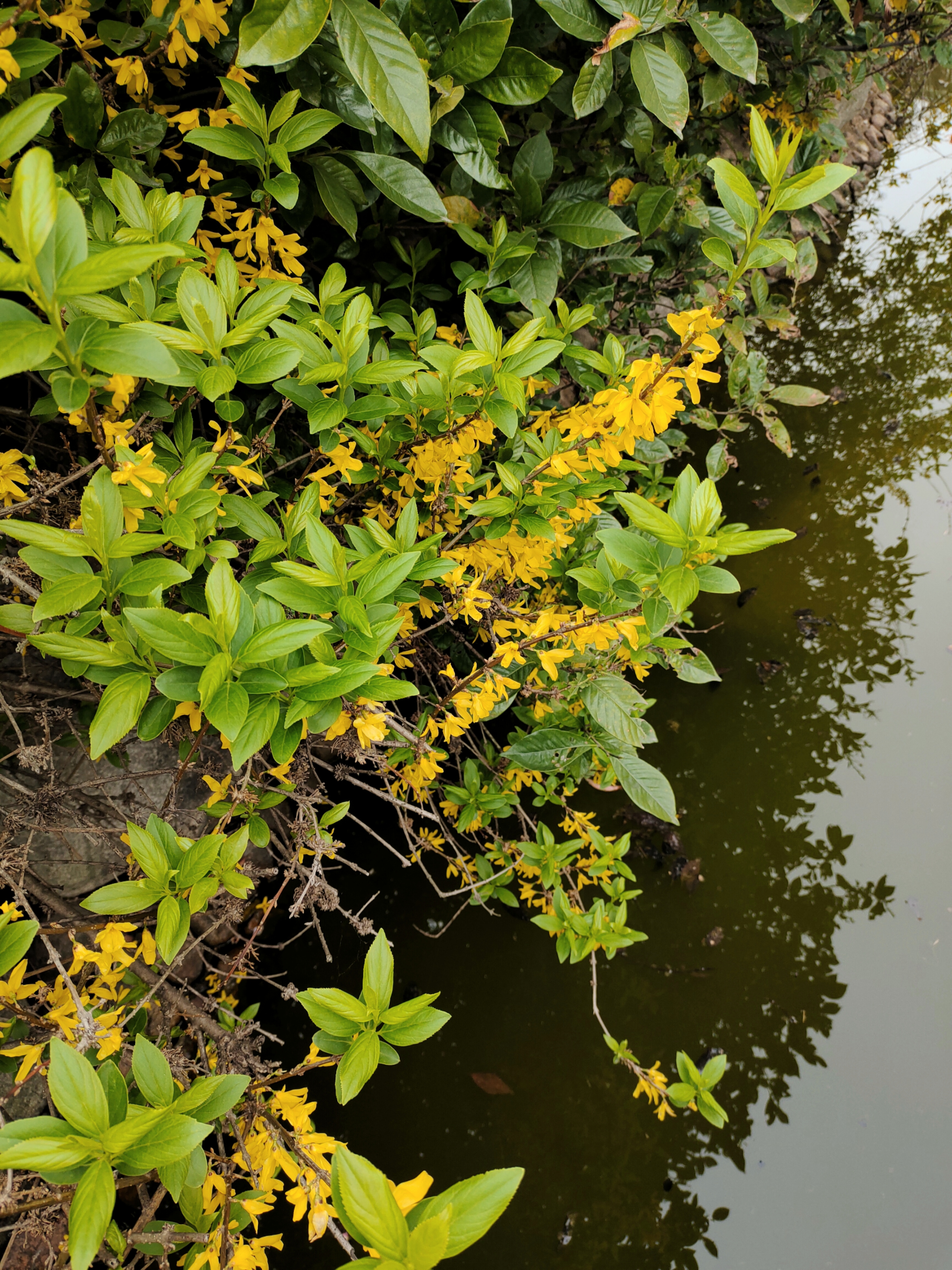 连翘金黄映水边,绿叶轻摇碎影间;春光潋滟,一池浮金,静听花开的私语。