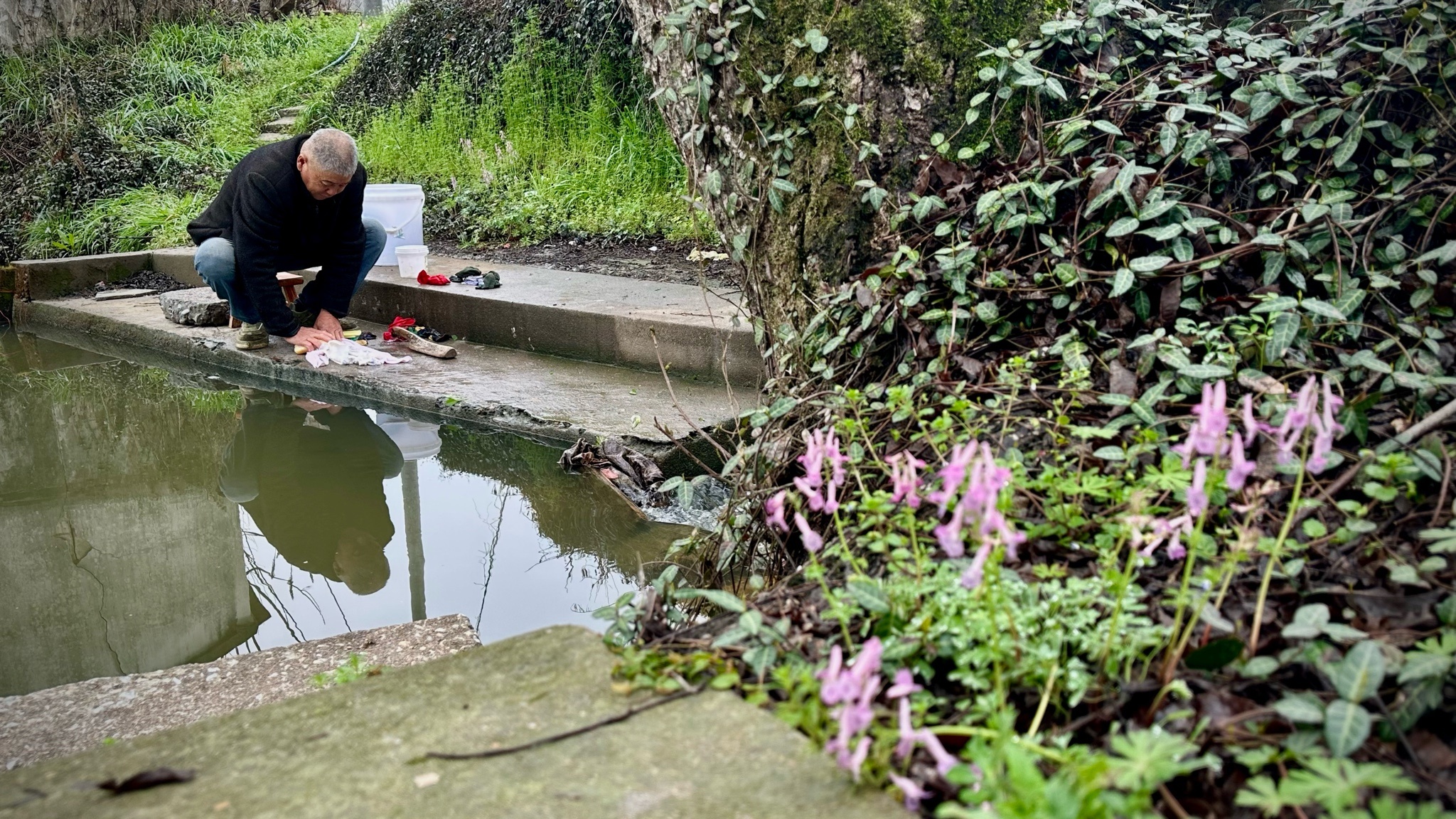 《溪边》石阶青苔映倒影,老人浣衣水边静。粉花缀绿树影斜,一池春色洗尘心。