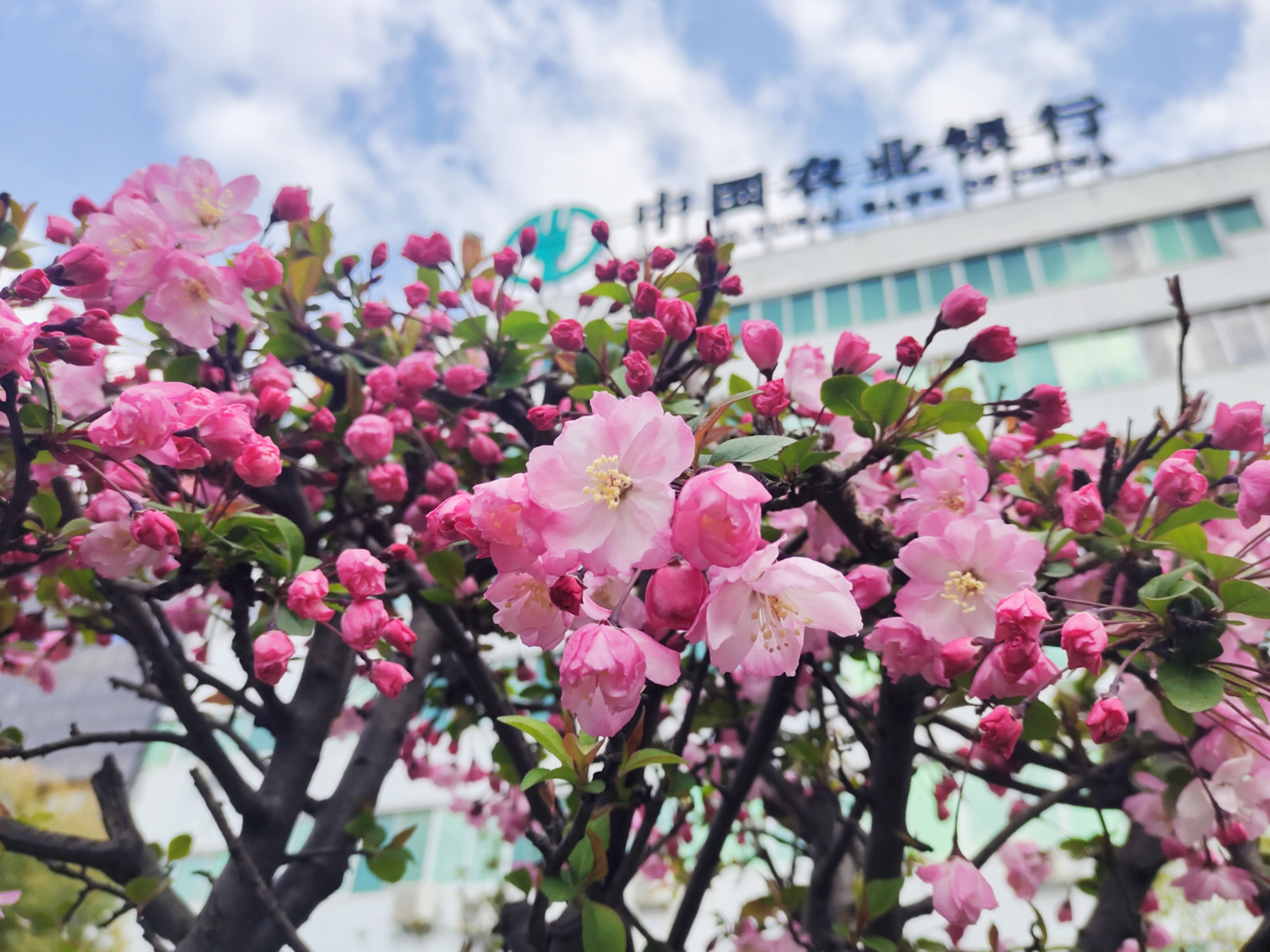 农行楼前樱花开了!粉云缀蓝天,花枝探窗棂,春日citywalk随手一拍就是壁纸。