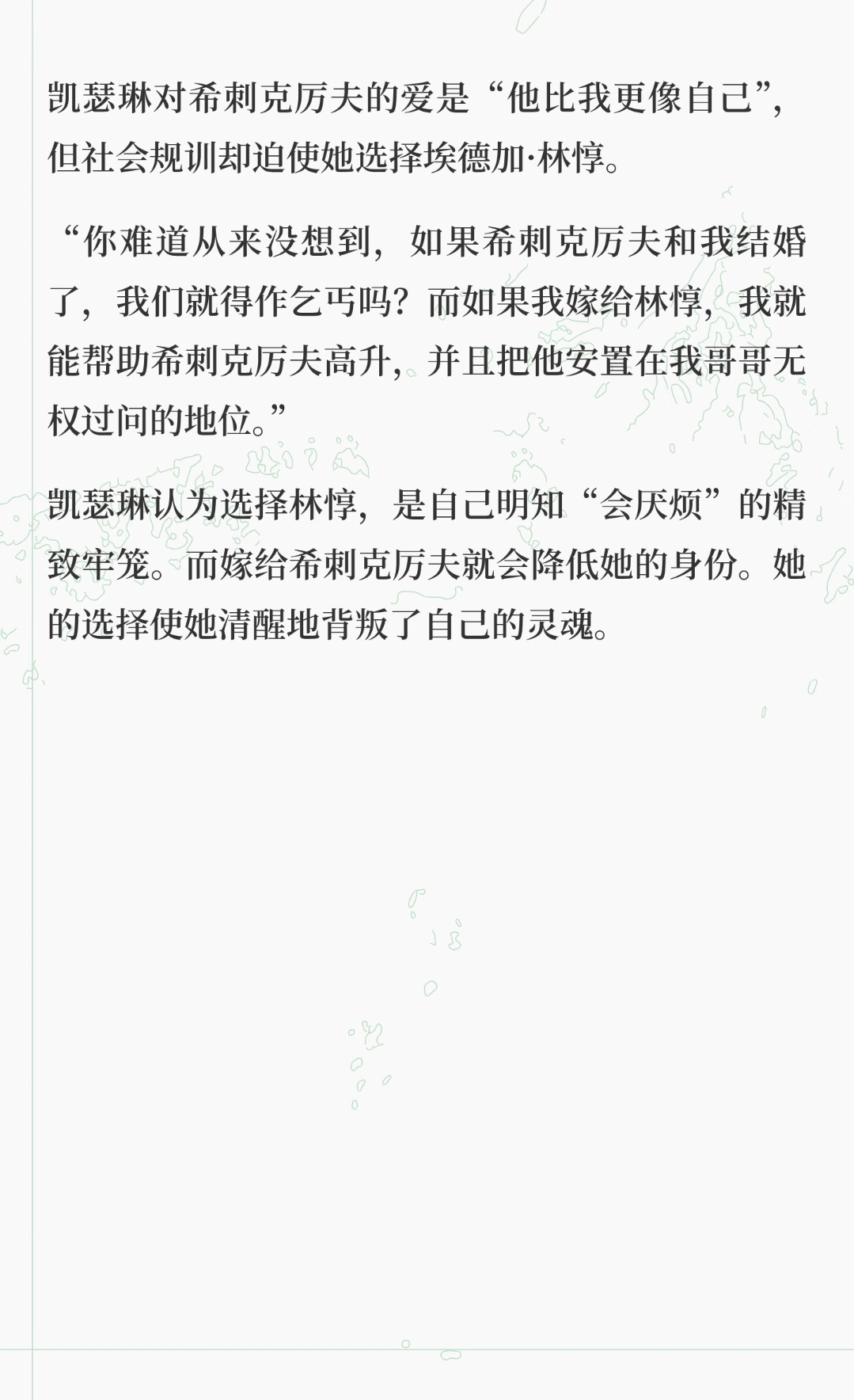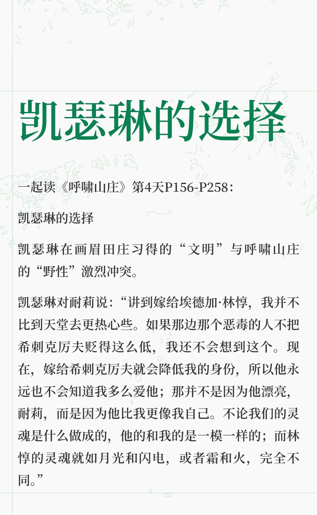 文学经典 | 《呼啸山庄》(四) 一起读《呼啸山庄》第4天156-258页: 凯瑟琳的选择 凯瑟琳在选择埃德加·林惇与希刺克厉夫之间挣扎。 尽管希刺克厉夫与她更像,但社会规训迫使她选择林惇,认为这会让她保持身份,却也意味着她背叛了自己的灵魂,陷入“会厌烦”的精致牢笼。