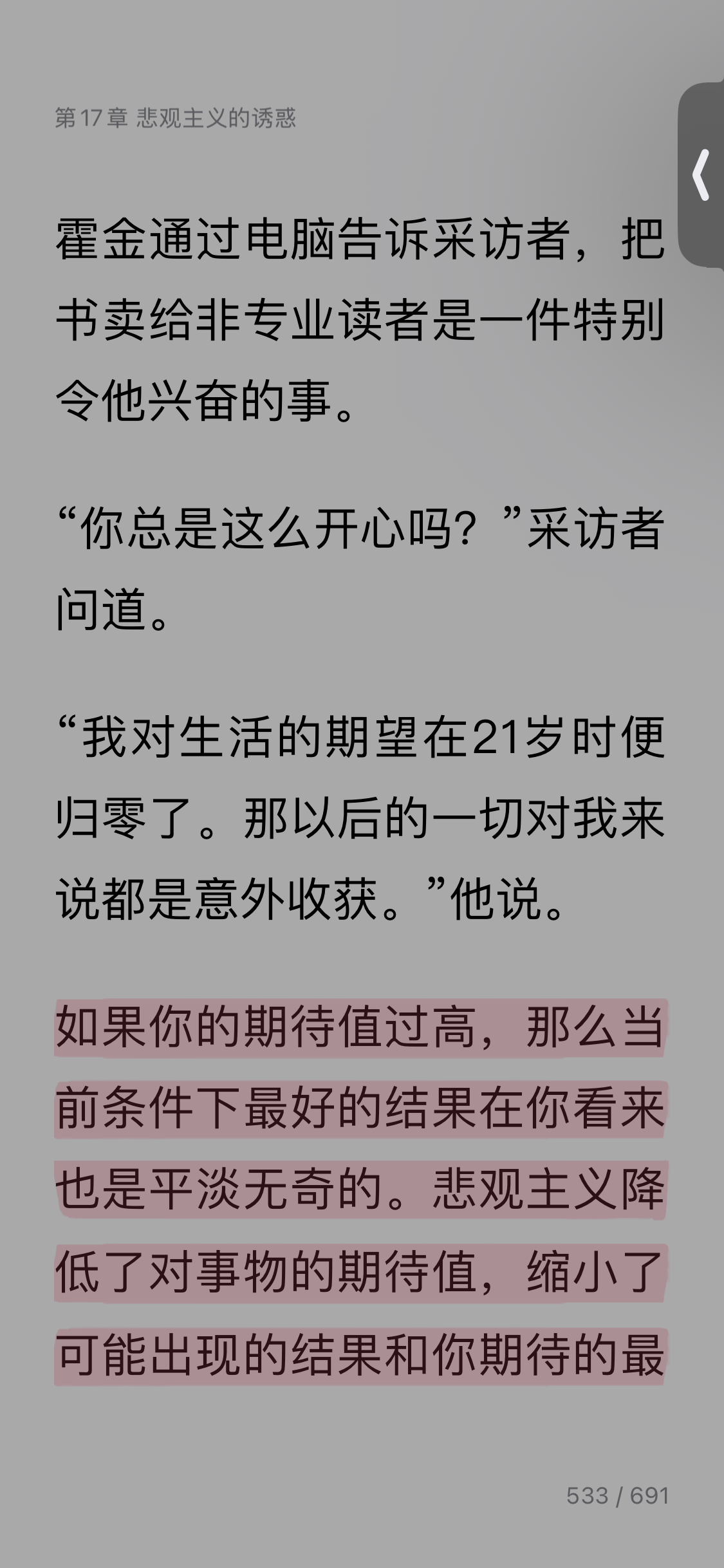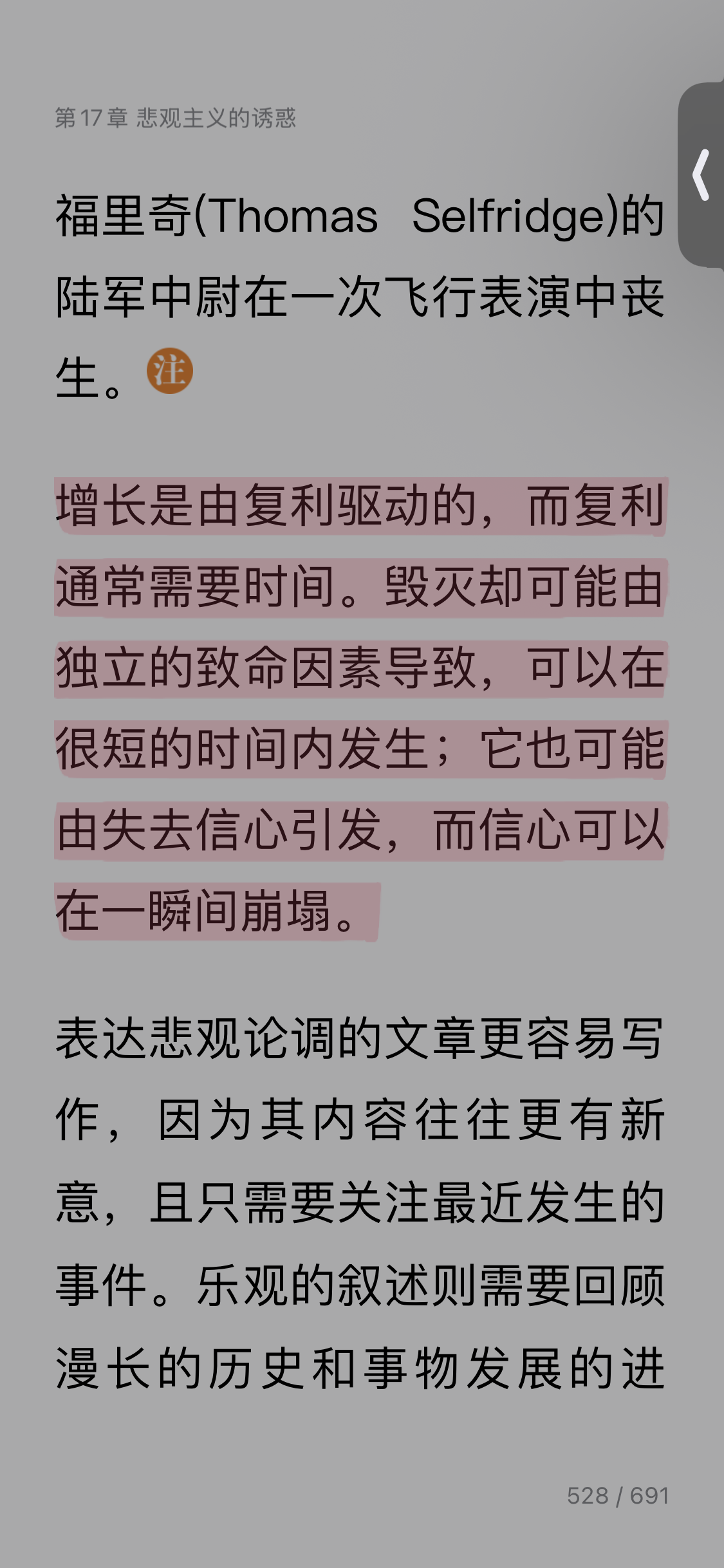 Day21: 今天继续阅读:《金钱心理学》。 今天读了第十六章和第十七章,我觉得讲得很透彻,它让我真正理解了泡沫经济是怎么形成的,也想起亲身经历过的疯狂房产市场,连我这样对理财这么白痴的人都感到人人抢房的可怕之处。也明白了在理财方面原来投资目标不是赚多少,而是长期还是短期,这背后的区别到底什么,所以学习别人一定要搞清楚别人玩的是什么游戏,不要盲目跟风,现在回想还好当时买房没有跟风,否则在当年被骗之上再砍自己一刀,那基本上可以去跳楼了。第十七章介绍了悲观主义的诱惑,这章节内容挺有意思,我自己是一位悲观主义者,但我很敬仰苏东坡这位乐观主义者,还想学习,而在这章中提到乐观主义者往往不被人看好,尤其是在对大众事件上的乐观,想想也是,当年华为老大说华为的冬天来了,大家都很关注,到现在越活越宽泛了,而外企老大总是说市场潜力大,稳中有升,哪儿哪儿有机会,结果总被员工骂是空画蛋糕。所以对自己的人生长远要乐观,对具体的事件或决策要悲观点,尤其是预期要降低,这样即考虑了风险,又不至于最后结果落差太大,这在旅游方面体会最深,所以我觉得旅游前期准备才是最开心最充满乐趣的阶段。