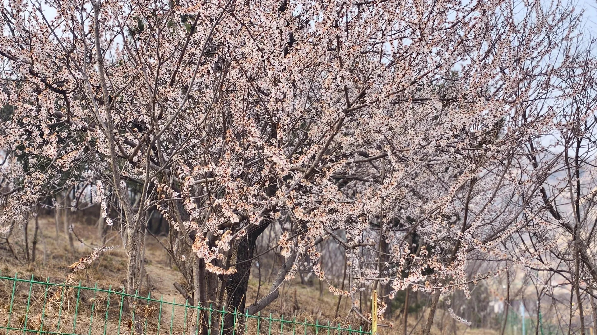 春日林间小径,粉白樱花正盛~枝干交错伸向淡蓝天空,绿围栏边枯黄草地还带着冬的余味,山影温柔铺在远处。随手一框就是电影感!快趁花期未尽,带上相机来吸一口春天~