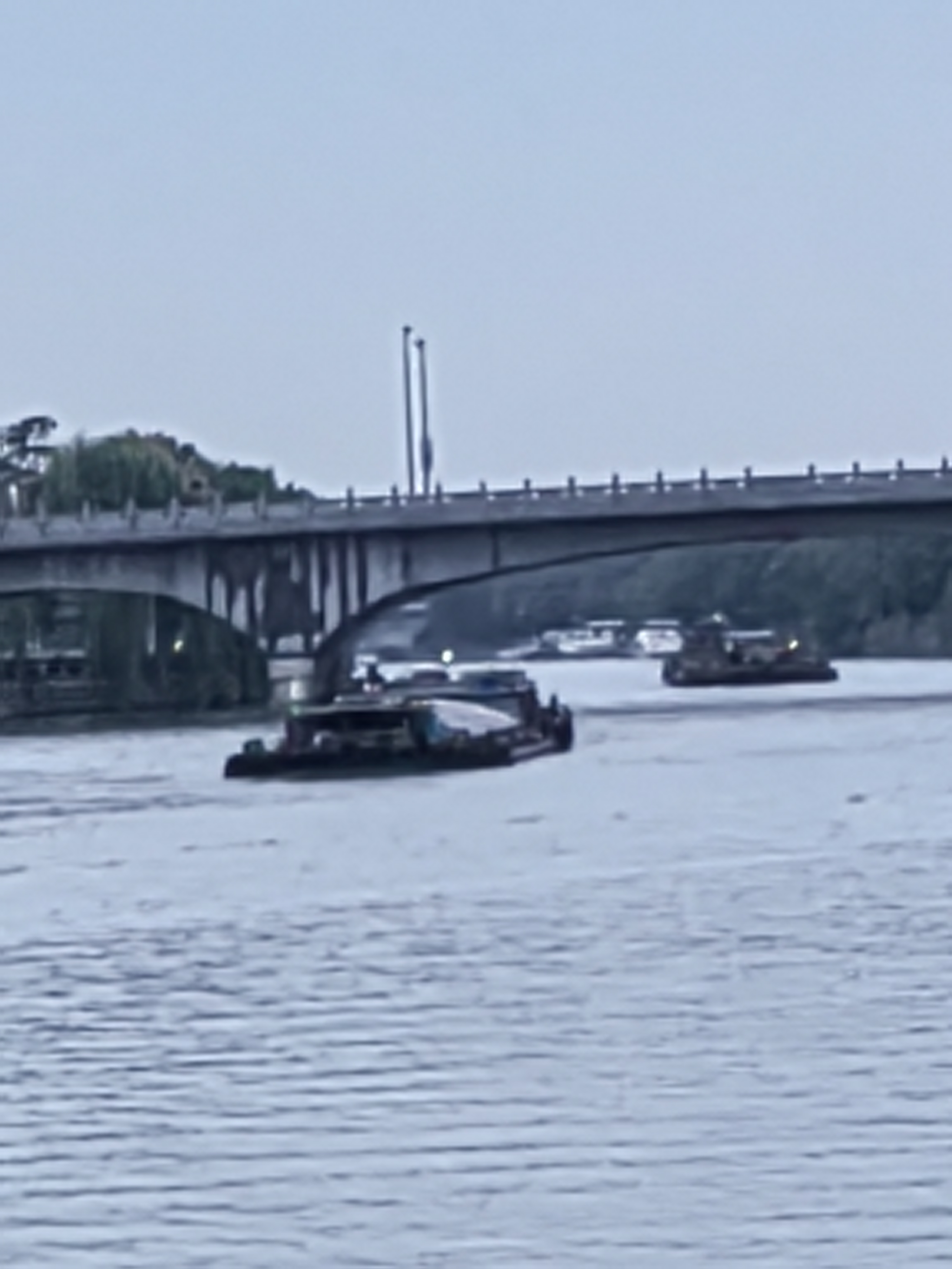 桥下货船悠悠过,拱桥倒影摇晃着树影,天空蓝得刚刚好~