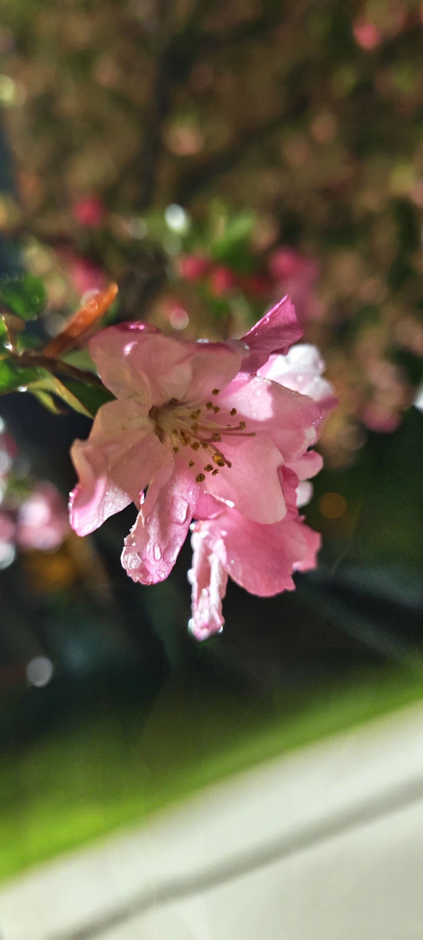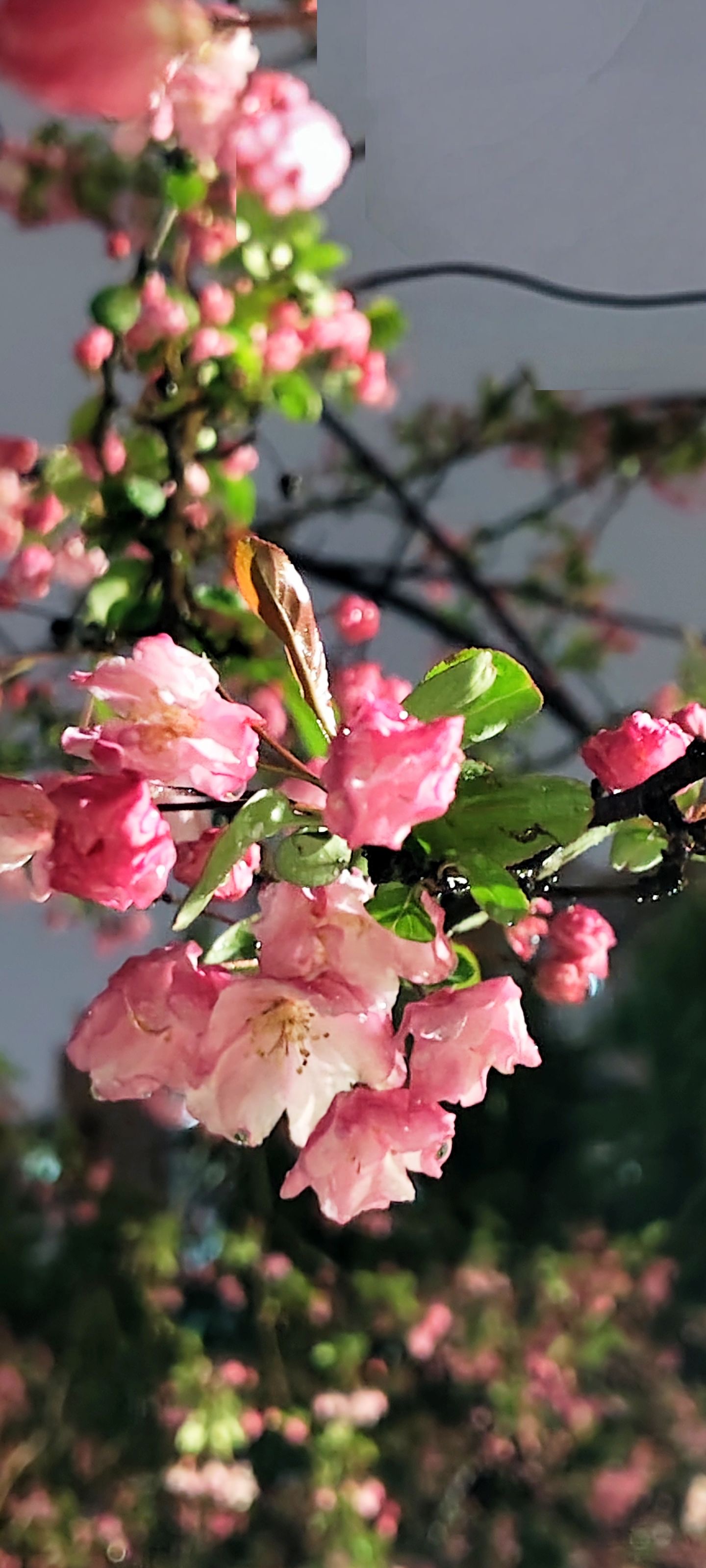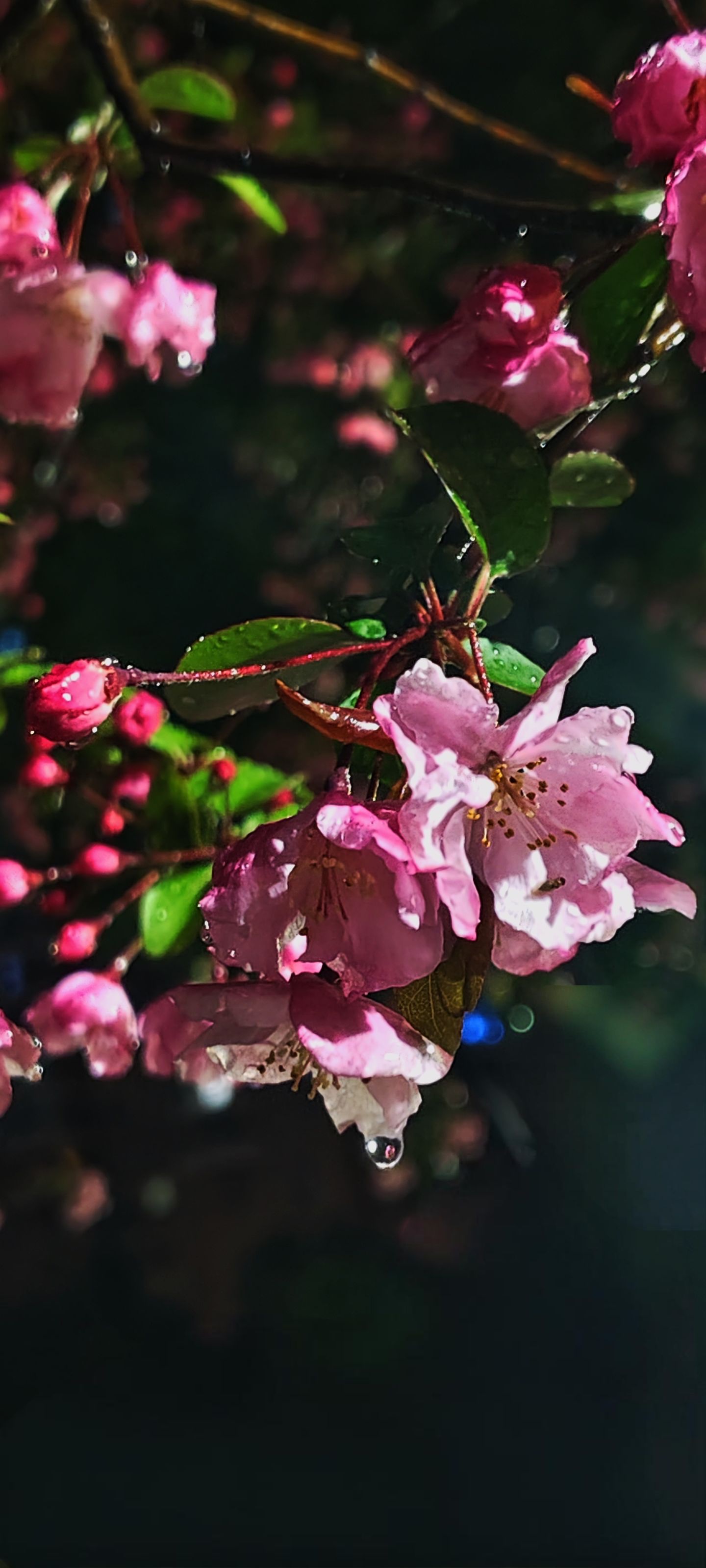 春日花园,粉红花瓣承雨欲滴,晶莹剔透;新绿枝叶衬托花蕾与微露花蕊,生机盎然。湿润光影间,特写镜头凝驻自然之精微——水珠悬于瓣缘,光斑浮于叶脉,静谧中见蓬勃,细微处显磅礴。此乃春之本真,亦是摄影之至境。