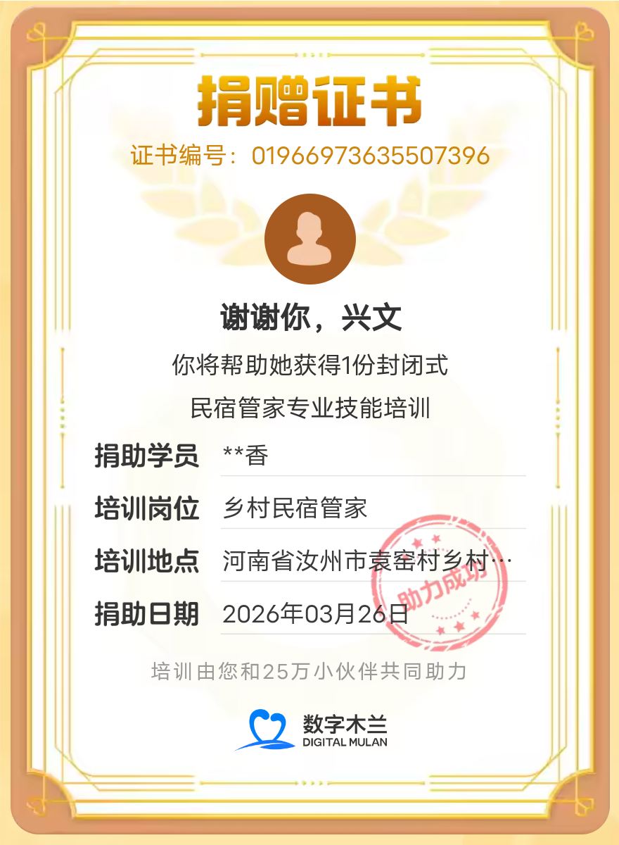 捐赠木兰币,帮助河南妇女参加乡村民宿管家培训