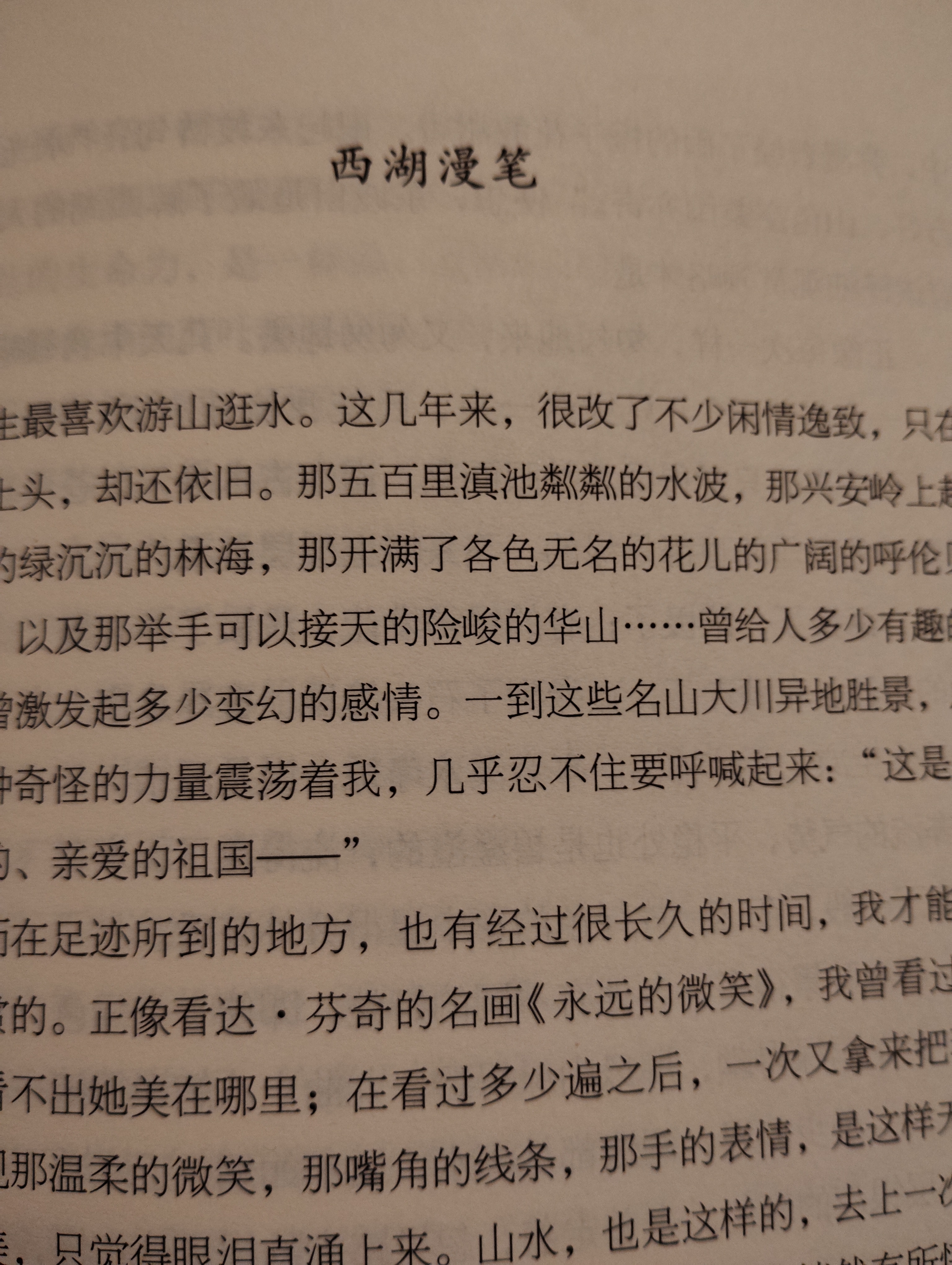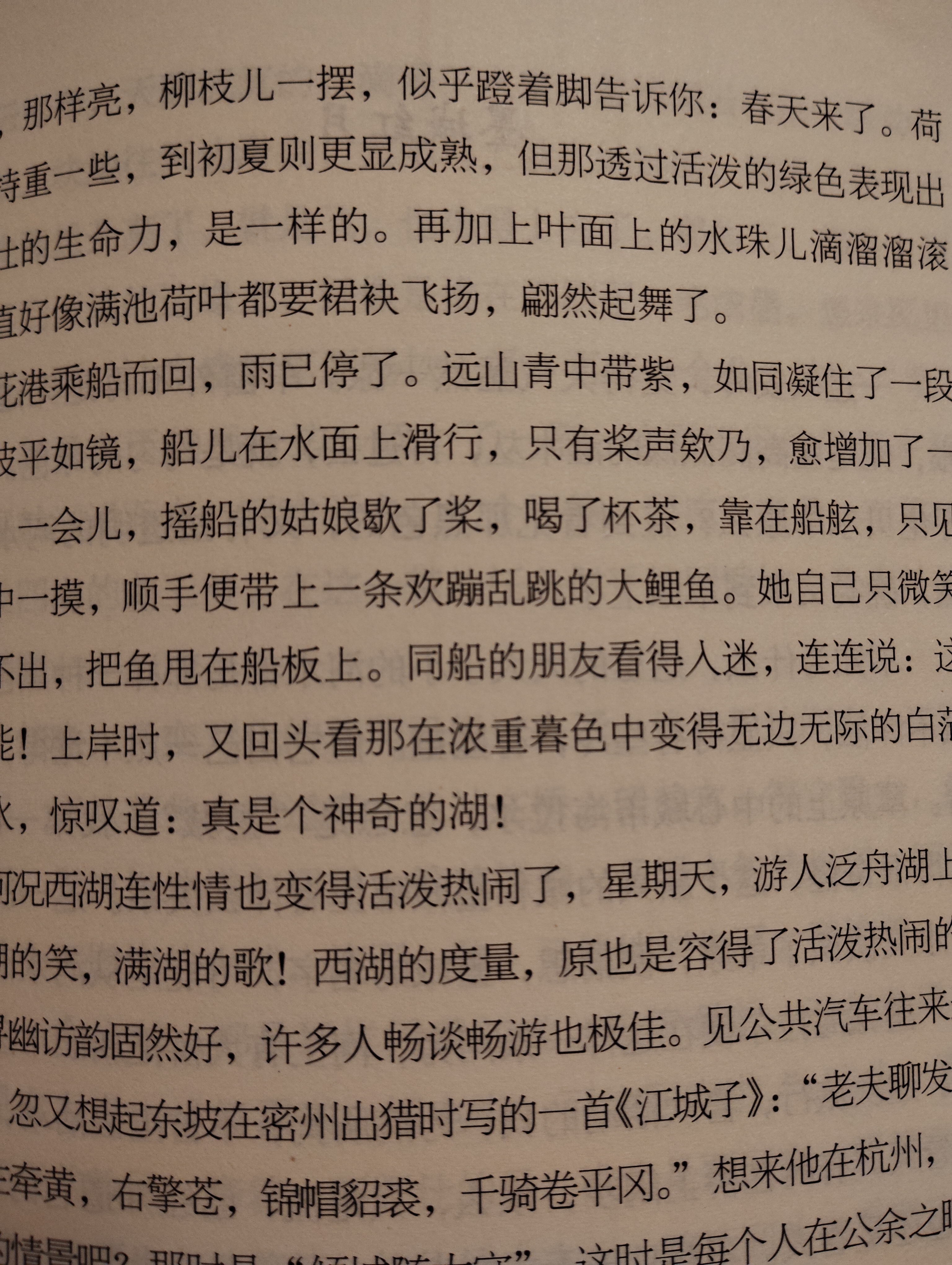 宗璞散文中有一篇西湖漫笔,看到新奇的一段: ……从花港乘船……一会儿,摇船的姑娘歇了桨,喝了杯茶,靠在船舷,只见她向水中一摸,顺手便带上一条欢蹦乱跳的大鲤鱼,她自己只微笑着,一声不出。把鱼甩在船板上,同船的朋友看得入迷,连连说,这怎么可能?…… 是啊!别说顺手捞上一条大鲤鱼,就是摇船的姑娘也从没见过,大妈大嫂也没见过,现如今西湖摇船的都是大老爷们。过去宗璞笔下的遇见,如今更是不可能了。 但她给了我一个遥想的画面,六月的西湖上一个渔家姑娘的身影,摇着船,唱着歌,笑着对你说,她爹爹和西湖的故事,哎,这有何不可?……