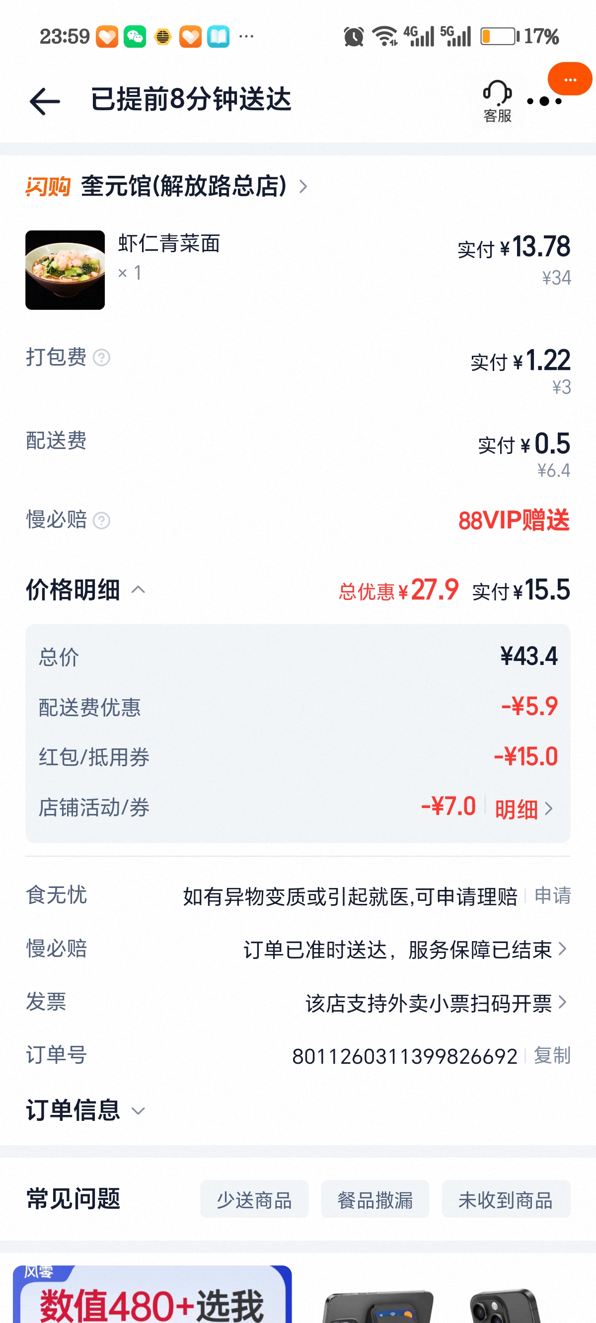 感谢上城区的消费券让我奎元馆的虾仁青菜面价格骤减,吃的饱饱的,好实惠,如果是千问首单更便宜,买了奶茶,加上返利,奶茶用了4毛,经济实惠的中午。