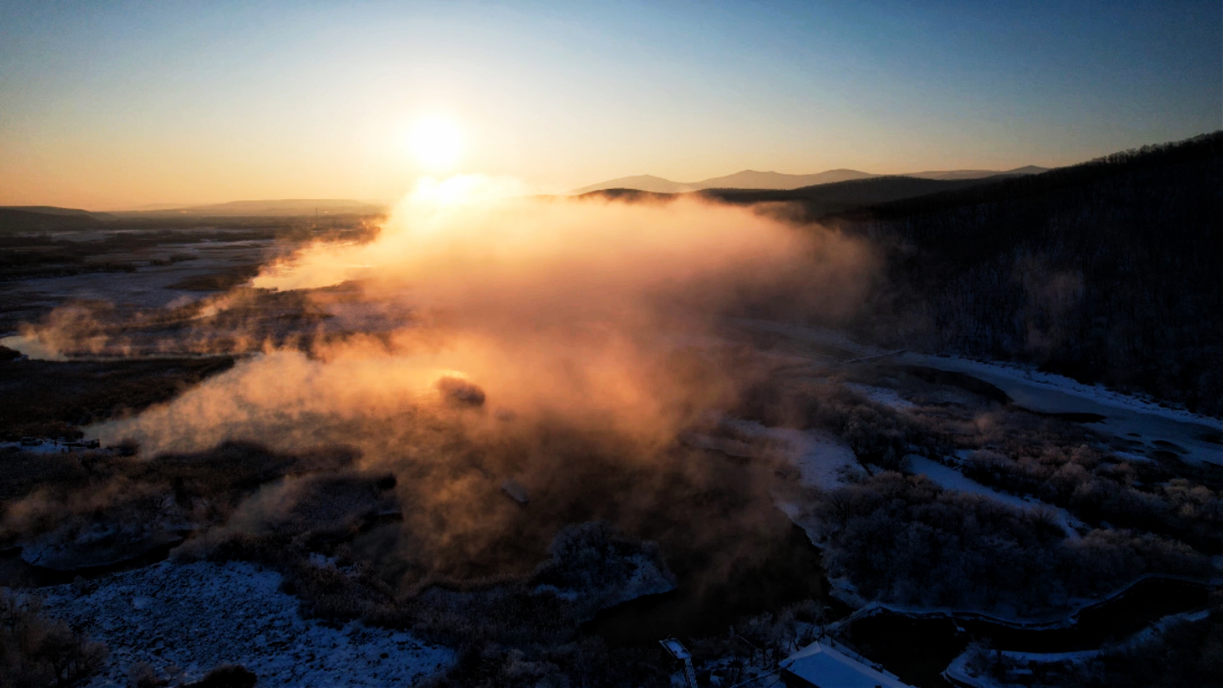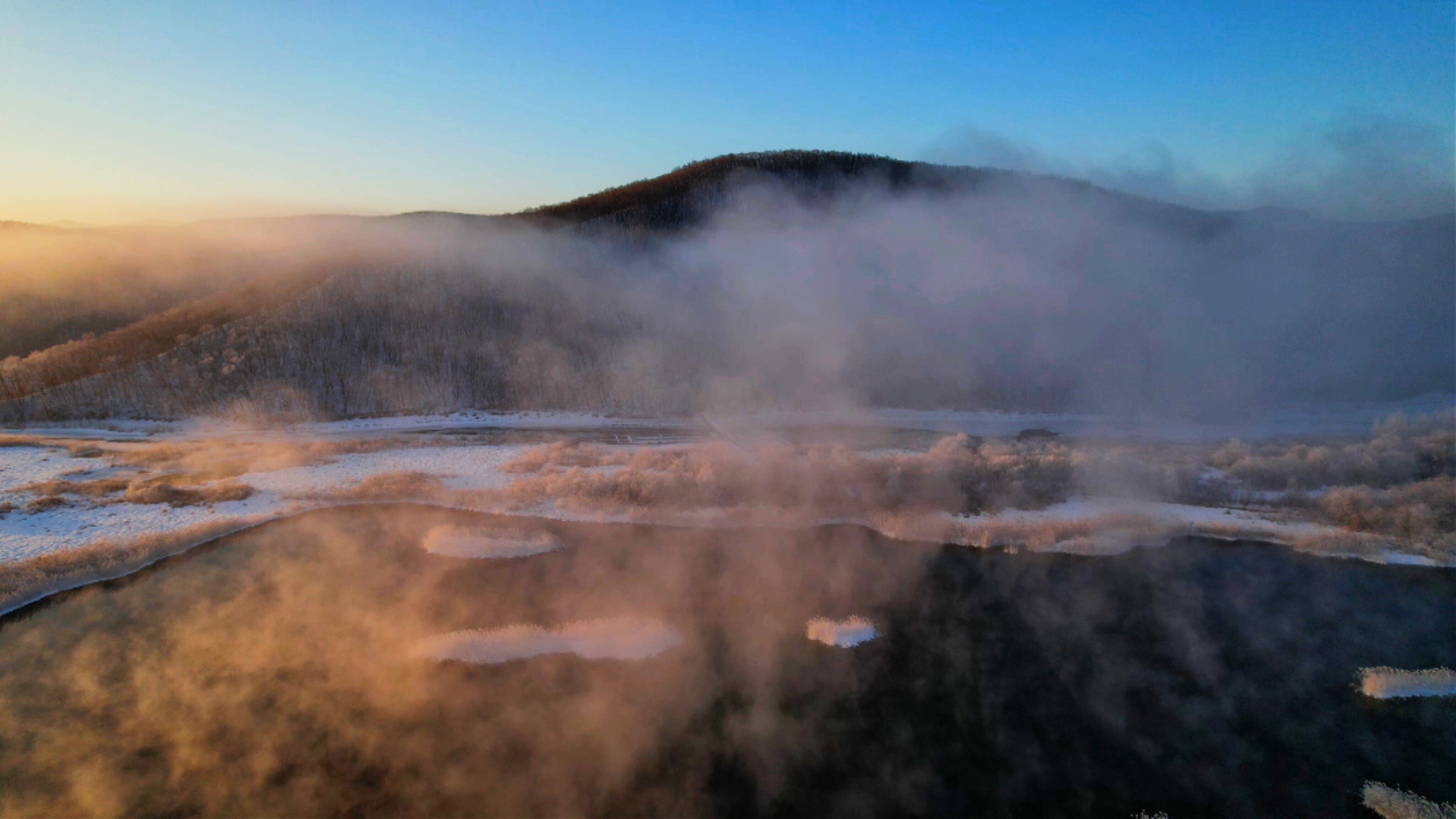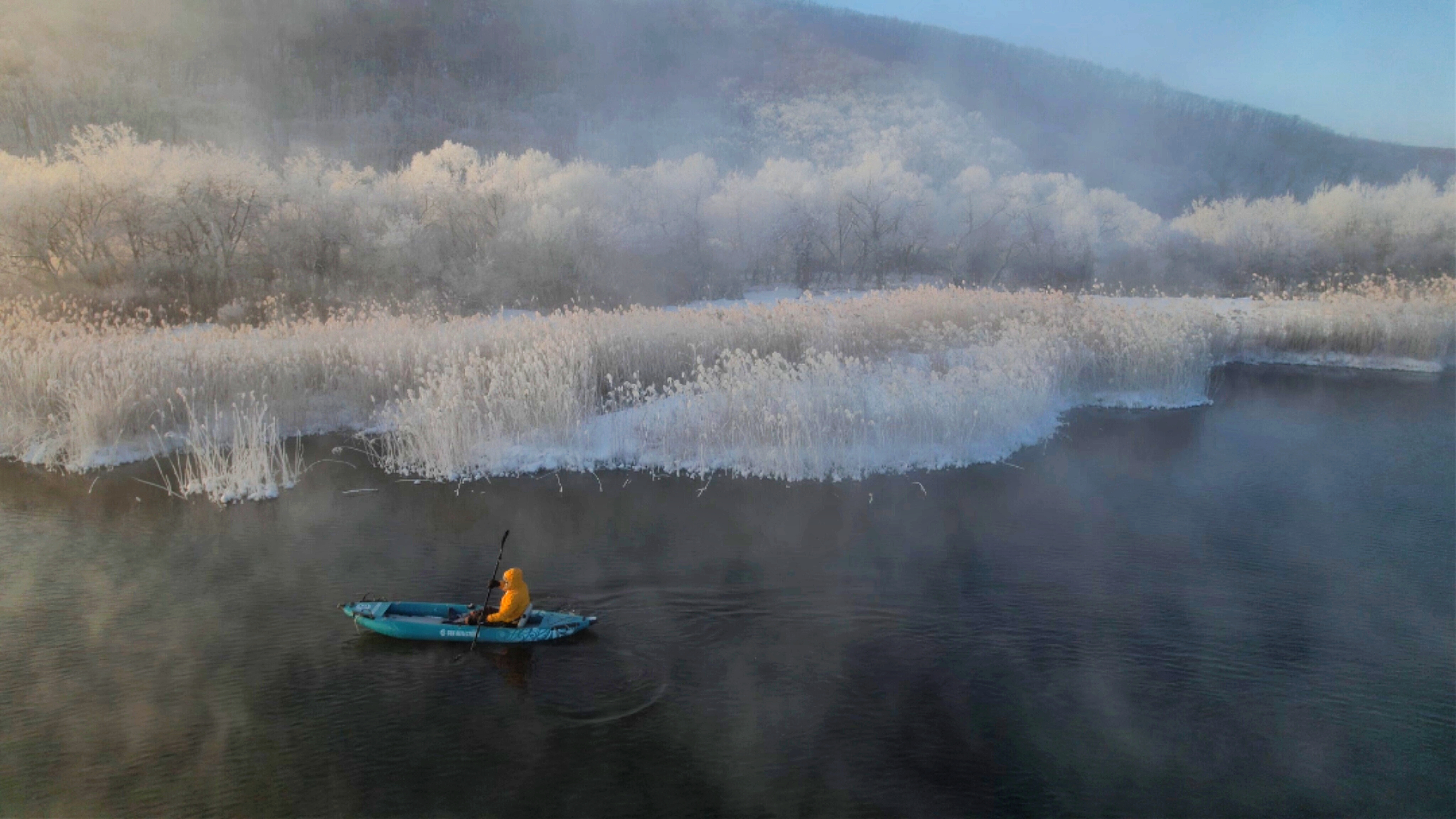 晨光漫过牡丹江的晨,雾凇凝作玉树琼枝,孤舟轻泊在不冻的钻心湖,一湖金红与雪白,静成人间绝色。