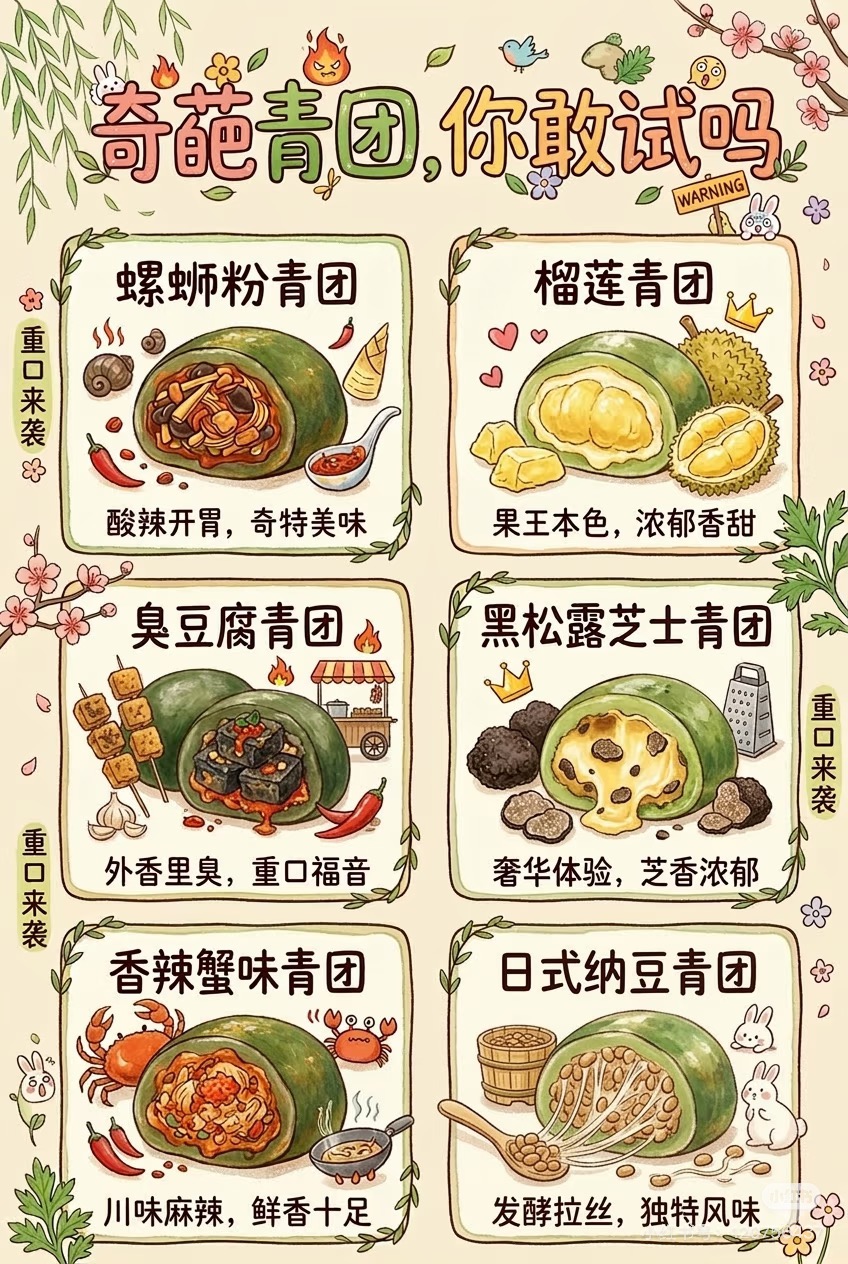 重口味青团,你吃过哪个? 🌸 传统的豆沙、咸蛋黄肉松是不是吃腻了? 今年的青团界简直是开启了“地狱模式”,各路“重口”奇葩口味横空出世!来看看都有哪些让你惊掉下巴的组合!