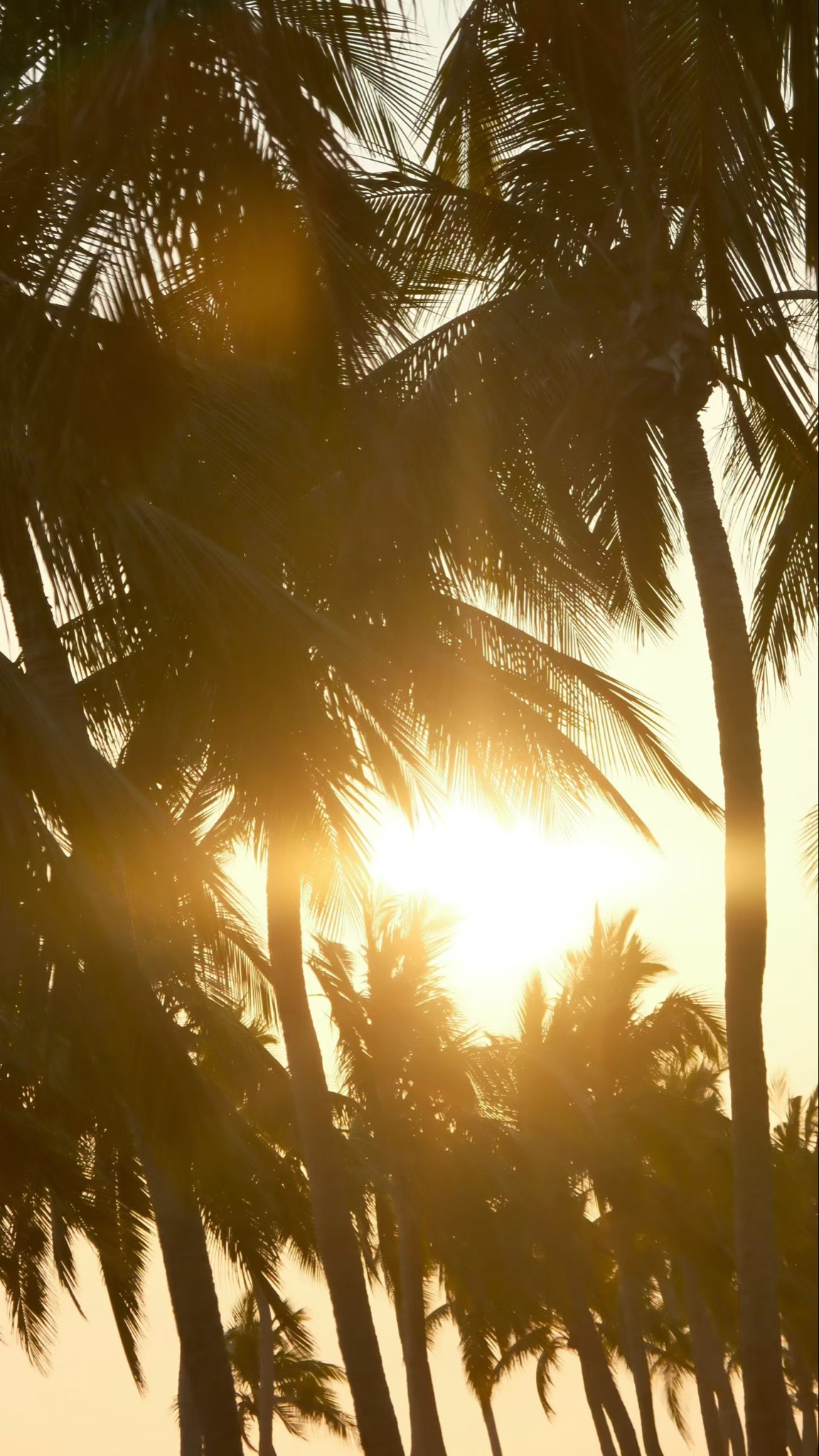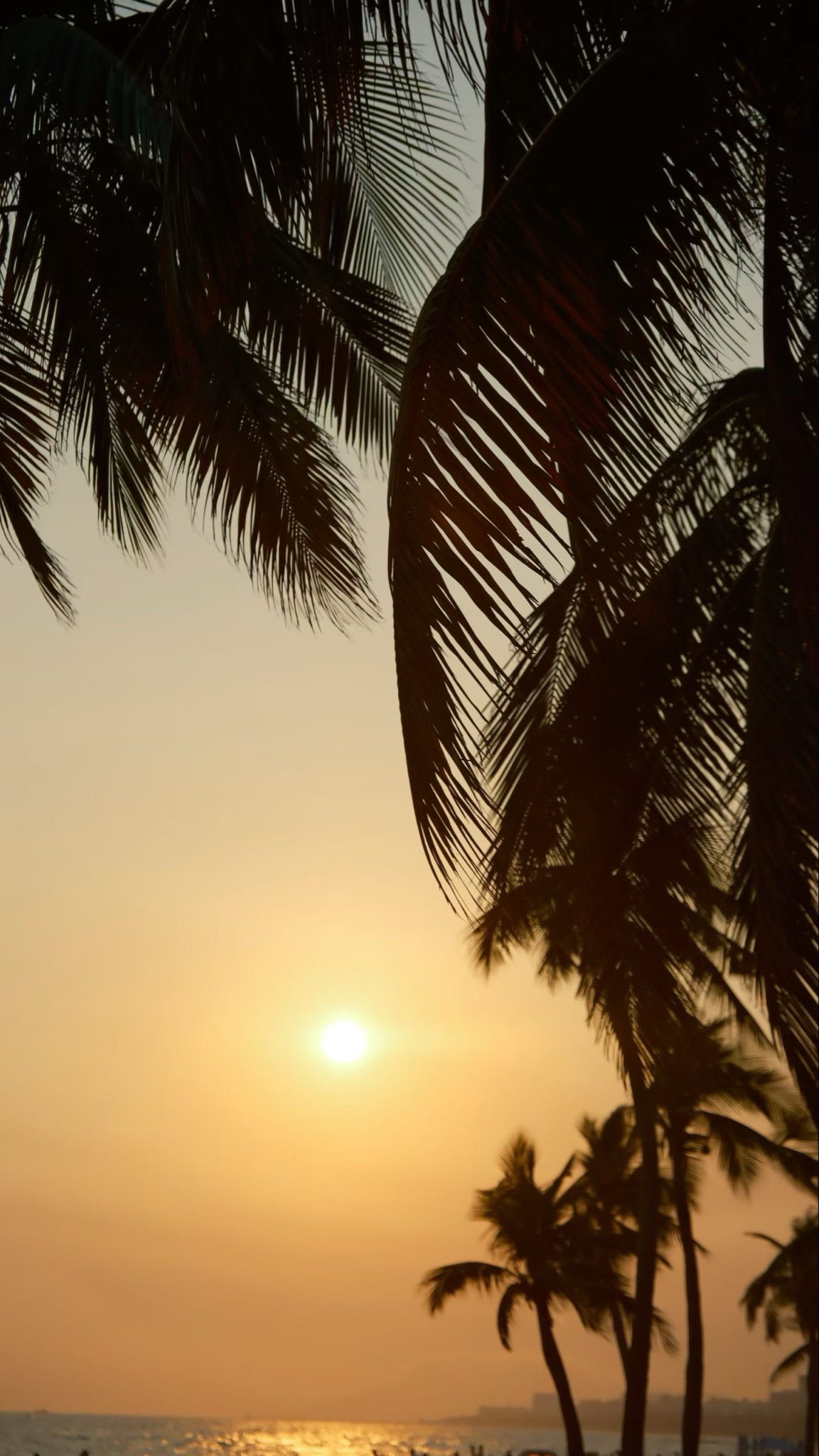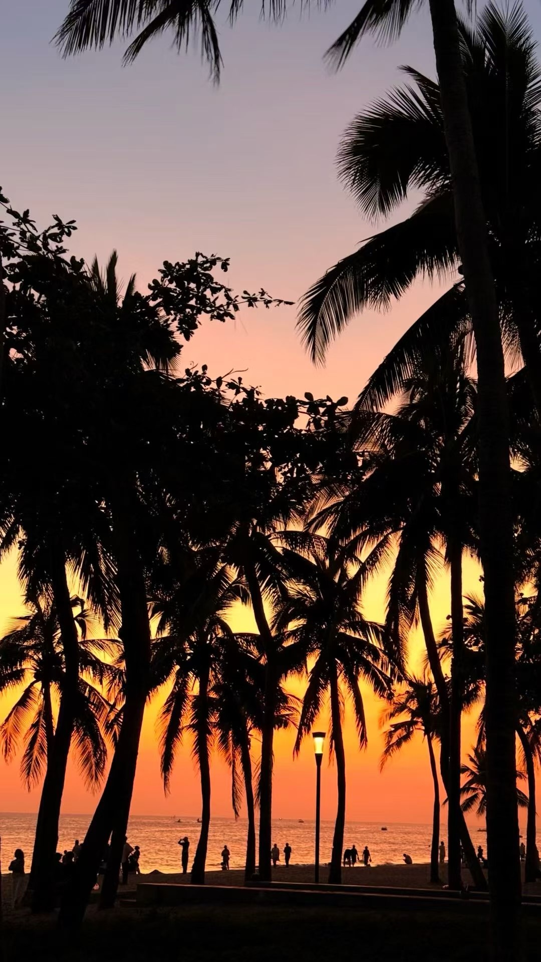 椰影斜斜,落日熔金,海面铺开橘子海;天涯尽头,椰梦长廊里,剪影与渐变天空静静相拥。