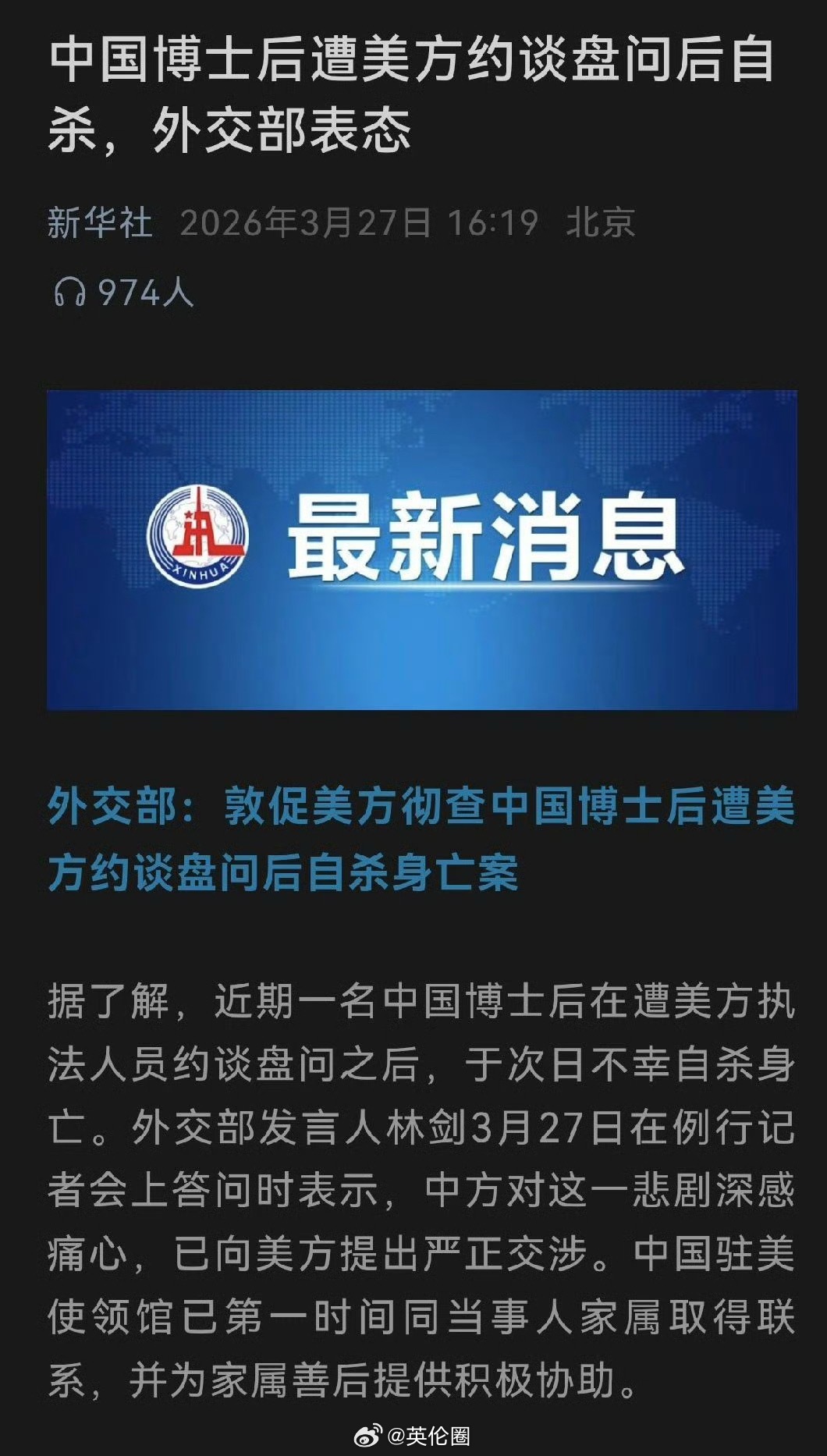 【外交部:敦促美方彻查 中国博士后遭美方约谈盘问后自杀 身亡案】 敦促美方彻查中国博士后身亡案 3月27日,中国外交部发言人林剑在例行记者会上就一名中国博士后在美身亡事件作出回应。据介绍,该名中国博士后在遭美方执法人员约谈盘问后,于次日不幸身亡。中方对此表示深感痛心,并已向美方提出严正交涉。 林剑表示,中国驻美使领馆已第一时间与当事人家属取得联系,并为善后事宜提供协助。他指出,一段时间以来,美方泛化国家安全概念,对中国学生学者进行无端盘查和滋扰,侵犯其正当合法权益,对中美人文交流造成负面影响。中方敦促美方彻查此案,向家属及中方作出负责任的交代,同时停止针对中国学生学者的歧视性执法行为,切实保障相关人员合法权益。(新华社)
