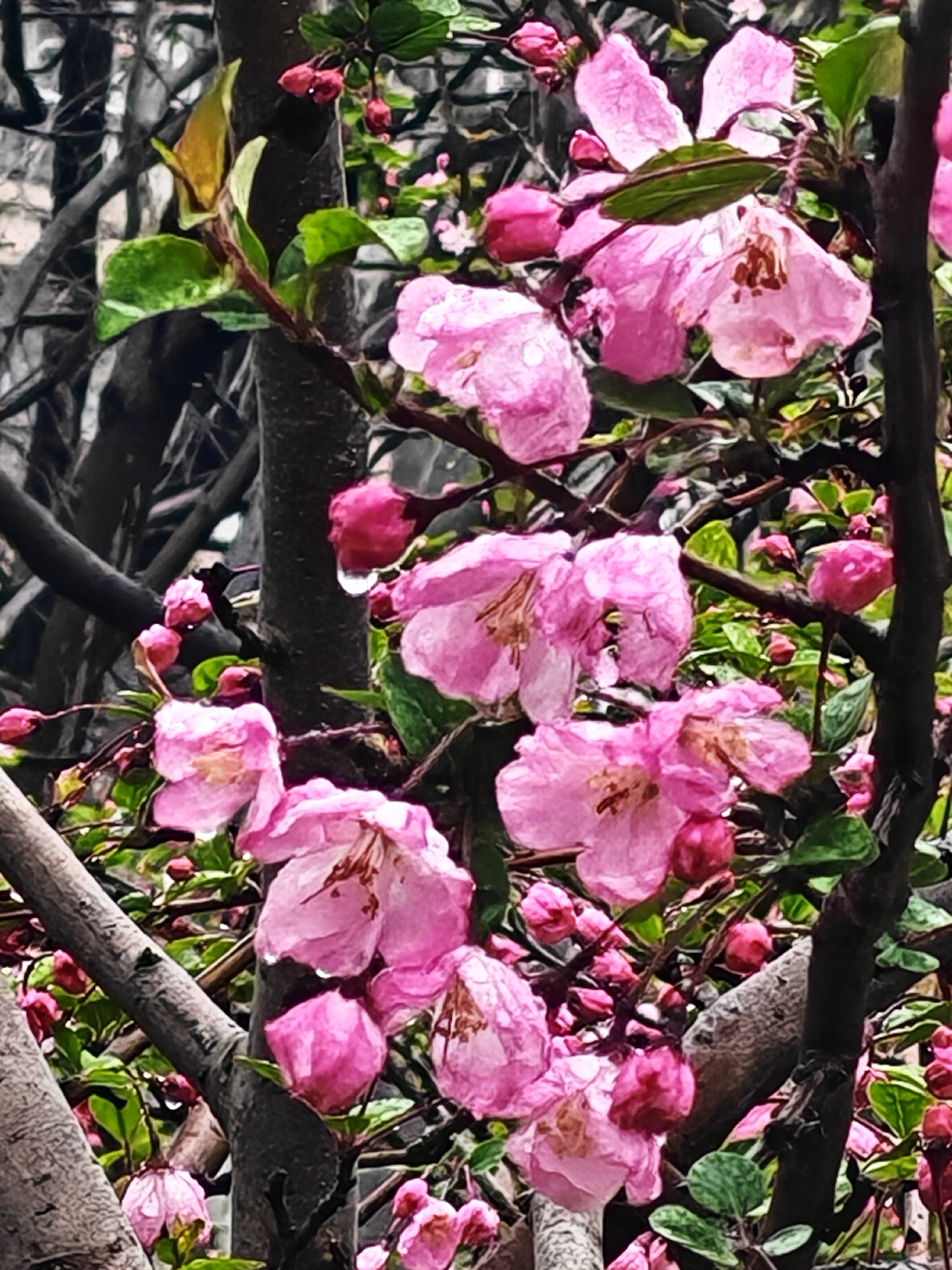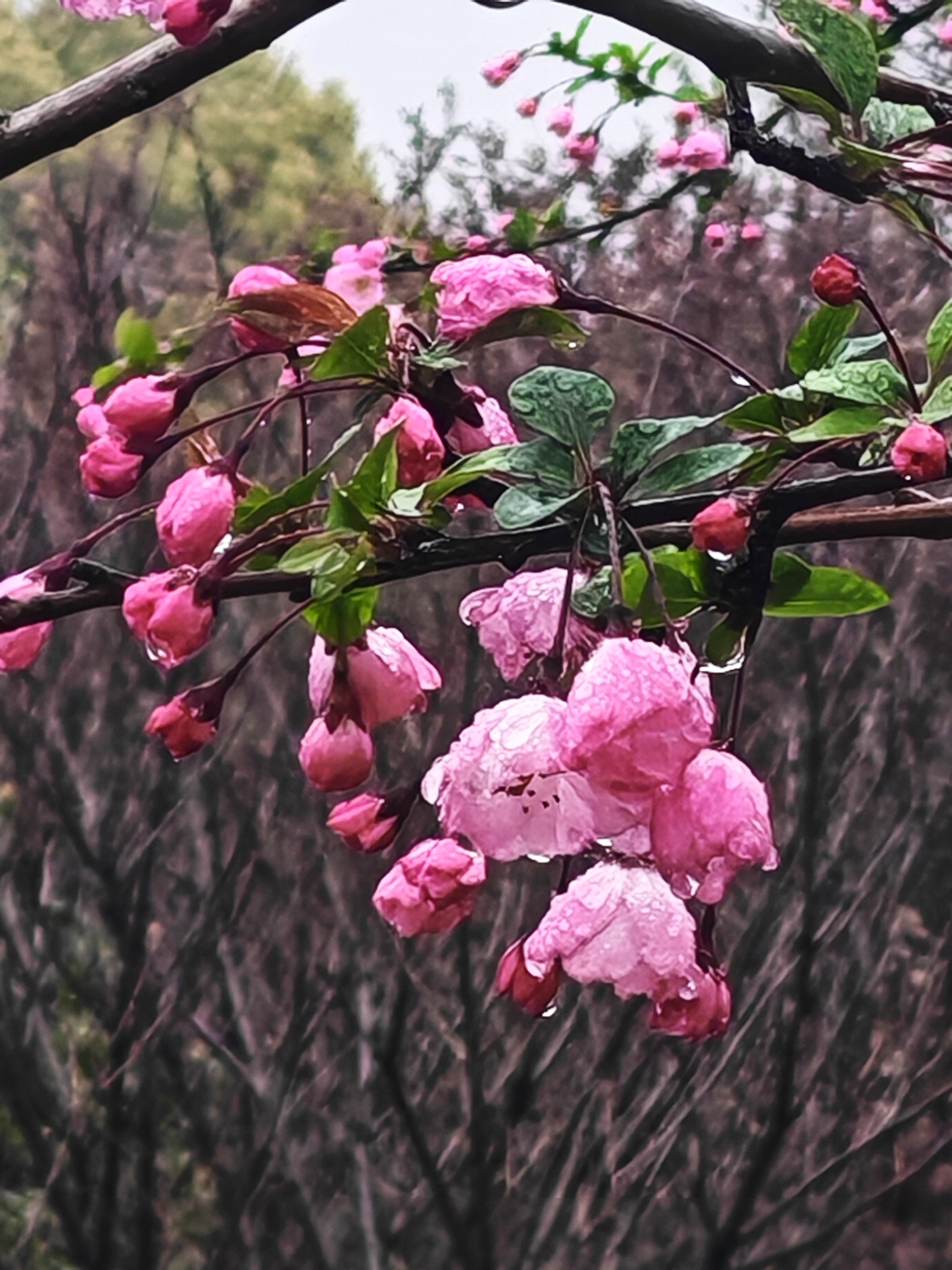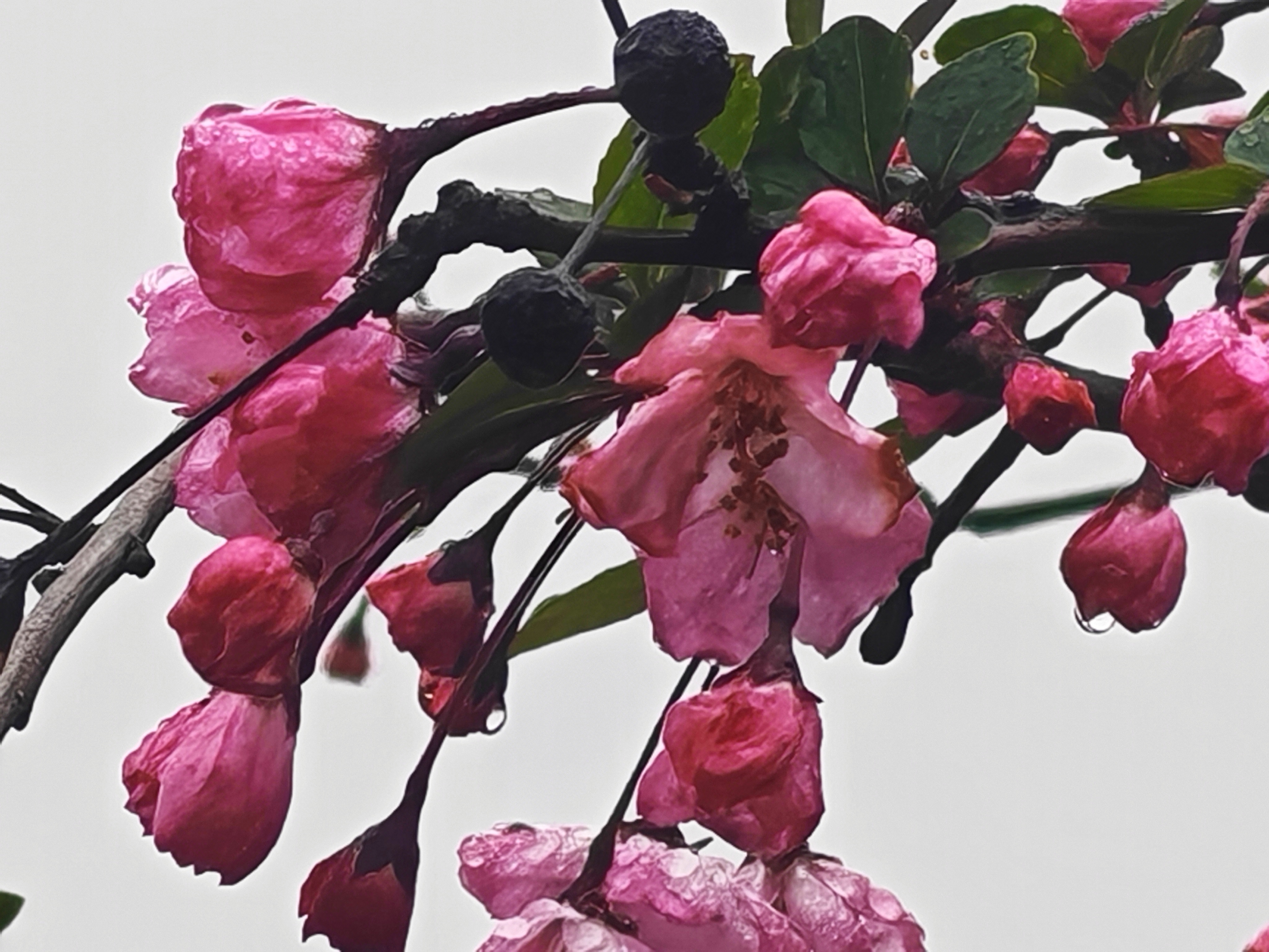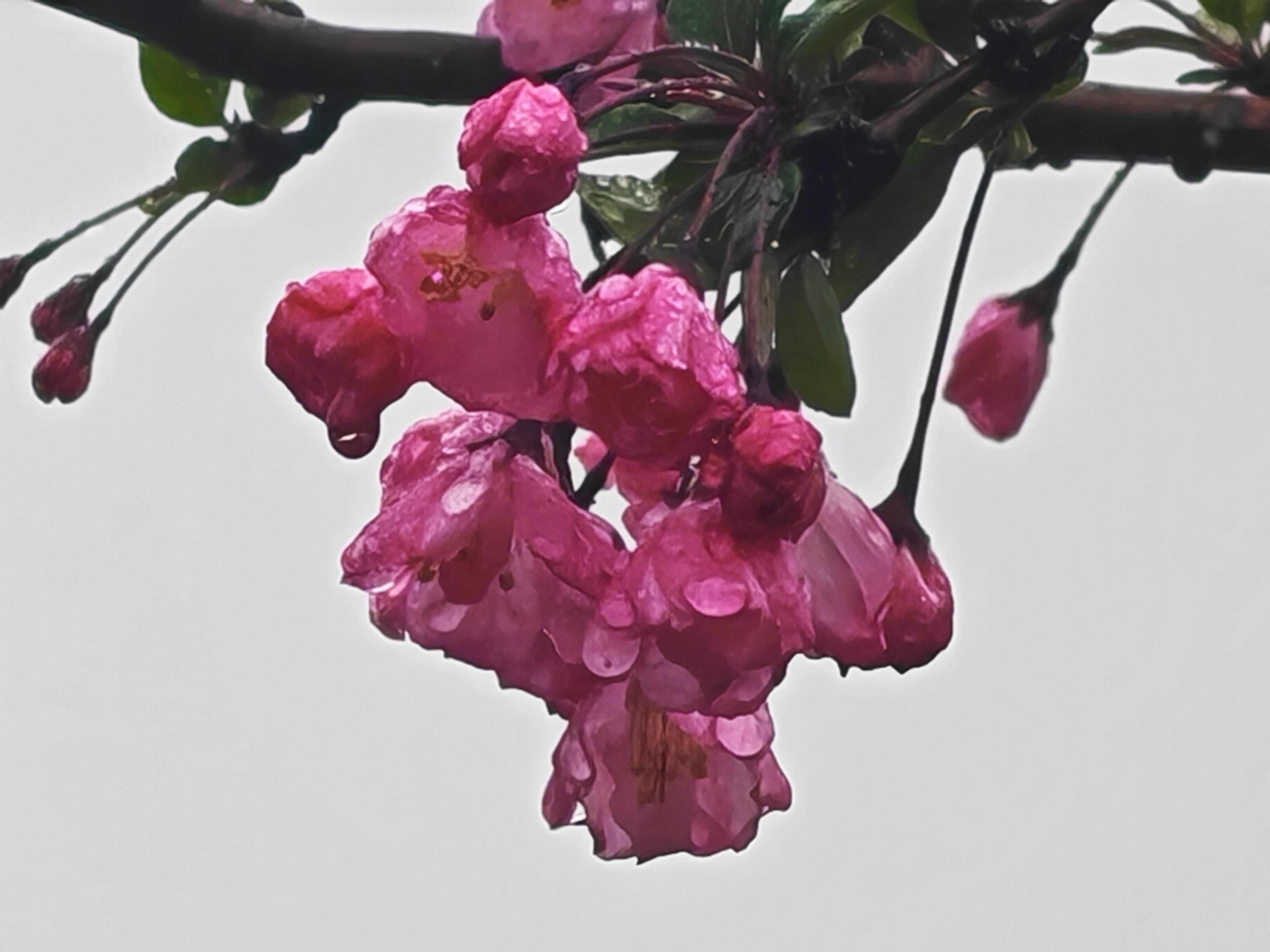 雨中的垂丝海棠,雨丝如线,垂丝海棠的粉瓣便成了被风揉皱的胭脂笺,每一片都洇着水光,像美人垂泪时未干的妆。细长的花梗在雨里弯成温柔的弧度,托着满树湿漉漉的思念,连空气都浸着淡淡的、带着凉意的甜。