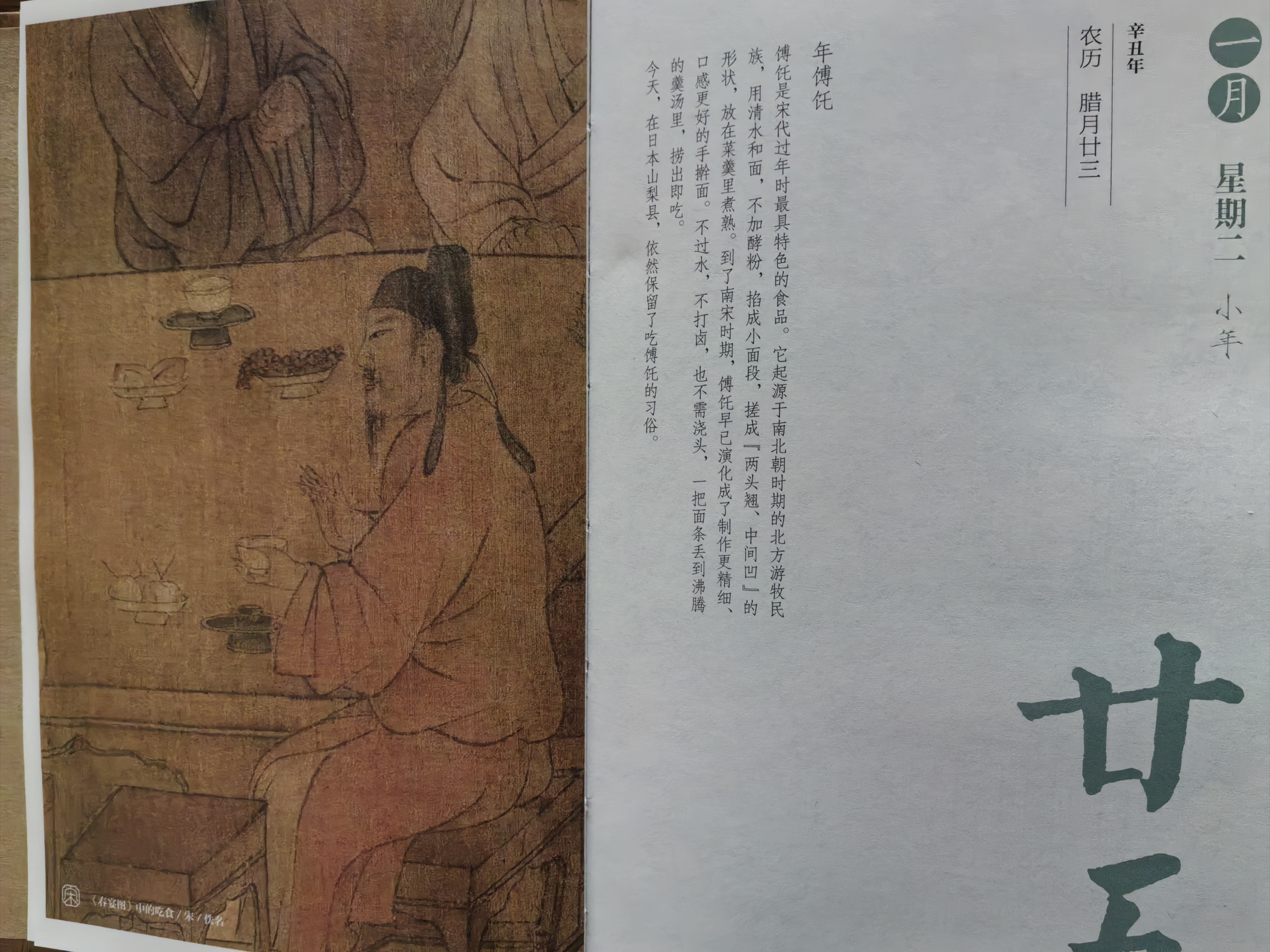 年馎饦:馎饦是宋代过年时最具特色的食品。它起源于南北朝时期的北方游牧民族,用清水和面,不加酵粉,拍成小面段,搓成『两头翘、中间凹』的形状,放在菜羹里煮熟。到了南宋时期,馎饦早已演化成了制作更精细、口感更好的手擀面。不过水,不打卤,也不需浇头,一把面条丢到沸腾的羹汤里,捞出即吃。今天,在日本山梨县,依然保留了吃馎饦的习俗。