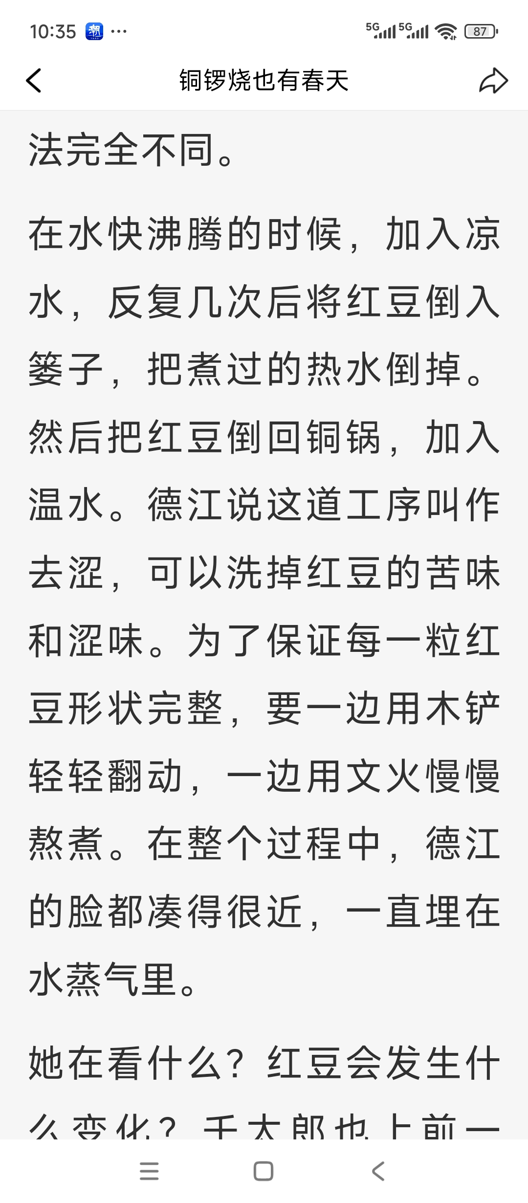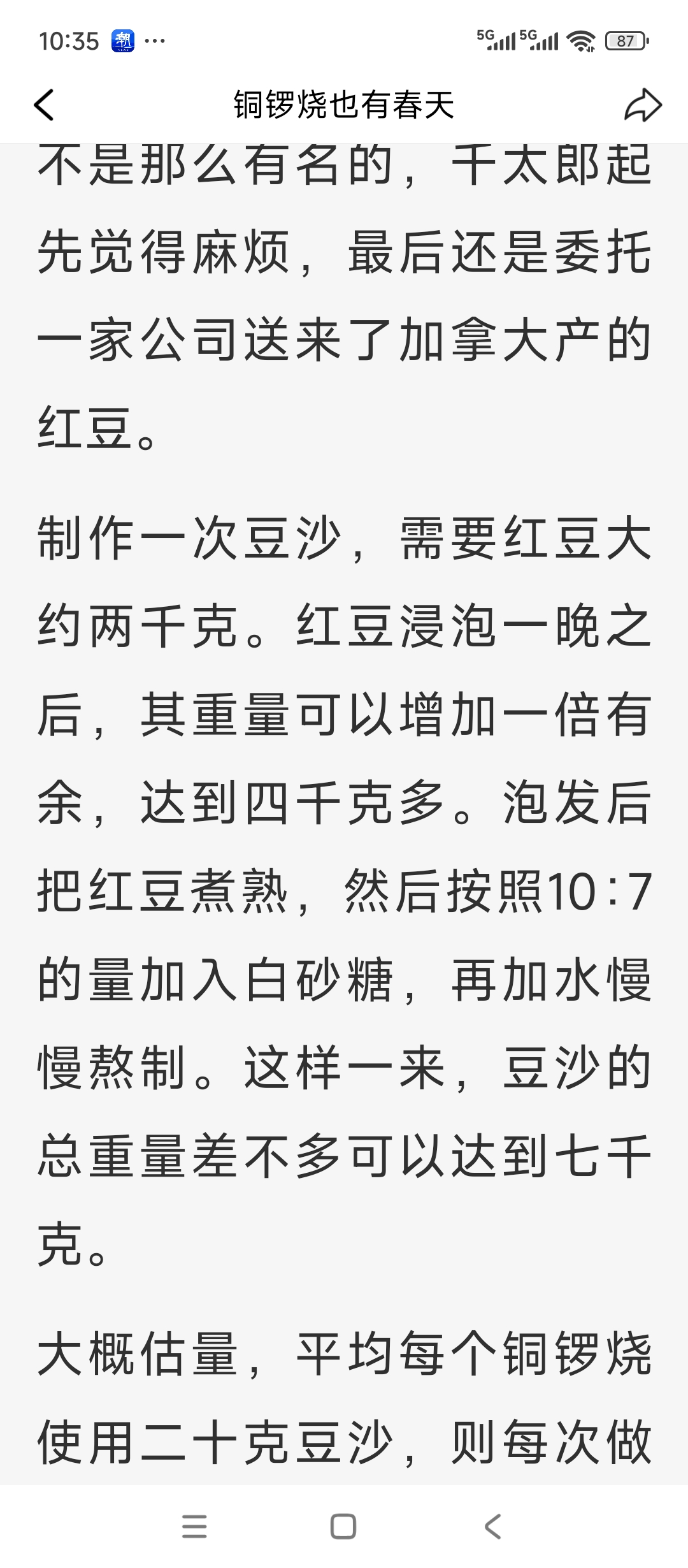 顺便看了一本日本的《铜锣烧也有春天》,日本人的文字简单易懂,生活气息浓重,而且属于慢生活的表现。 今天意外看到了豆沙的制作。吃过用豆沙制作的食物,有春卷、包子、八宝饭等,大多颜色偏深,口感甜腻,吃不多。不过,春节去新丰小吃买了一斤豆沙,倒是有些与众不同。 首先是散装的,不像超市卖的是塑料包装,包装上还会写配料表,难免有防腐剂成分。新丰的豆沙是散装称好的,就放在普通食品塑料袋里,平日里买包子的袋子。 另外,颜色也不像普通的那么黑,就是豆沙的颜色,偏淡一点色泽。 最后是口感,入口就满满的赤豆味道,没有那么甜腻,比较爽口香甜,用它做春卷和包子,一咬开就有烫烫的豆沙汁水流出来。 正像书中阿婆说的那样,豆沙要用心思做。其他东西也一样。