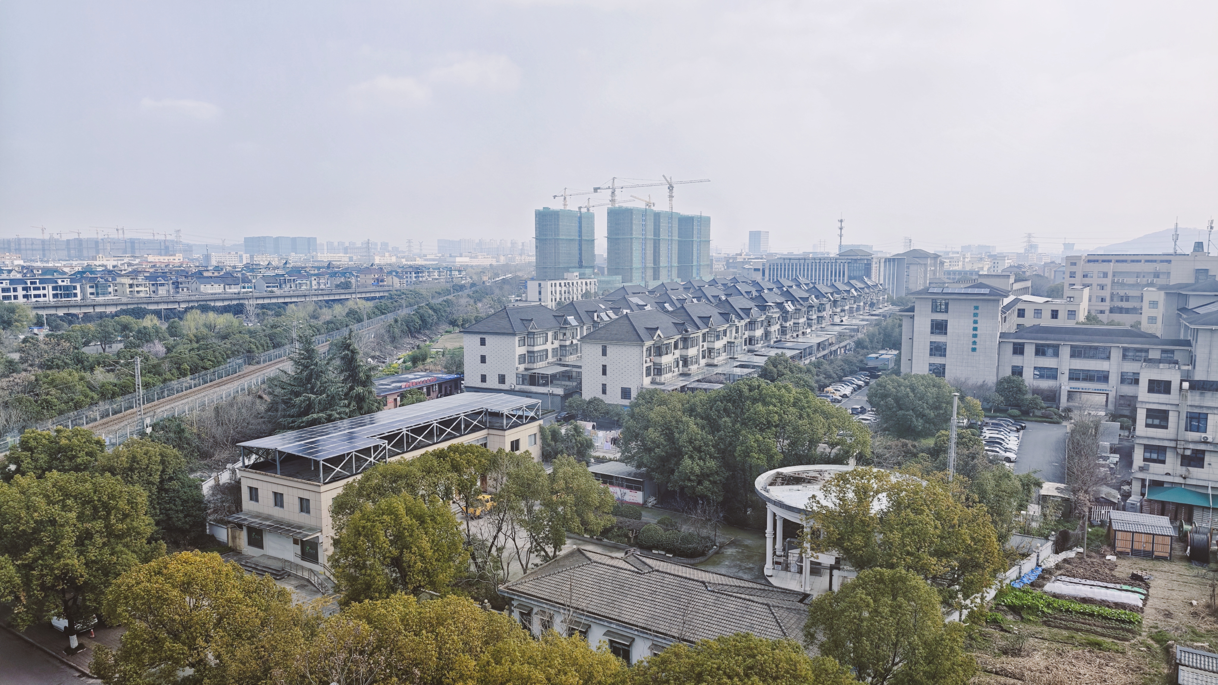 薄雾漫过天际线,老楼的黛瓦与新楼的绿网在风里遥遥相望。铁轨藏在树影间,载着日子往远方去,近处的菜畦与停满车的院落,是生活最踏实的注脚。
