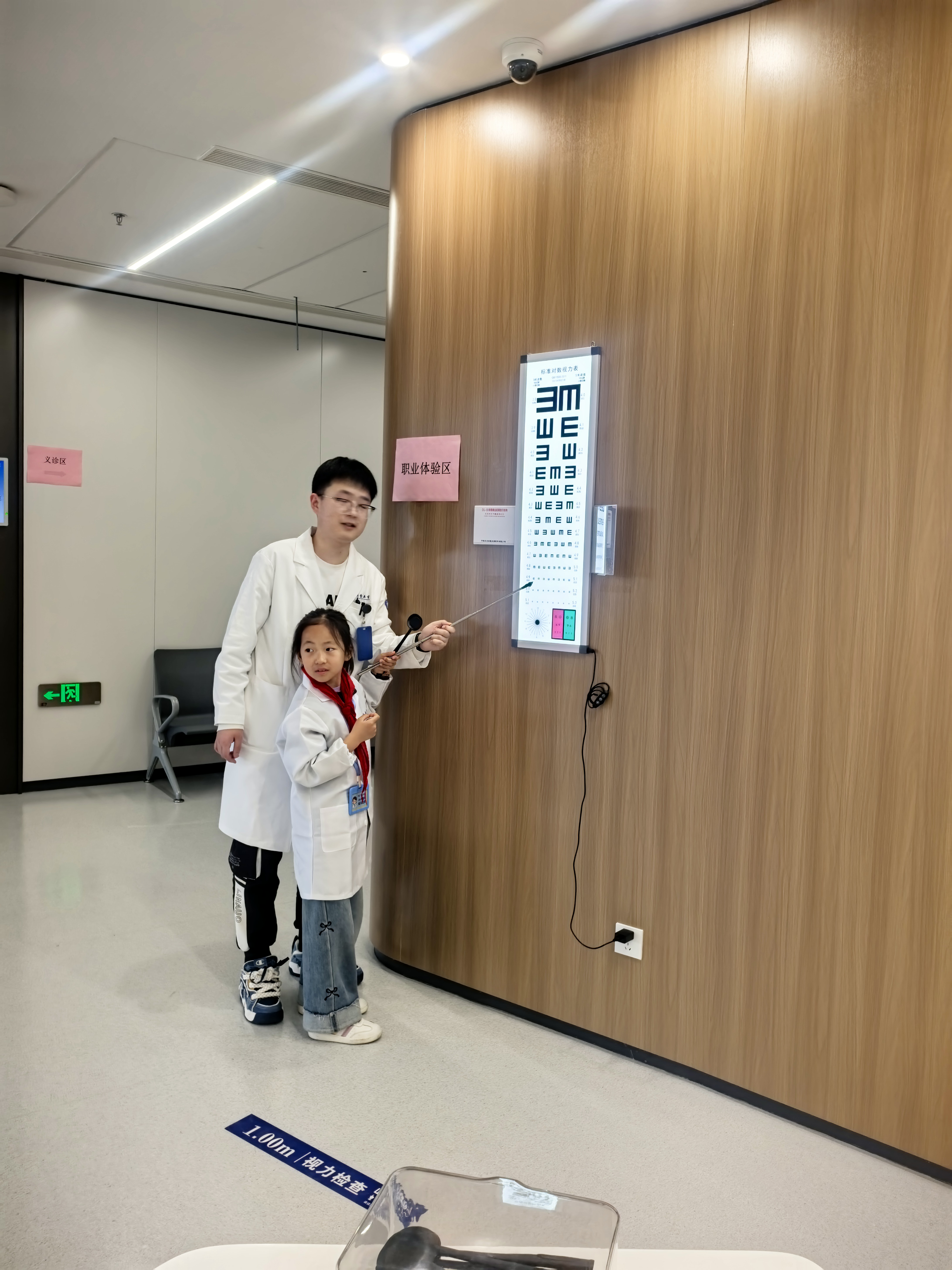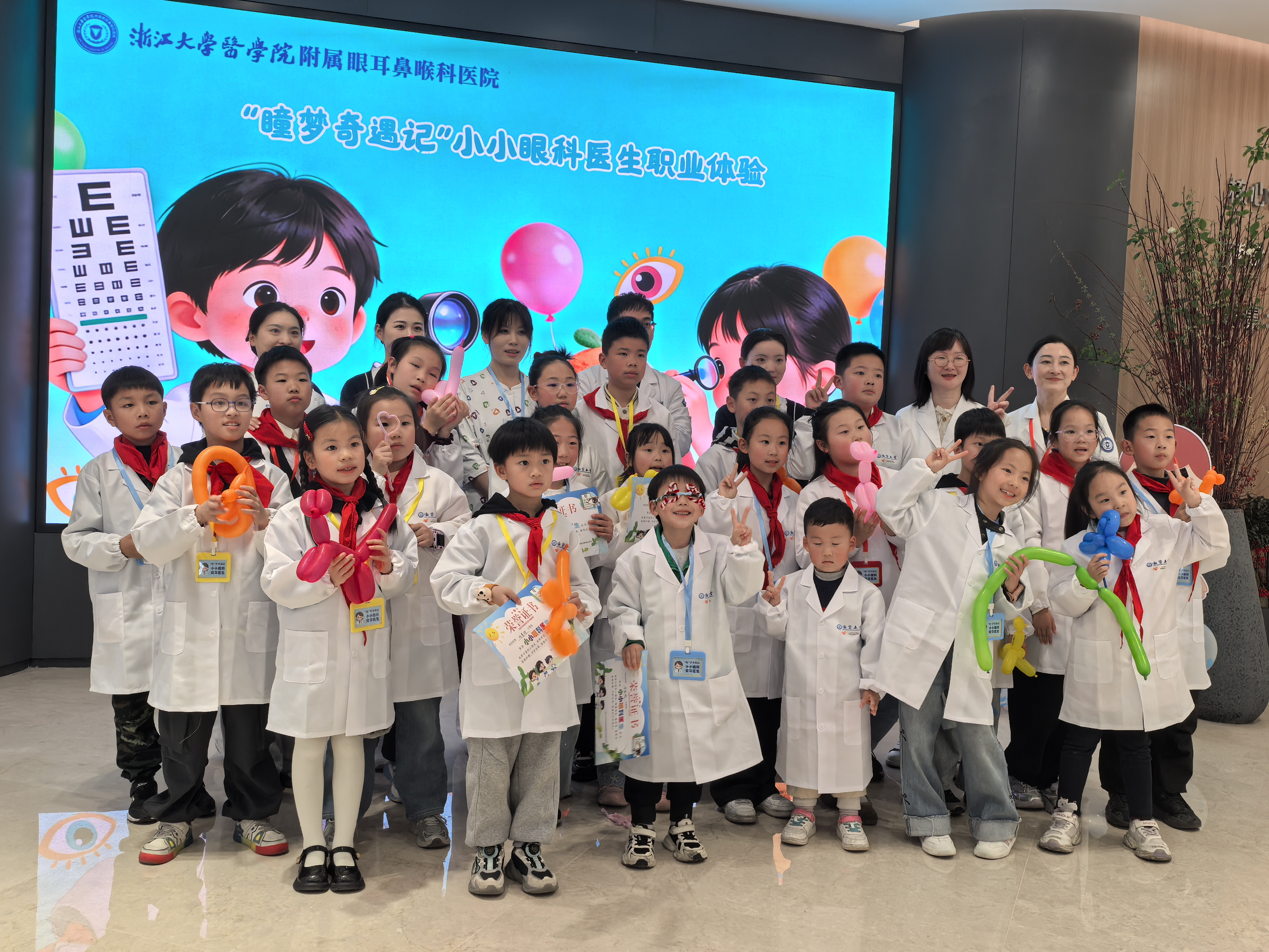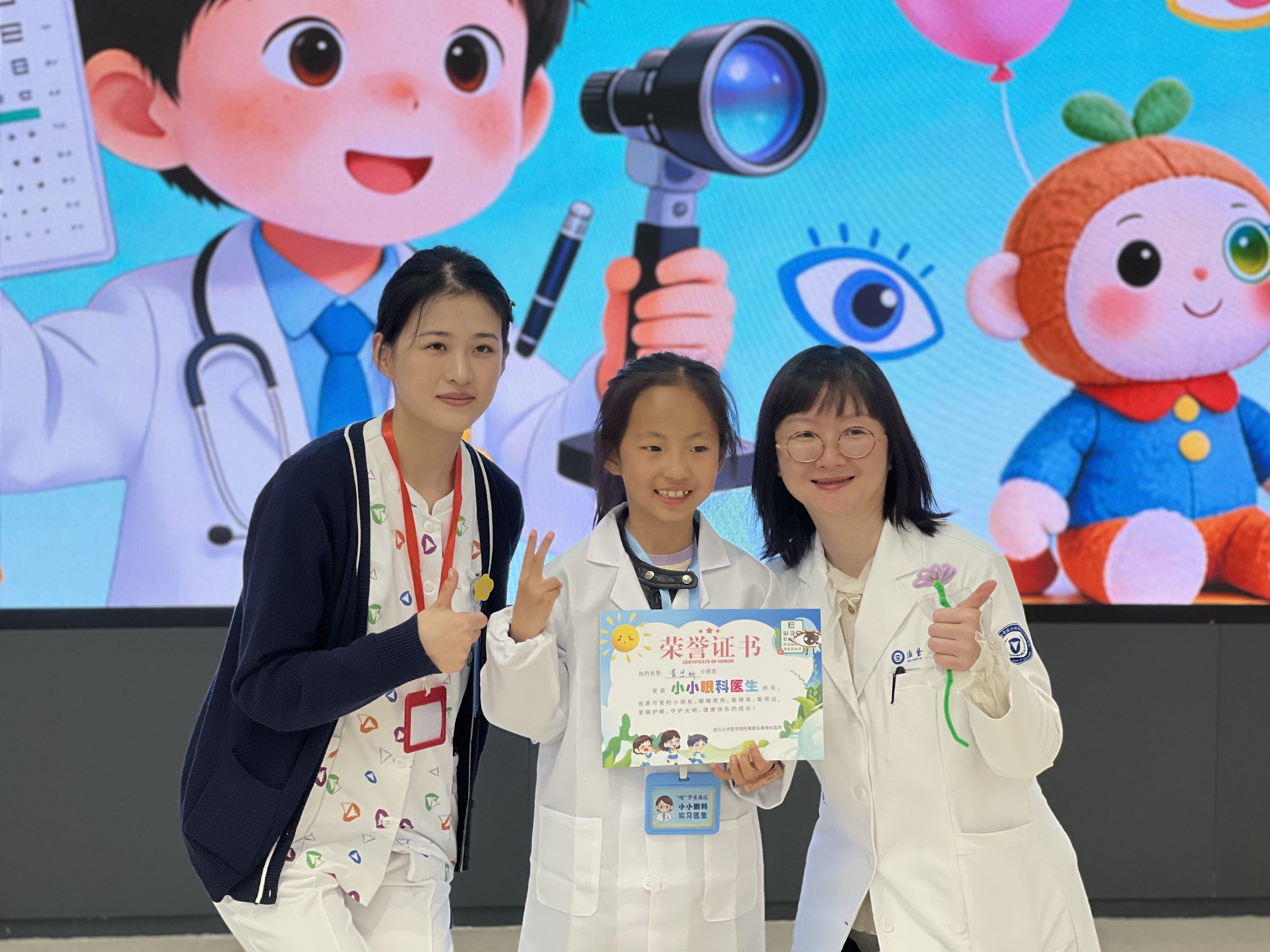 今天我穿上白大褂,变成了一名超酷的“小小眼科医生”! 在浙江大学医学院附属眼耳鼻喉科医院里,医生老师用有趣的动画给我们讲眼睛的秘密,我知道了角膜、视网膜这些“小零件”是怎么帮我们看世界的,还学到了干眼症会让眼睛又干又痒,原来长时间玩手机真的会伤害眼睛! 我还亲手给小伙伴测了视力,指着视力表上的“E”字,像模像样地当起了“小医生”。手工课上,我用彩色扭扭棒做了一副独一无二的眼镜,戴在脸上特别神气! 最后,我拿到了“小小眼科医生”的荣誉证书,心里美滋滋的。这次体验让我明白,眼睛是我们的“小窗户”,以后我要好好爱护它,还要提醒爸爸妈妈和同学一起科学护眼! 杭州公益小天使:查思妍
