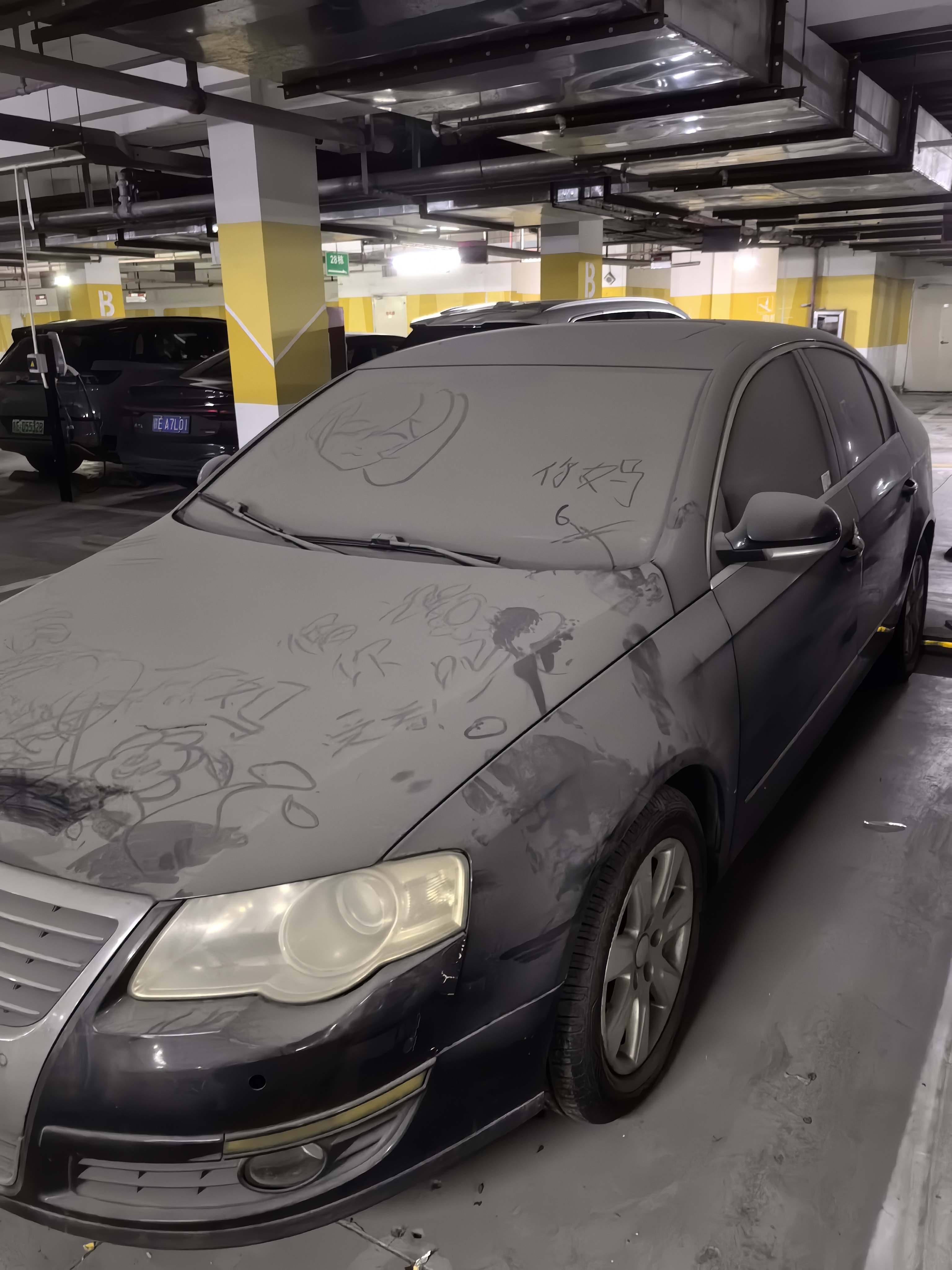 这满是灰尘的车身,就像一张被时光遗忘的画布,那些随性的涂鸦反倒成了最独特的注脚。